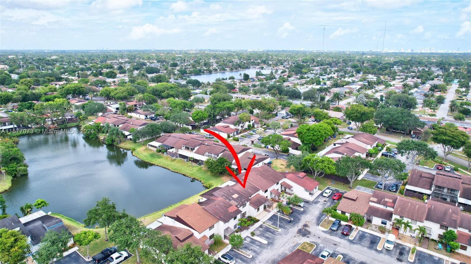 Back on Market, family situation stopped the buyer from moving forward. Beautifully maintained 2 bedroom/2 bath townhouse located just minutes from the Hardrock Stadium. The secondary bedroom and bathroom are located on the first floor while the primary bedroom encumbers the entire second floor. Entertain or just enjoy your morning coffee on the large, enclosed patio that overlooks the lake. The kitchen is equipped with upgraded LG stainless steel appliances. 2 reserved parking spots are located directly in front of your unit.