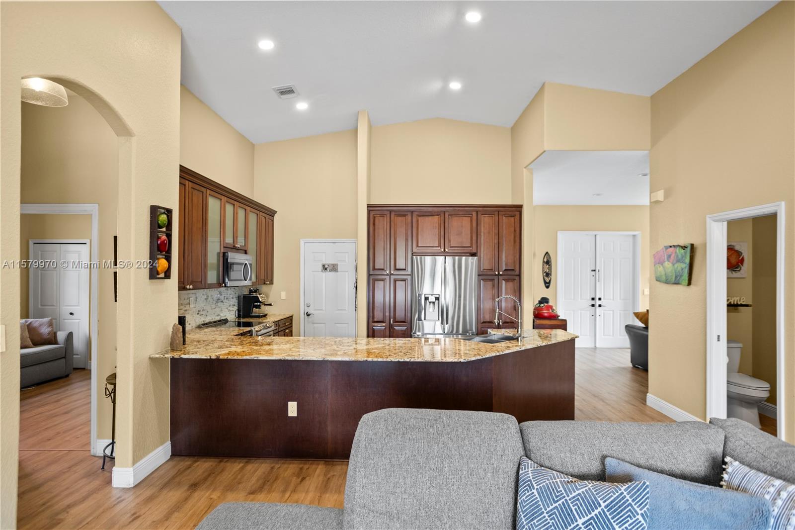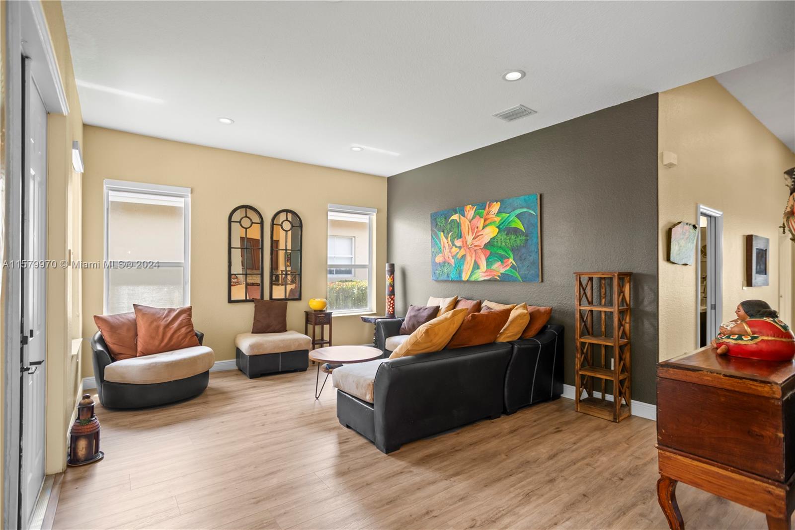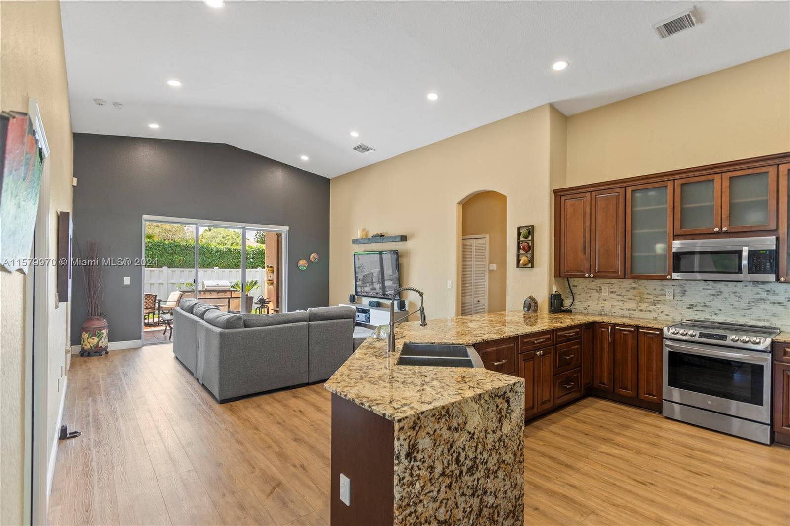 Just bring a toothbrush-move right into this 1 story home in gated community. Open, spacious & completely renovated. Beautiful flooring throughout, gourmet kitchen w/wood cabinets, cabinet pull outs, waterfall countertop & newer stainless appliances- formal living & dining rm & sep large fam room which is great for entertaining. Owners suite w/double closets w/built ins & beautifully upgraded en-suite bath complete w/double sinks, shower & soaking tub. Other home features tankless H2O heater, newer AC, zebra & blackout window treatments, & complete hurricane protection. Enjoy relaxing outside on oversized patio & fully fenced yard w/Avocado tree. Circular paver driveway for extra parking. Gated community, walk to elem school in community, close to shopping and major roads (I-75 & turnpike)