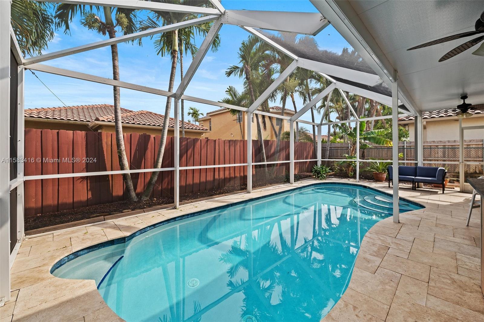 GORGEOUS SINGLE STORY HOME WITH SCREENED-IN SWIMMING POOL PERFECT TO STAY COOL IN THIS HOT SUMMER! FEATURING NEW DIAMOND BRIGHT FINISH AND ELEGANT TRAVERTINE FLOORING. INSIDE, INDULGE IN THE SEAMLESS FLOW OF PORCELAIN WOOD FLOORS THROUGHOUT, ADDING WARMTH AND SOPHISTICATION TO EVERY ROOM. COMPLETELY REFRESHED WITHIN THE LAST 24 MONTHS, THIS HOME IS THE EPITOME OF MODERN ELEGANCE. SOLAR PANNELS FOR POOL & NEWER POOL HEATER, UPGRADED TILE FLOORING THROUGHOUT THE LIVING AREAS, ELEVATING THE AMBIANCE OF EACH SPACE. EXPERIENCE LUXURY IN EVERY DETAIL WITH METICULOUSLY UPGRADED BATHROOM FIXTURES AND STUNNING POOL SCREENINGS. DELIGHT IN THE UPGRADED KITCHEN FEATURING GRANITE COUNTERS AND A BEAUTIFULLY CRAFTED BACKSPLASH, ADDING BOTH STYLE AND FUNCTIONALITY TO YOUR CULINARY HAVEN.