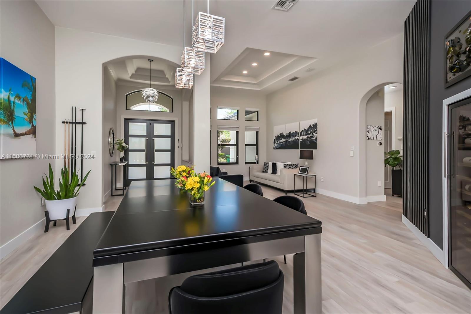 Beautiful single-story lakefront home in the quiet gated community of Grand Isles in Sunset Lakes! This 5-bedroom, 3-bath home features renovations inside and outside, including hurricane impact windows/doors, roof, flooring, A/C, driveway, pool pavers, and more. It features high-end finishes, renovated gourmet kitchen with quartz countertops, stainless-steel appliances, and spacious 12-foot ceilings. The fenced-in backyard has stunning lake views and beautiful salt-water pool perfect for unwinding and entertaining. Other features include a modern pool table that converts to a sleek dining table, integrated EuroCave Pro wine fridge, and an amazing luxurious spa-like primary bathroom! Make this bright and spacious turn-key retreat your new home.