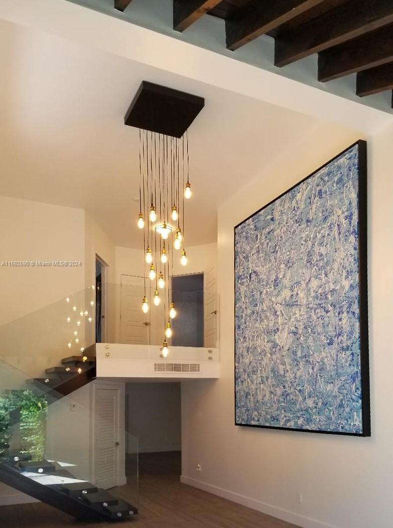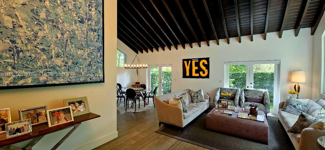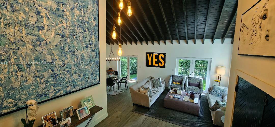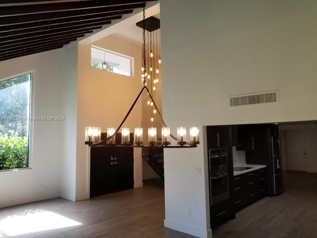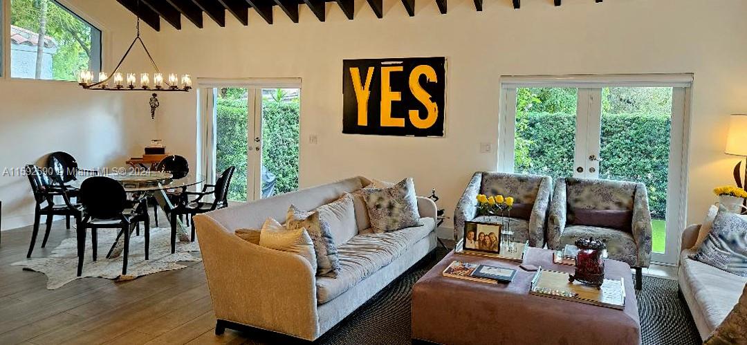 Contemporary modern style 2 story home in Coral Gables. Completely remodeled 3Beds/3full baths. Extremely high ceilings with wood beams greet you. House offers formal living and dining areas plus an open concept modern kitchen. Custom electric high-end blinds and plantation shutters. House has impact windows and doors and a one-car garage. One-bedroom plus full bathroom is on the first level. Floating contemporary stairs with glass railing lead you to the second floor where the other 2 bedrooms/2 bathrooms are located. House has lots of custom closets plus custom wall built-in extra drawers and shelves. House is located on a corner lot. 2019 Roof with a transferable warranty. Minutes from Miracle Mile, shopping, restaurants, and great schools.