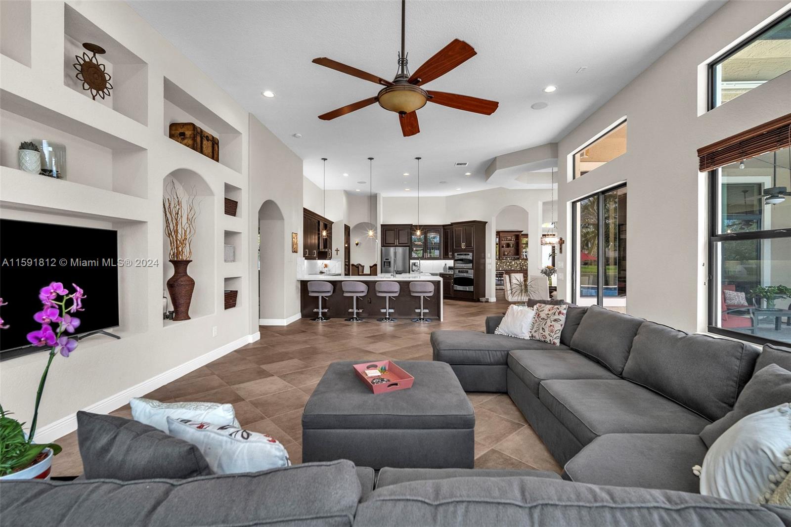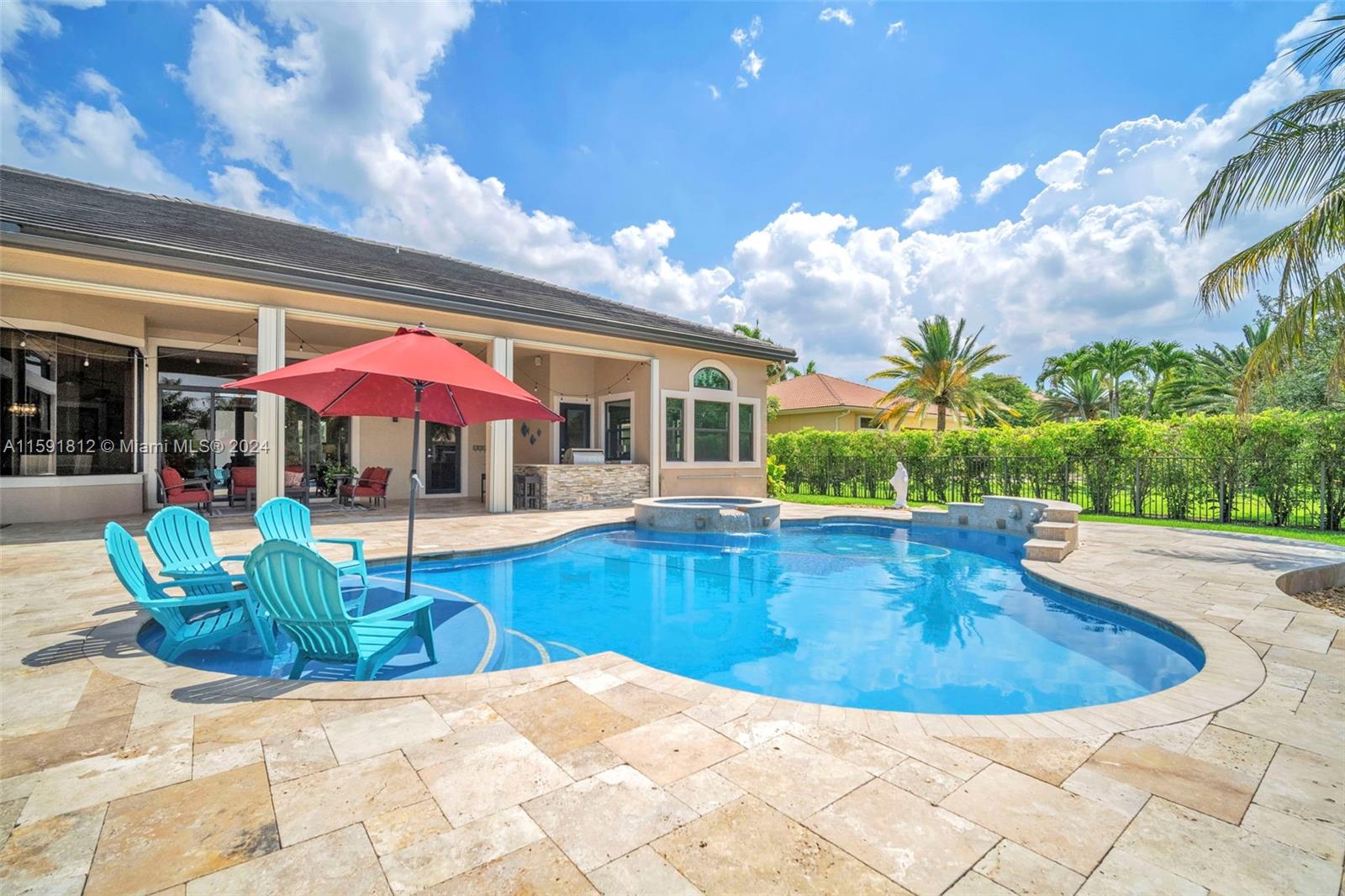 Welcome to the epitome of luxury living in the prestigious gated community of Riverstone. This stunning estate boasts breathtaking lake views and an array of unparalleled amenities. The open floor triple split plan blends sophisticated elegance with modern comfort, featuring a renovated kitchen w/ SS appliances. Entertain in grand style in the formal dining room or retreat to the outdoor oasis and find a pristine pool w/ jacuzzi, summer kitchen, fire pit, & tiki hut. The master suite is a sanctuary with his/hers bathrooms. This home also includes a movie room, office, gym, and bonus room. Roof and impact windows installed 2022. Situated in the heart of Davie where equestrian life is celebrated & surrounded by fine dining & shopping. This property is more than a home; it’s a lifestyle.