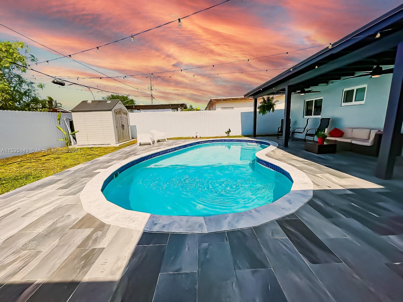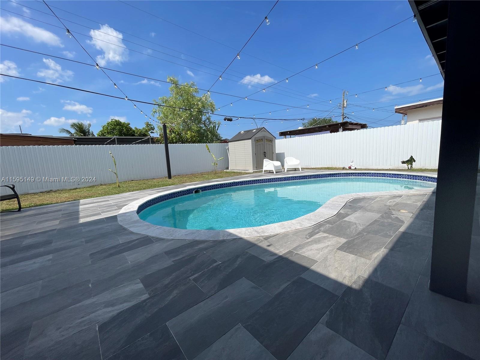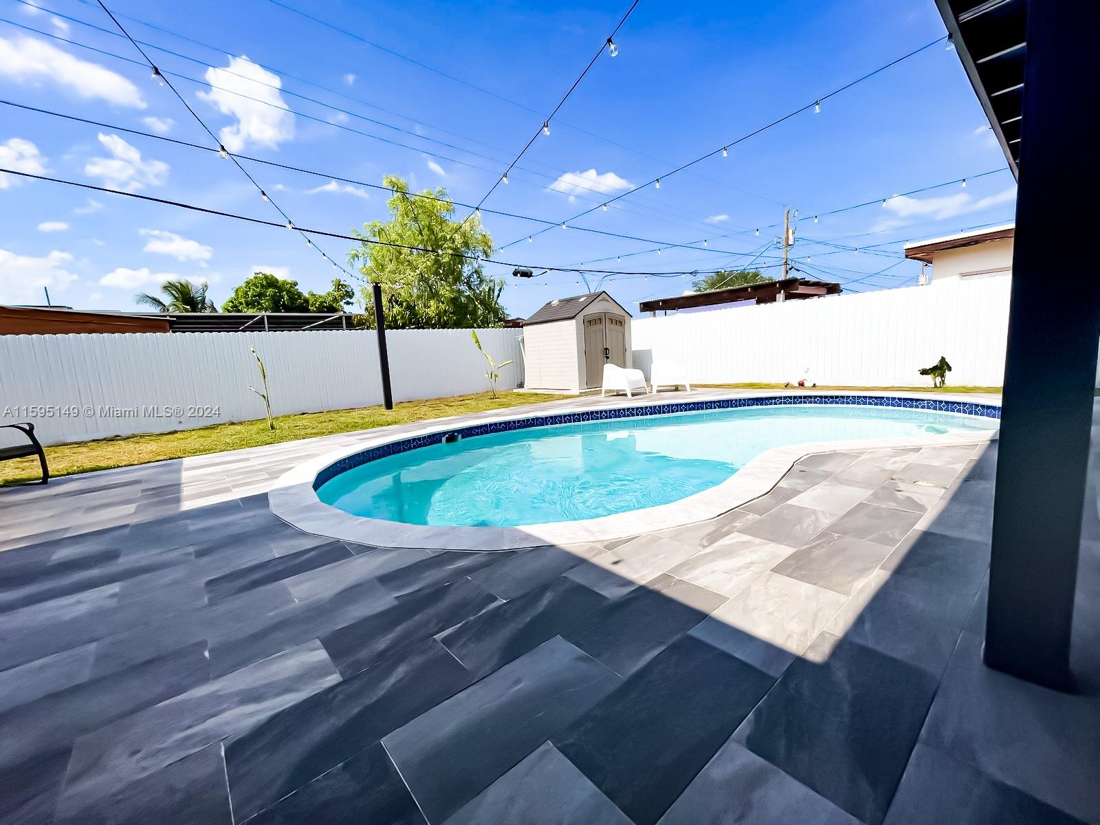 Welcome to your South Florida Dream Home! This Lovely & Spacious 4 bedrooms 2 Baths remodeled Single Fam. Home offers a Tranquil, breathtaking pool & backyard area. The Granite countertop kitchen has newer stainless steel appliances (NO dishwasher) Ceramic tiled flooring throughout, New 3.5 tons A/C, Hurricane rated impact windows and doors (except 1 window and door), tankless Titan water heater, New pool deck and exterior ceiling fans. Nice Travertine marble tiles in master bathroom shower. Spacious large circular driveway parks 7-8 cars. New backyard aluminum white fence and convenient storage shed.