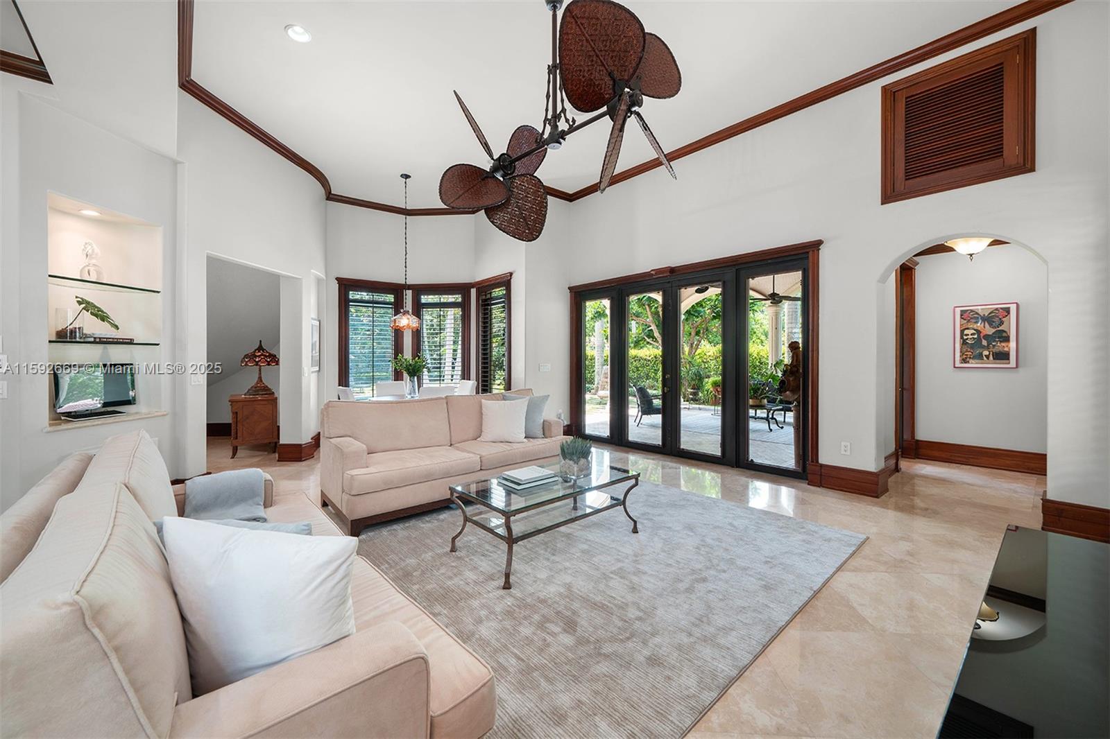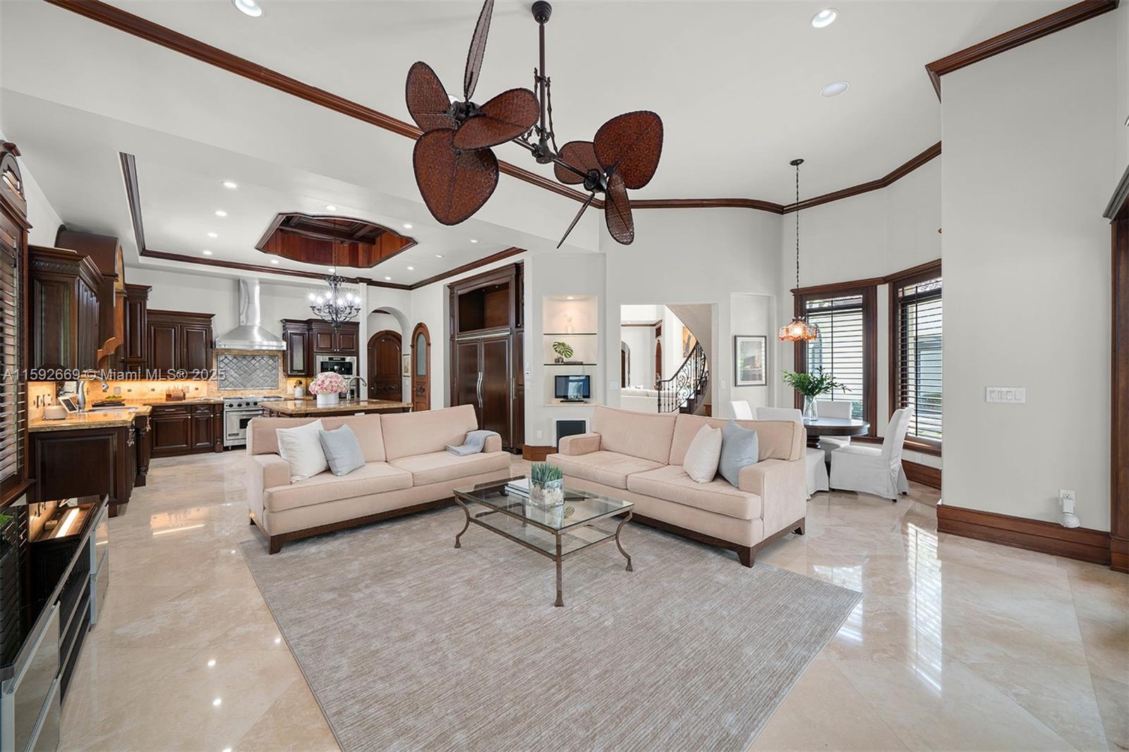 Welcome to this custom 2-story Coral Gables residence. The grand entrance ft. a charming garden w/ a fountain, leading to a majestic front door. Inside, high ceilings & a chandelier greet you to a dining & living area with a fireplace, made w/ hand-crafted natural stones, walnut, & cedar finishes. The space includes a wet bar, wine cellar, & an office/entertainment rm. The expansive kitchen, w/ wood cabinets & marble countertops, opens to a family rm. The laundry rm connects to an in-law suite w/ a bathrm. The secluded primary suite offers a wet bar, a sitting area, private access to the lush backyard, & a bathrm w/ stone finishes, a hidden shower, & vanity. Upstairs, 3 bedrms ft walk-in closets, ensuite bathrms, & balcony access. The backyard ft. a pool, jacuzzi, sauna, & a 3-car garage.