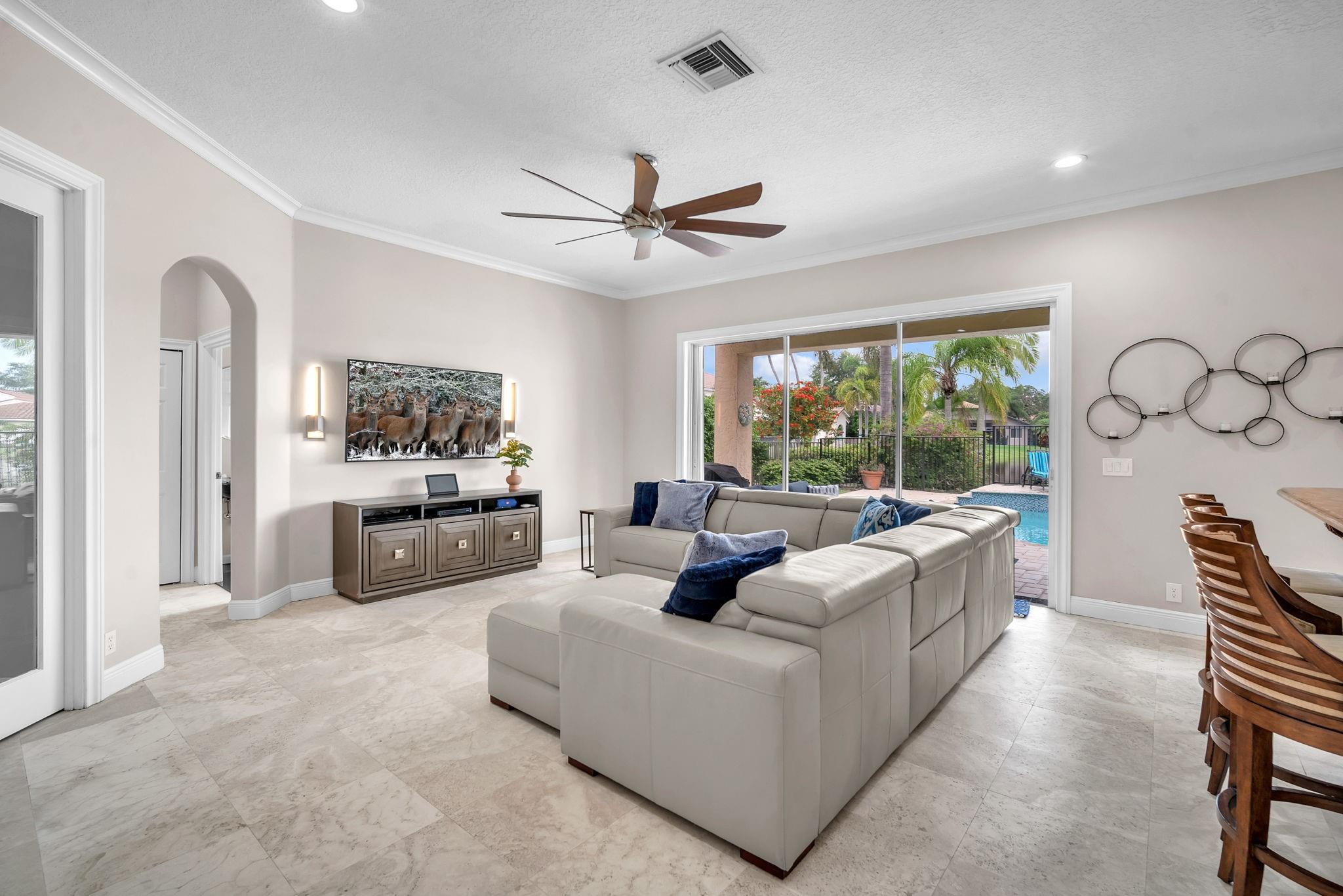 This luxurious 5 bedroom, 3.5 bathroom home is located in the prestigious Weston Hills. It sits on a quiet cul-de-sac street. Upon entering, you'll be greeted by a grand entrance and an impressive floor plan. The lower level has freshly polished travertine floors, the upstairs level has real hardwood flooring. The ample eat-in kitchen is a chef's delight, with upgraded stainless steel appliances and granite countertops. The roof was replaced in 2018 and the pool was recently refinished with fresh diamond-brite coating, new tile, and coping. The master bedroom is a true oasis with a relaxing balcony facing the breathtaking lake view. The upscale golf community of Weston Hills is located at the heart of Weston, renowned for its excellent schools, lush landscapes, and family-friendly living.