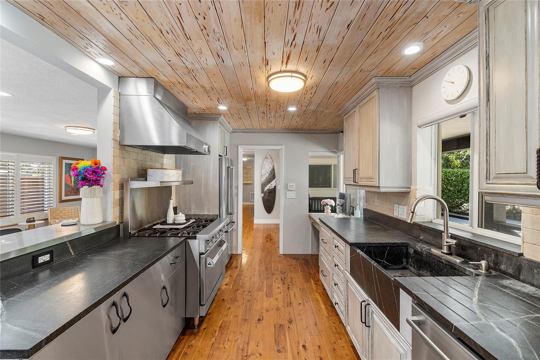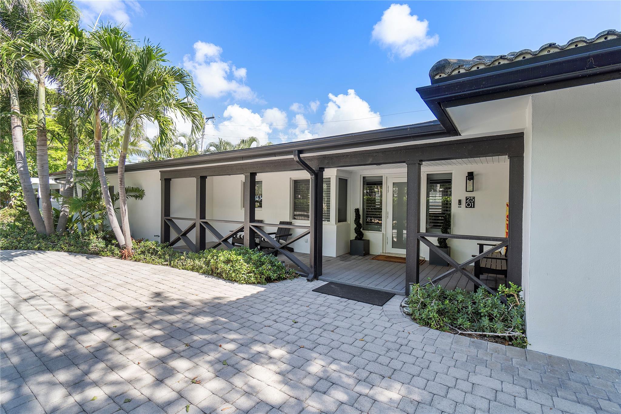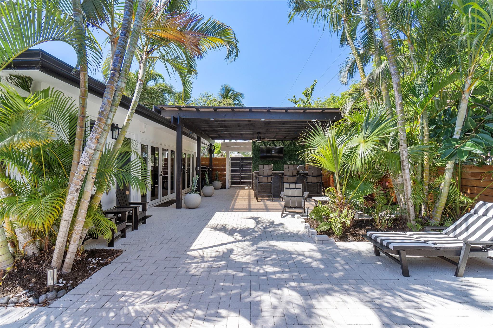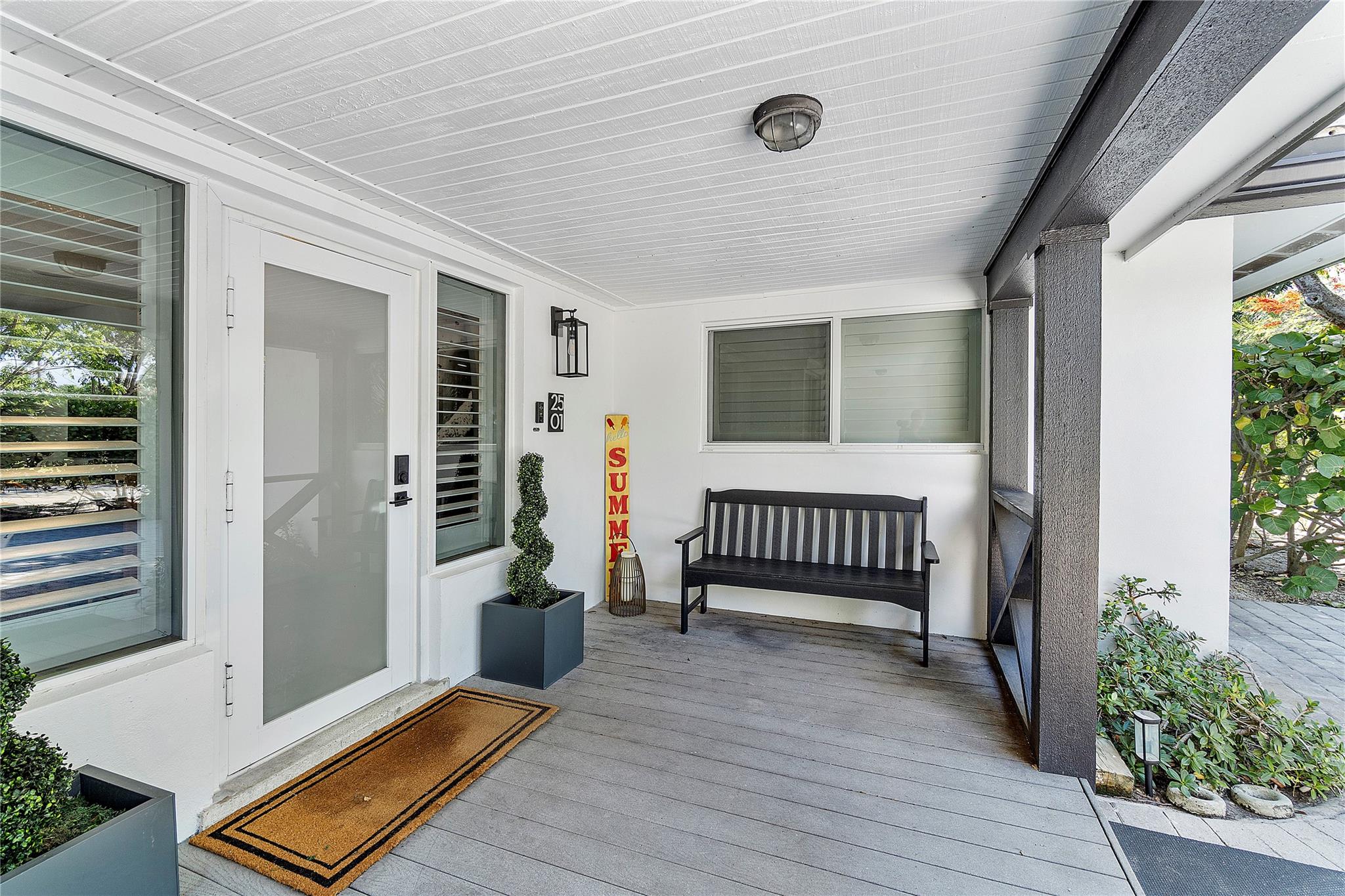Step into this breathtaking, coastal-style home with modern updates nestled on a spacious, corner lot just 1 mile to the beach! This 3/3 home has superb curb appeal and plenty of parking with a large open front porch. Newly re-designed backyard includes: custom pergola with color changing lights, TV, kitchen with built-in Napoleon grill, granite counters, over 2,000 sf of pavers, fresh turf, fence & landscaping. All bathrooms have been remodeled. Two additional rooms include an office plus a den that can serve as MIL suite. Additional features include a new flat roof installed 2024, indoor laundry room, Australian Cypress flooring, plantation shutters, new water heater and 22kW generator connected to natural gas. Prime location home on quiet street close to beaches, restaurants & shopping.