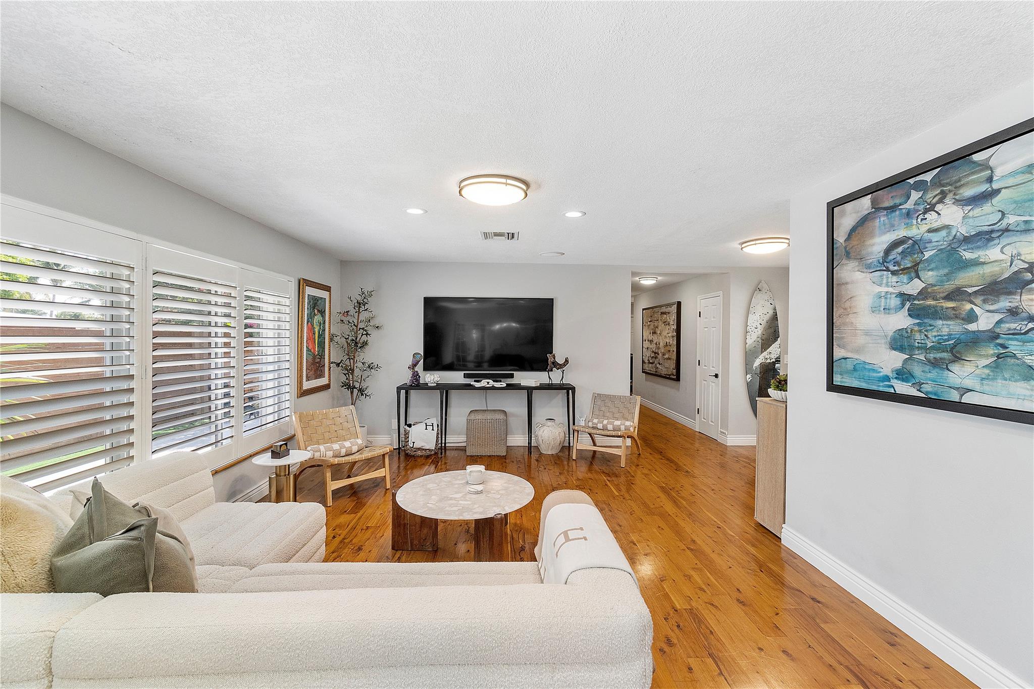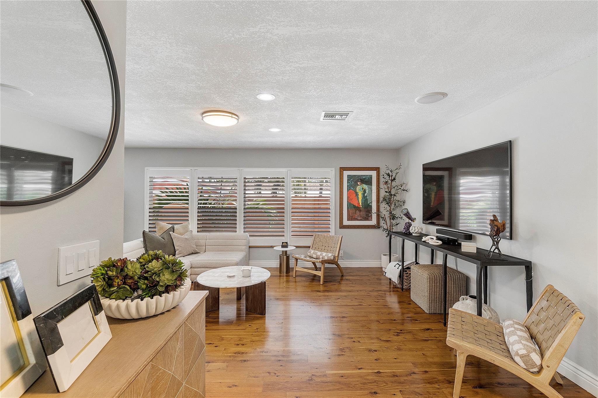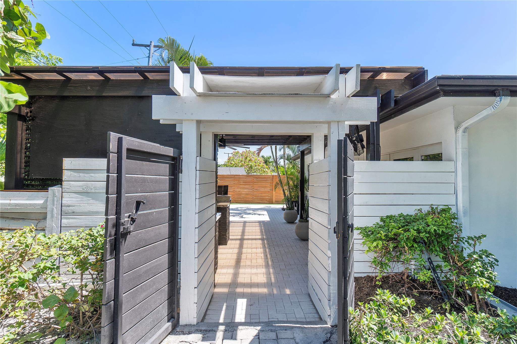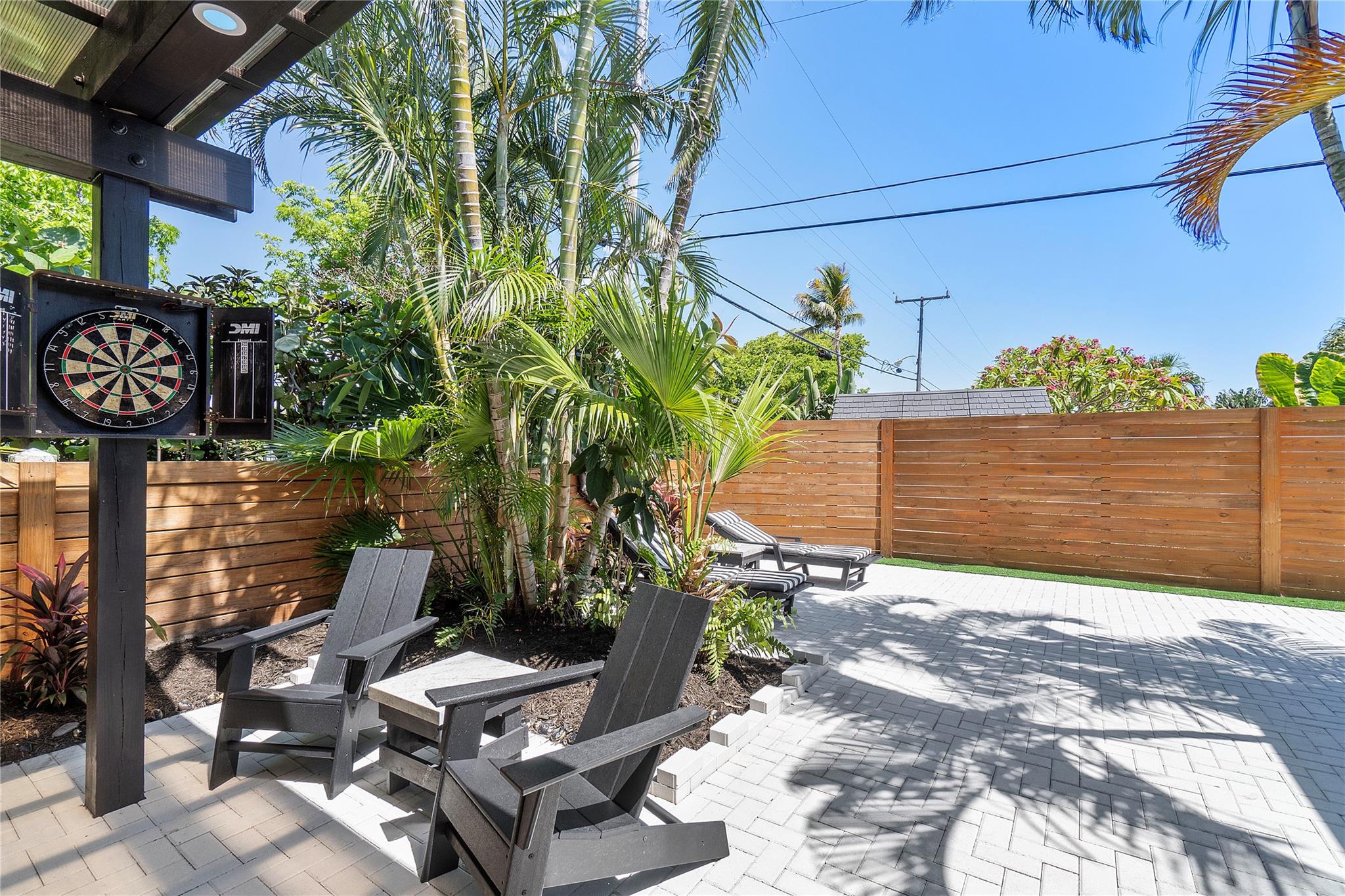 Step into this breathtaking, coastal-style home with modern updates nestled on a spacious, corner lot just 1 mile to the beach! This 3/3 home has superb curb appeal and plenty of parking with a large open front porch. Newly re-designed backyard includes: custom pergola with color changing lights, TV, kitchen with built-in Napoleon grill, granite counters, over 2,000 sf of pavers, fresh turf, fence & landscaping. All bathrooms have been remodeled. Two additional rooms include an office plus a den that can serve as MIL suite. Additional features include a new flat roof installed 2024, indoor laundry room, Australian Cypress flooring, plantation shutters, new water heater and 22kW generator connected to natural gas. Prime location home on quiet street close to beaches, restaurants & shopping.