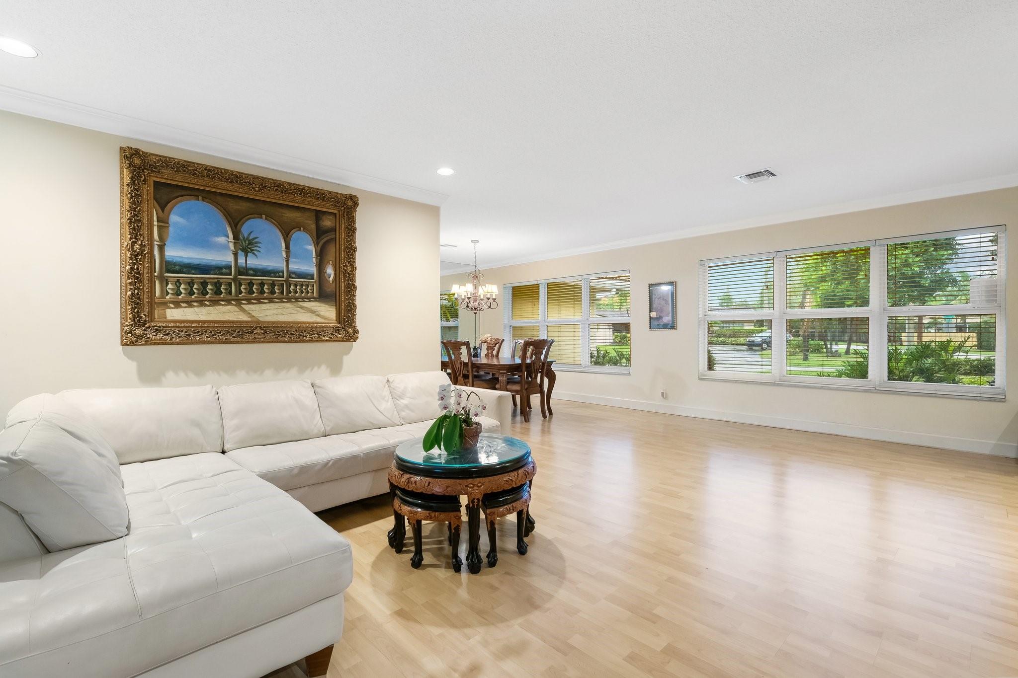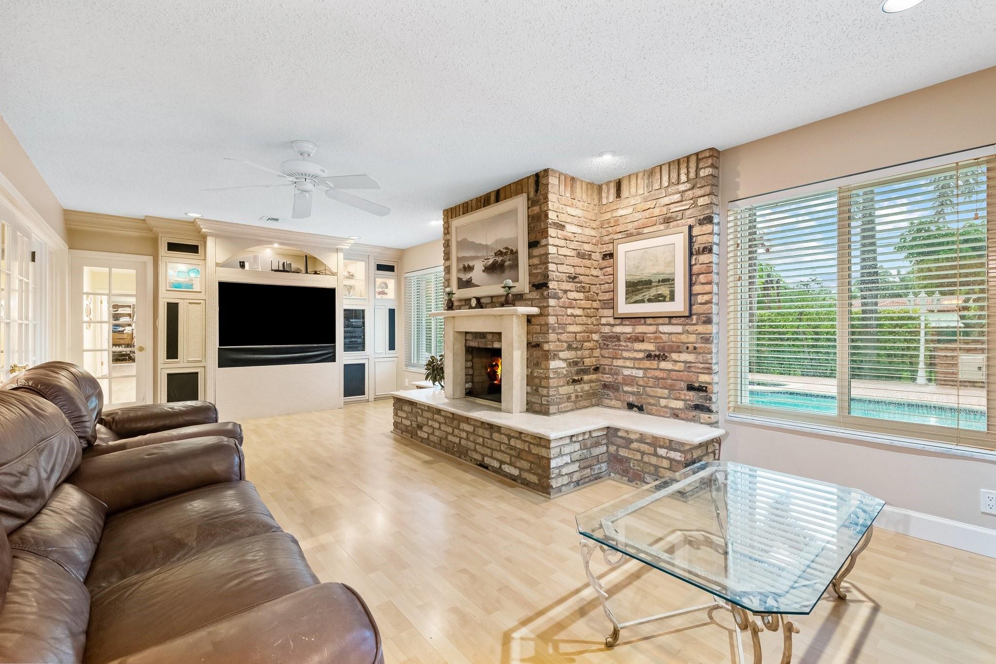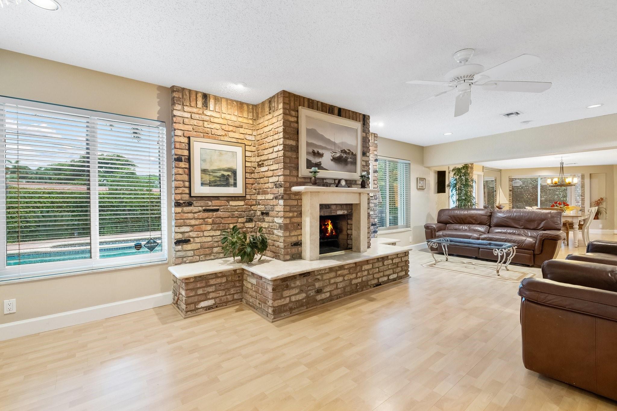 This home has it all - enormous house that was a former builder's model, incredible fenced & raised double corner lot, private pool, massive circular driveway & wonderfully landscaped in a great friendly neighborhood near desired amenities! The sprawling 4 bedroom, 4 full-bath house is smartly divided between open entertainment & private sleeping areas, with an energy efficient 2 zone air system separating the house. The inviting kitchen is loaded with counter space, storage, and a striking brick hearth over a double oven & gas stove. Other special features are the working wood-burning fireplace and the sliding interior doors throughout the house. Impact windows with Accordion shutters offer superior protection. The large 2-car garage contains extensive storage space & includes a workbench