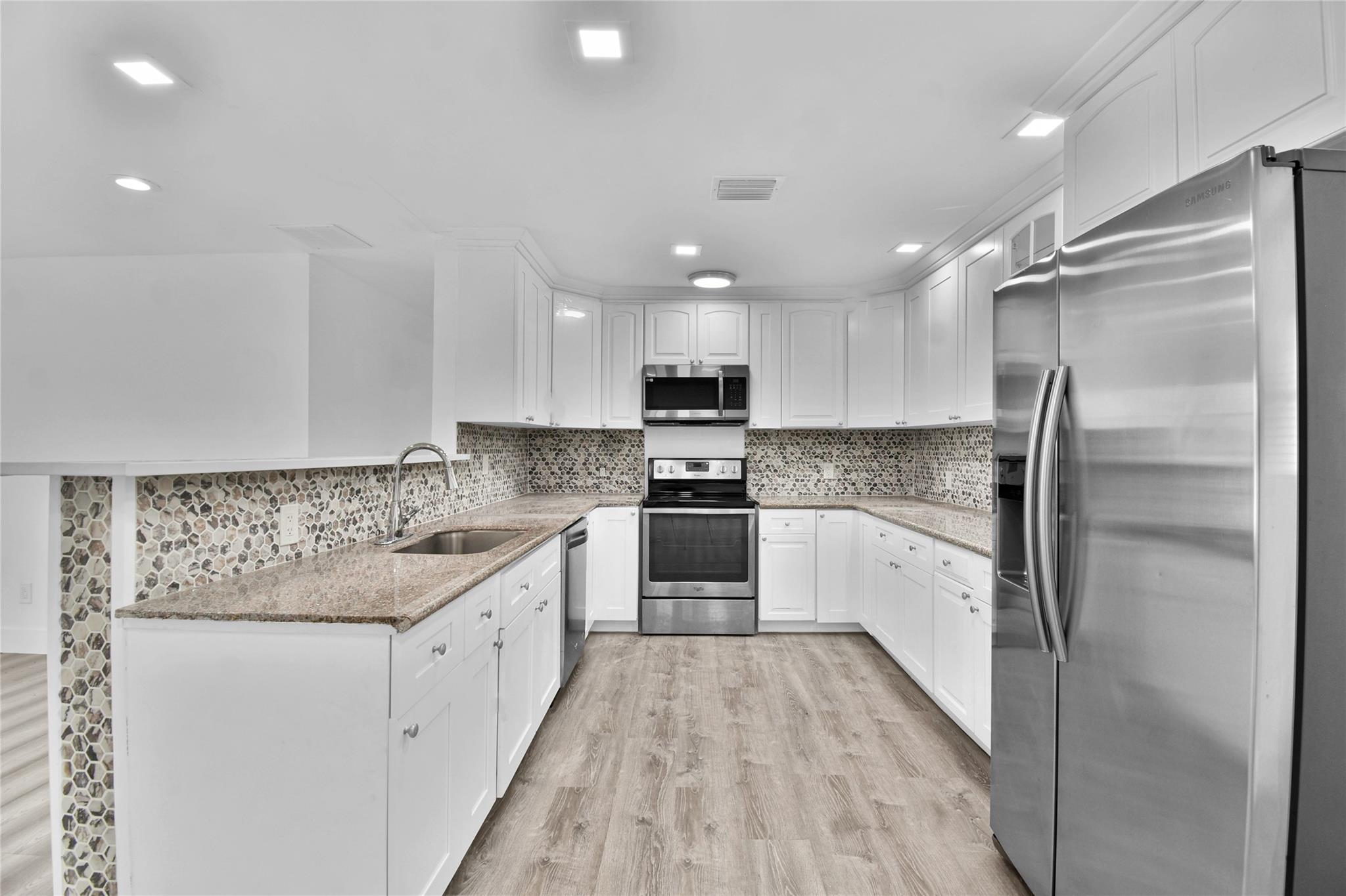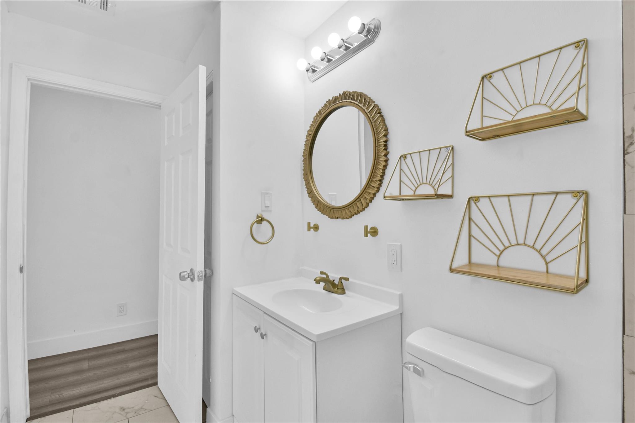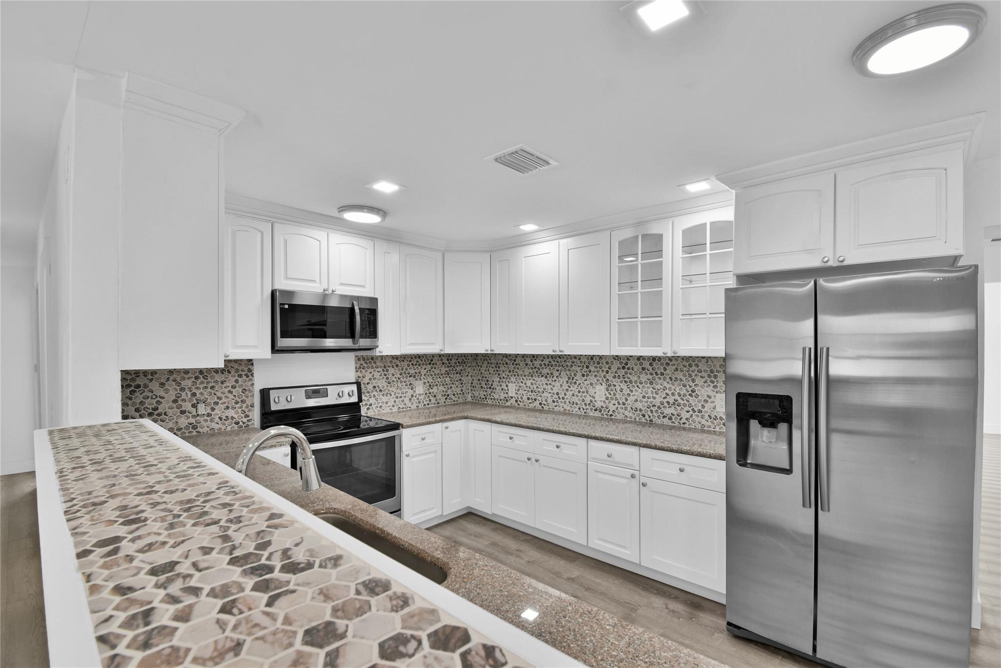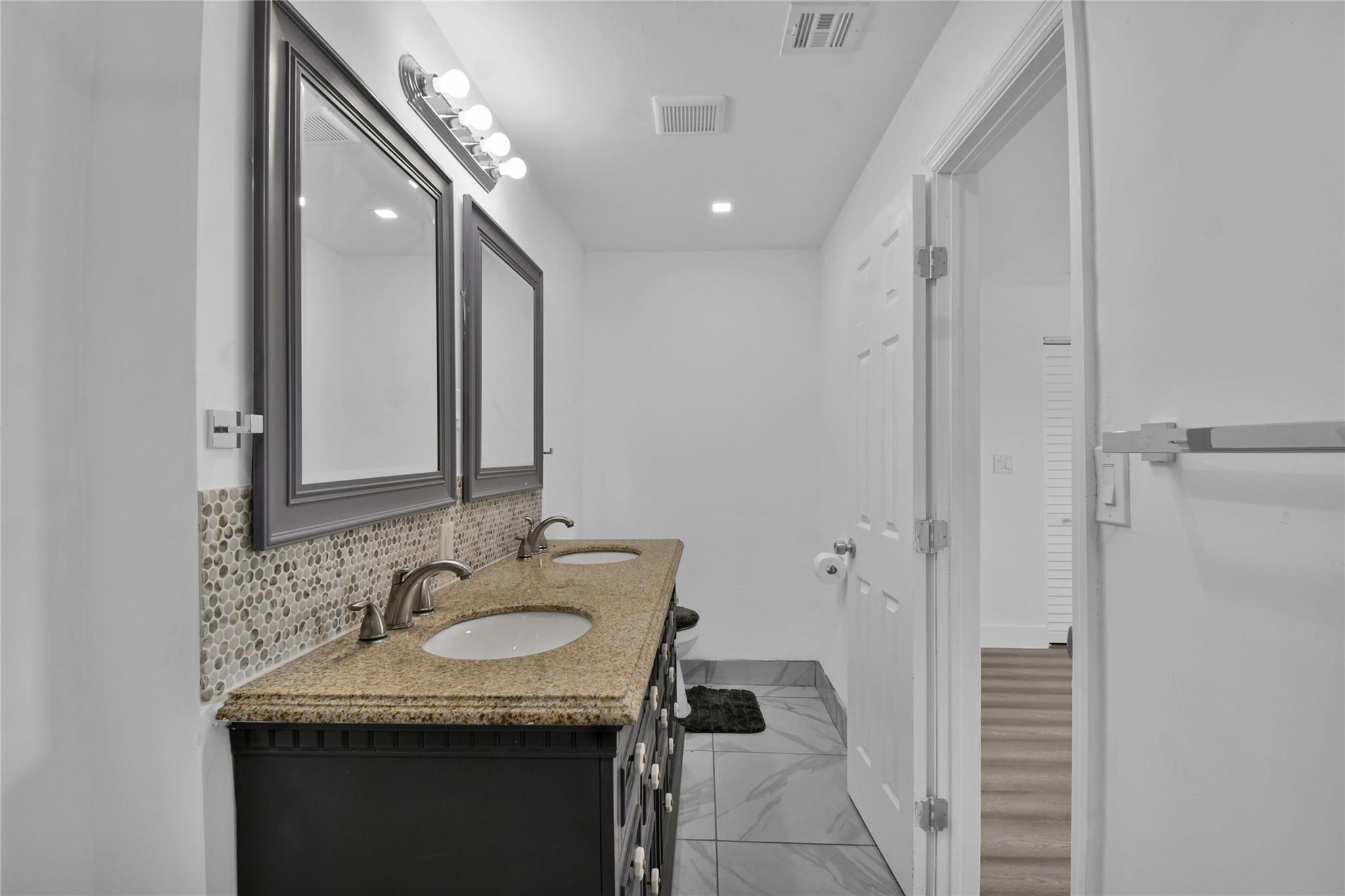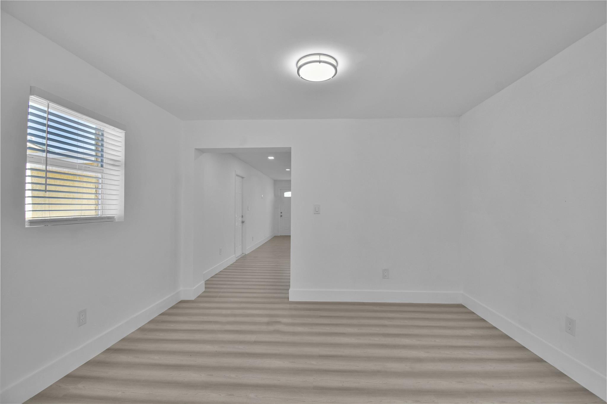 Newly renovated 3-Bed, 2-Bath home + Den with separate entrance that can be converted into a studio for extra income! Conveniently located near I-95 & Turnpike, just 13 minutes from Las Olas & 15 minutes from the beach with NO HOA or rental restrictions. Situated on a 6,800-sq ft fenced lot, this property boasts a serene backyard w/mango trees, ideal for entertaining & a 1-car garage equipped w/cabinetry for ample storage. The living area is accentuated by recessed lighting & distinct grey vinyl flooring. The kitchen showcases custom cabinetry, granite countertops, & stainless steel appliances. Enjoy spacious bedrooms and a distinctive guest bathroom w/marble-style tiles & gold accents. The sizable master bedroom features a luxurious en-suite bathroom with dual sinks and mirrors.