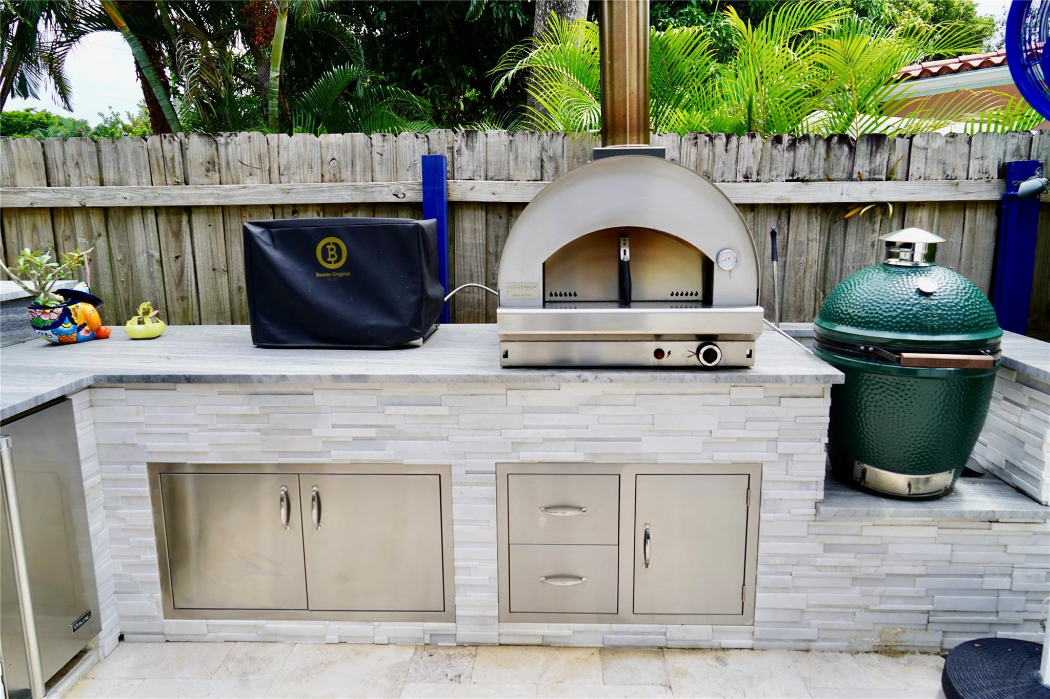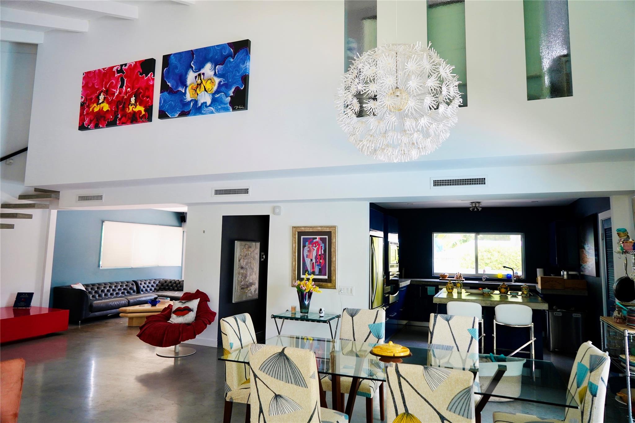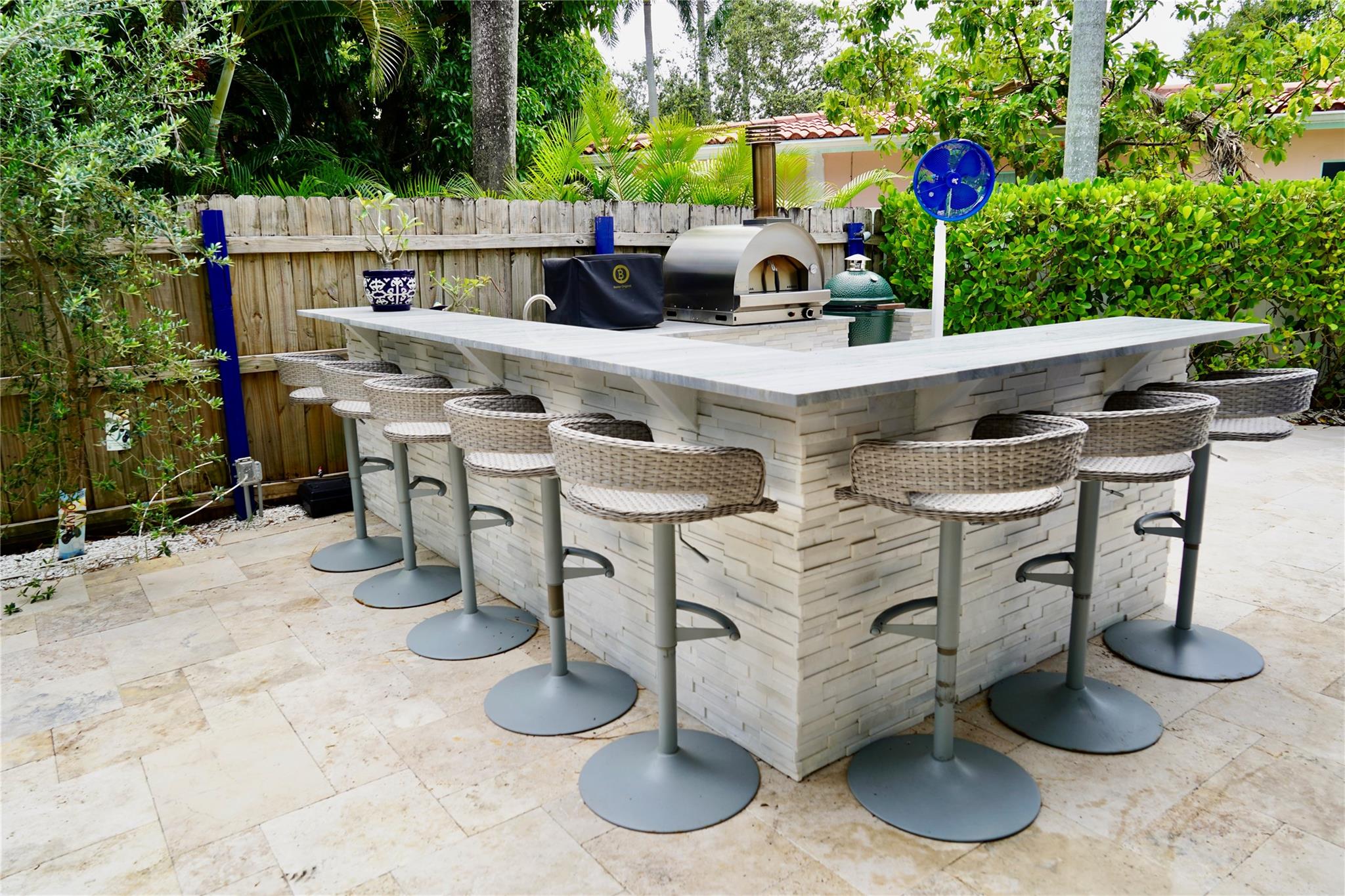 Entertainer's Delight. A professionally landscaped yard with a heated saltwater pool & spa. The outdoor area is the star with marble patio, LED lighting, misting fan & mosquito repel system, an automatic wind-sensing retractable awning. An outdoor kitchen with a large seating area. The mid-century modern design features soaring wood ceilings with painted beams. A magnificent staircase and an Italian kitchen. Large open space with vaulted ceilings. Upstairs features a master bedroom and bathroom with wood floors and an office/den/possible 3rd bedroom. The primary bedroom overlooks the gorgeous backyard with lots of windows and vaulted ceilings. Downstairs features a large bedroom with lots of light. All Impact windows & sliding doors, plus a large circular driveway situated on a corner lot.