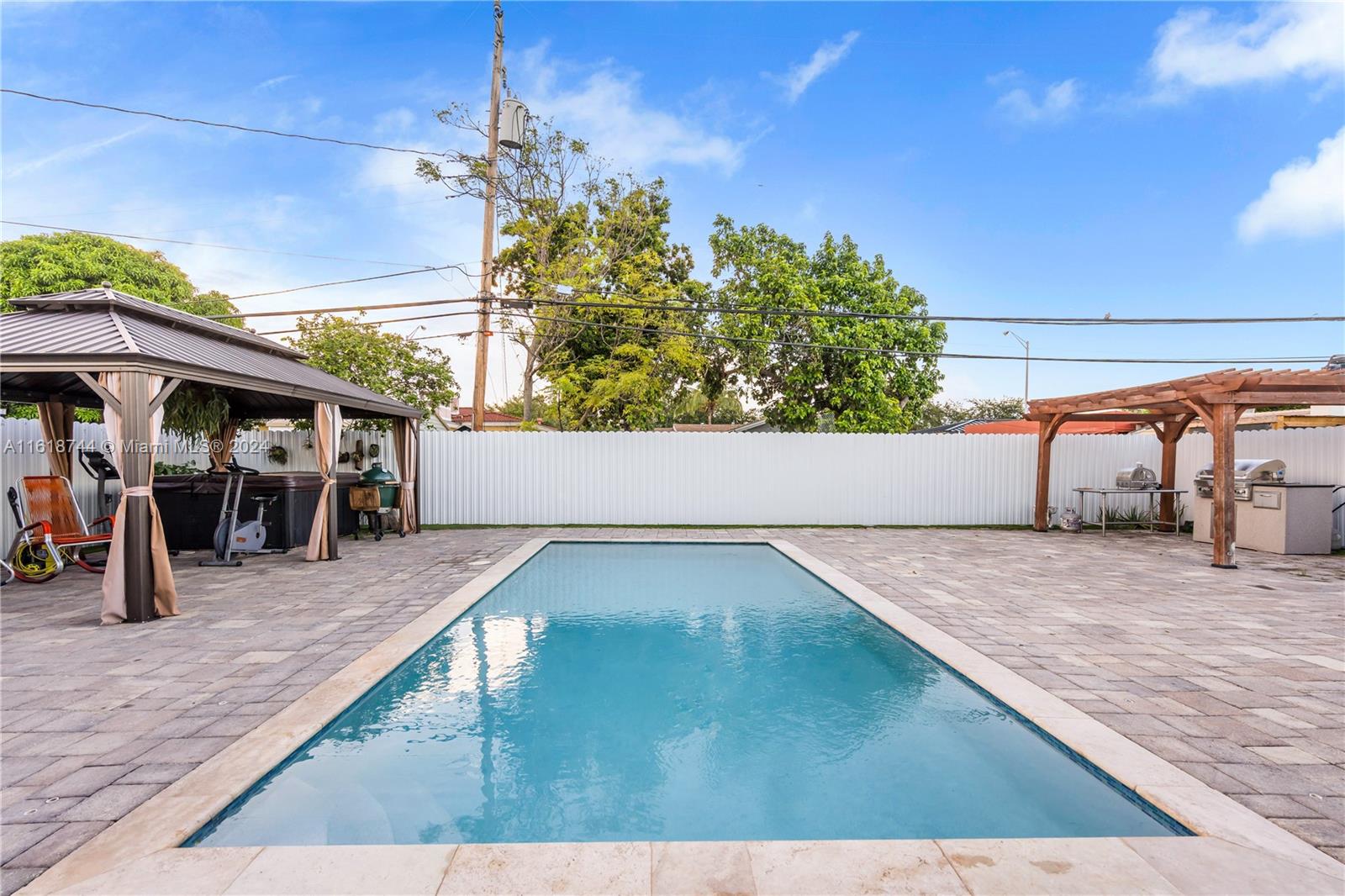 This beautifully remodeled house in Miami, Hialeah is a stunning blend of modern finishes and thoughtful design. The house is fenced, circular driveway. Ceramic tiles that flow seamlessly throughout the entire house, adding a touch of sophistication and easy maintenance. The modern and very updated kitchen is a chef's dream, featuring top-of-the-line appliances, sleek cabinetry, and ample counter space. The house boasts 5 spacious bedrooms and 3 luxurious bathrooms. Step outside to the patio area, where you'll find a second kitchen perfect for outdoor entertainment next to the pool and above ground jacuzzi. These home is a perfect blend of indoor and outdoor living, offering a luxurious and modern lifestyle in the heart of Hialeah.