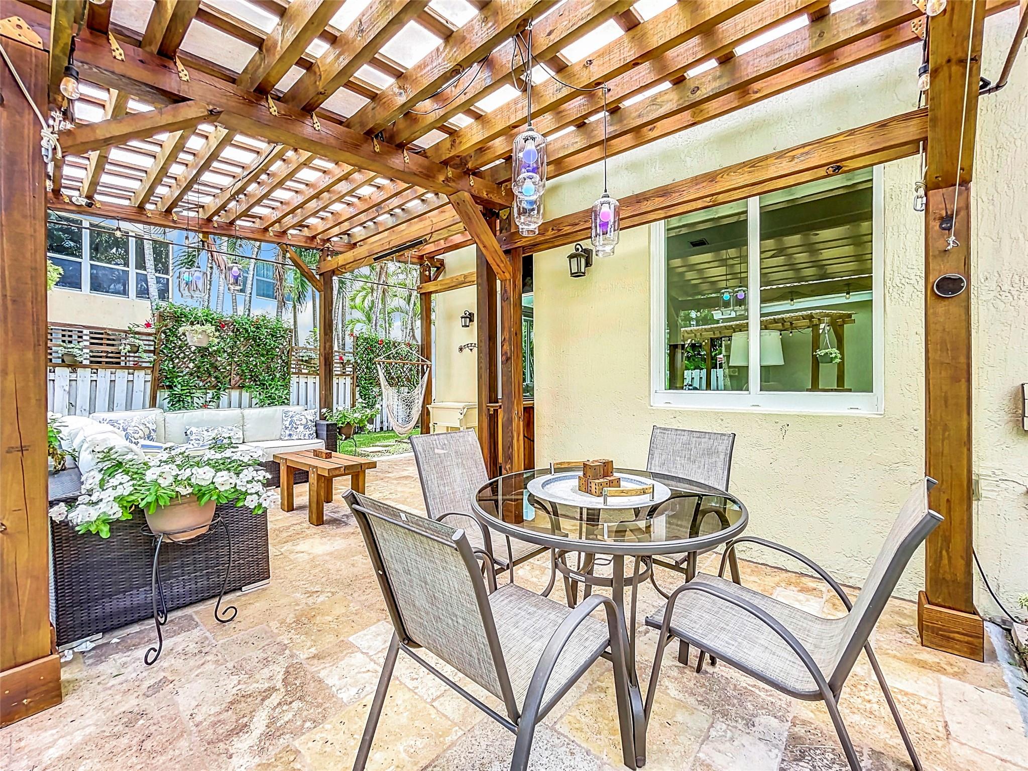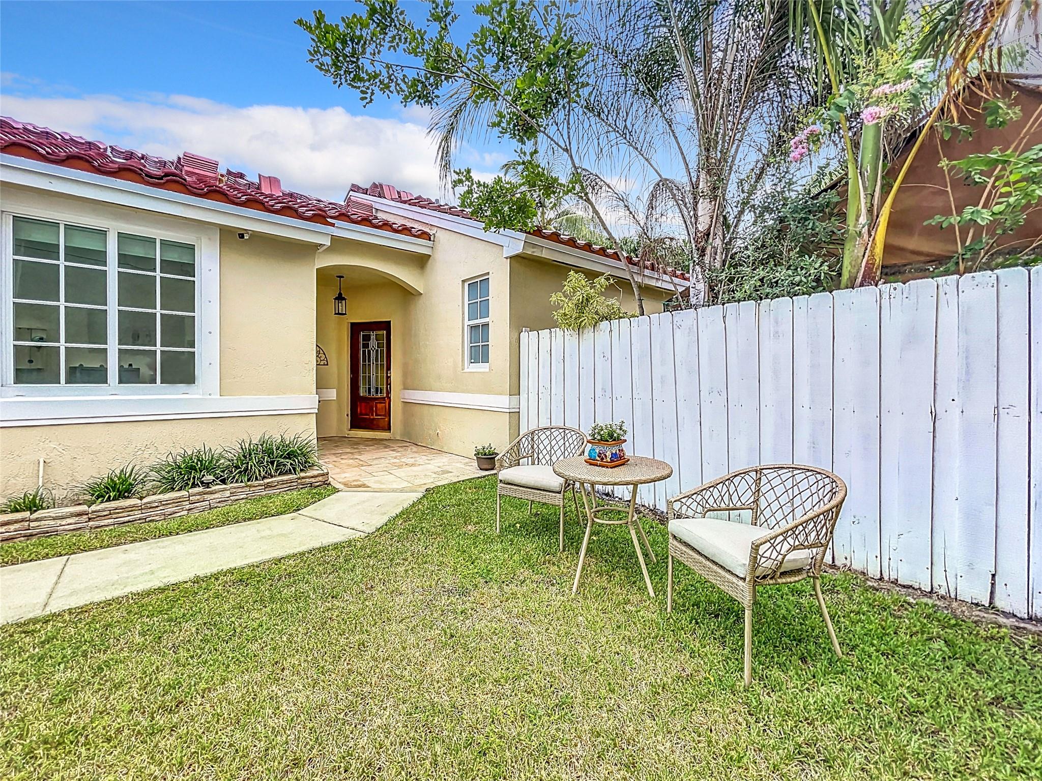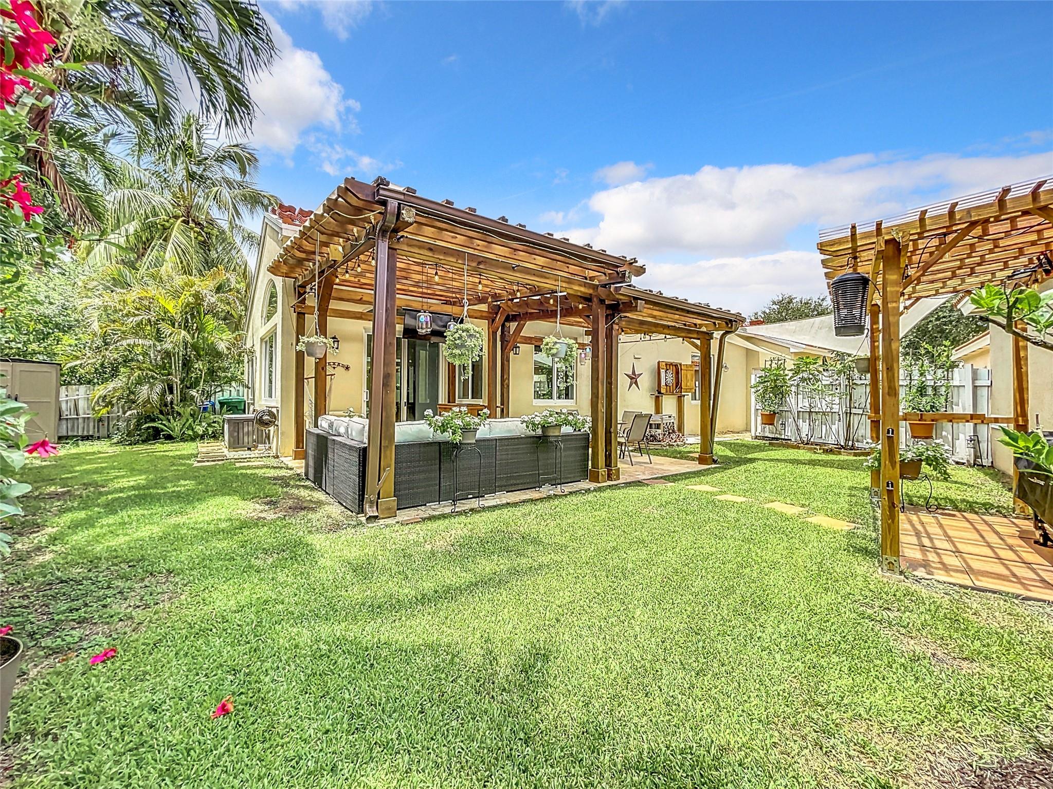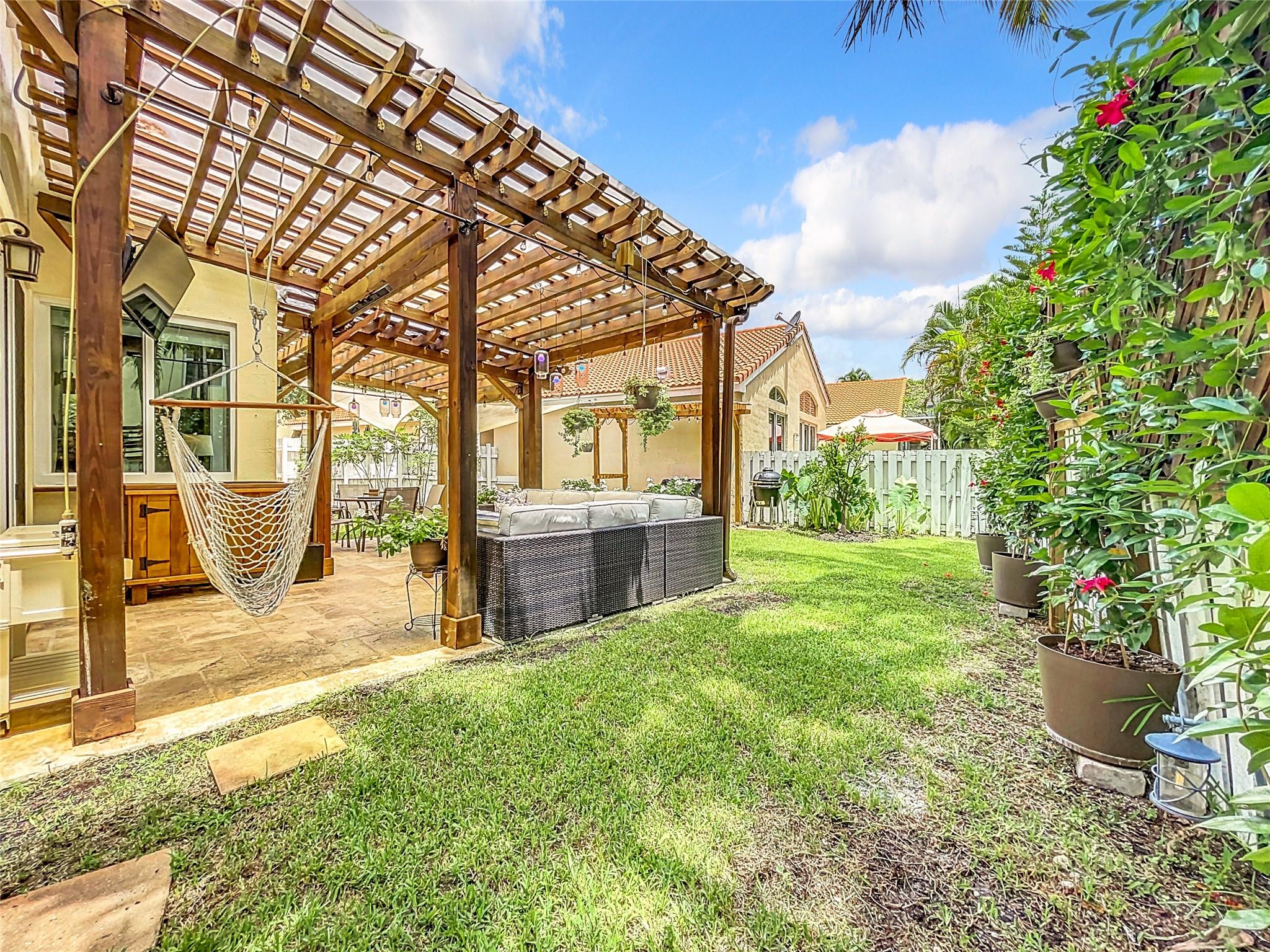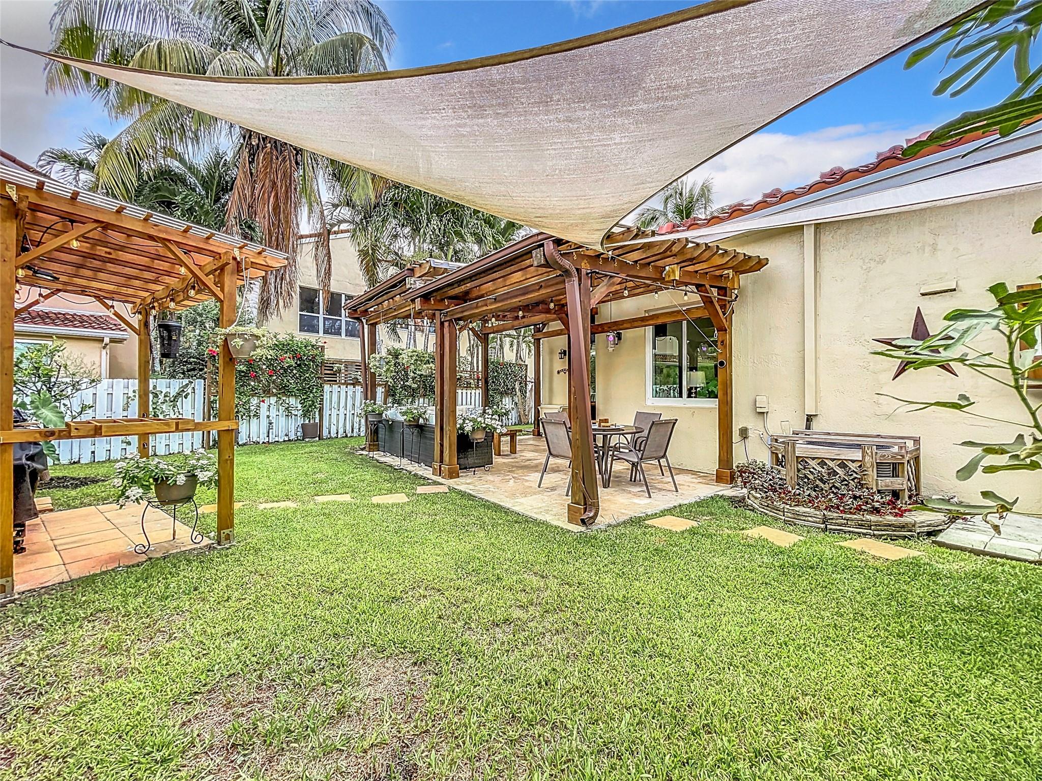 Must see this spectacular one-story home! Plenty of space for entertaining indoors or out! Featuring large Kitchen open to Family room and Dining room with vaulted ceilings, High Impact Windows providing lots of natural light. Split bedroom plan, custom closets and hardwood floors. Primary suite w seated area, dual sinks, and shower. Remodeled backyard covered patio w custom Pergola with furnishings, mounted TV, storage hutch, mood lighting and speakers, Grill & Smoker-Perfect setting for all gatherings! New roof 2024. Newer appliances. Security system. Starter or downsizing, tour this lovely 3B/2B, 2 car garage, fenced, in the gated community located in Davie, Regency sq, next to Southwest Ranches and Weston. Close to Shops, Parks, Cleveland Clinic/Hospital and more. A rated schools.
