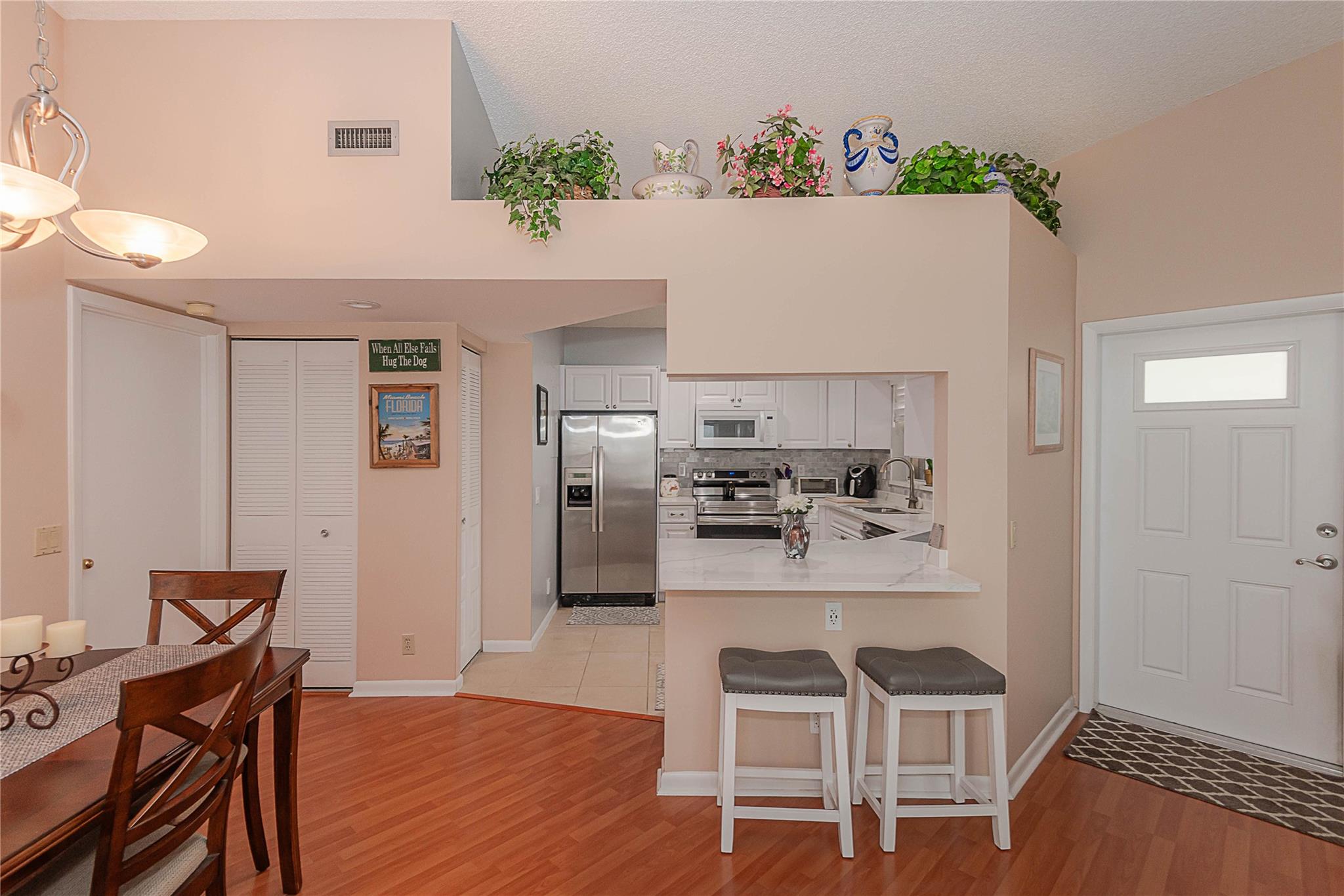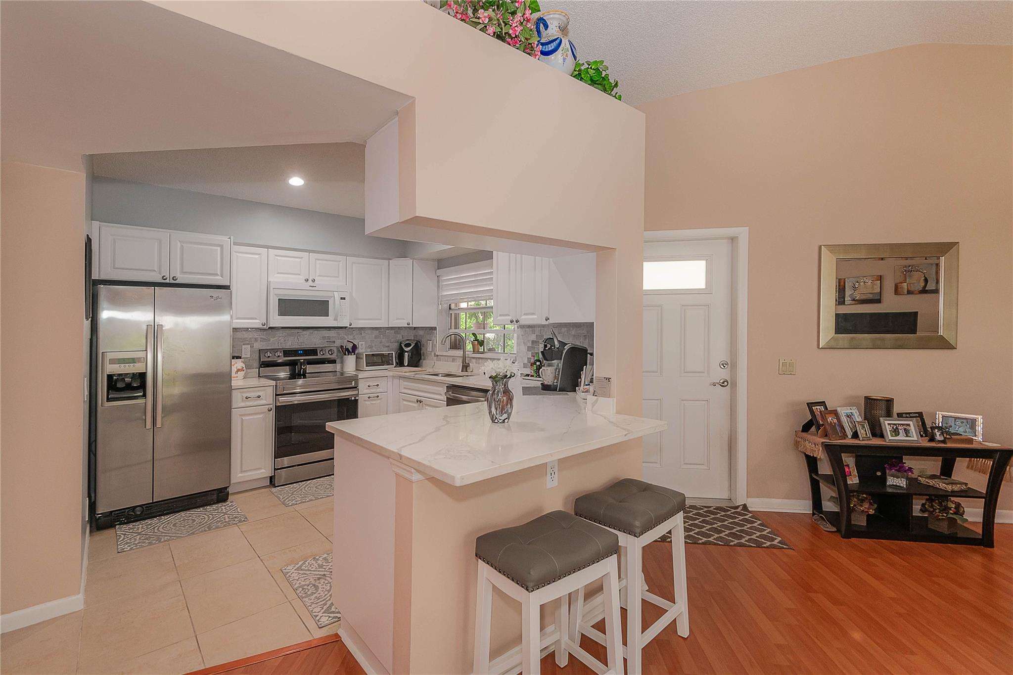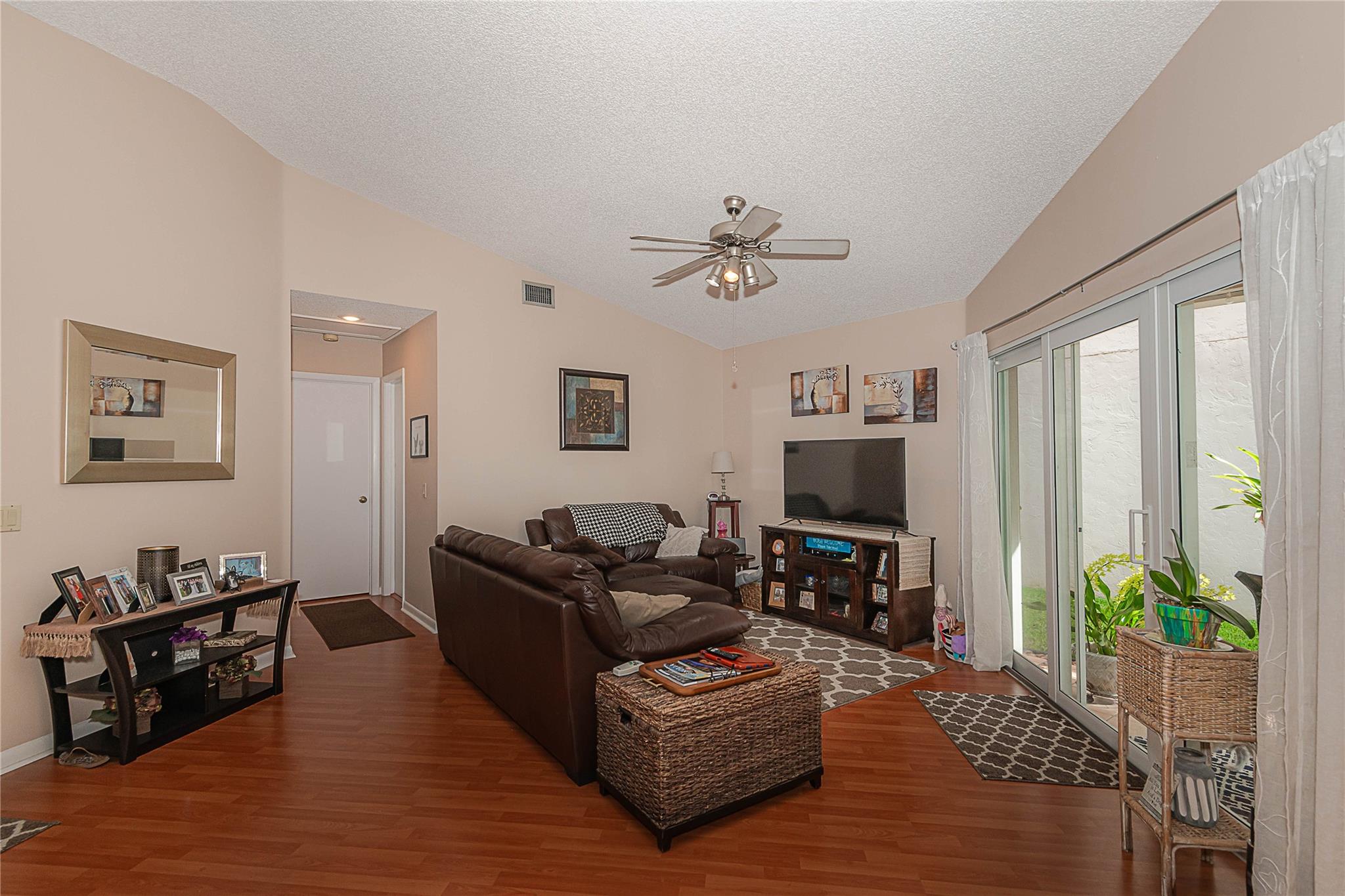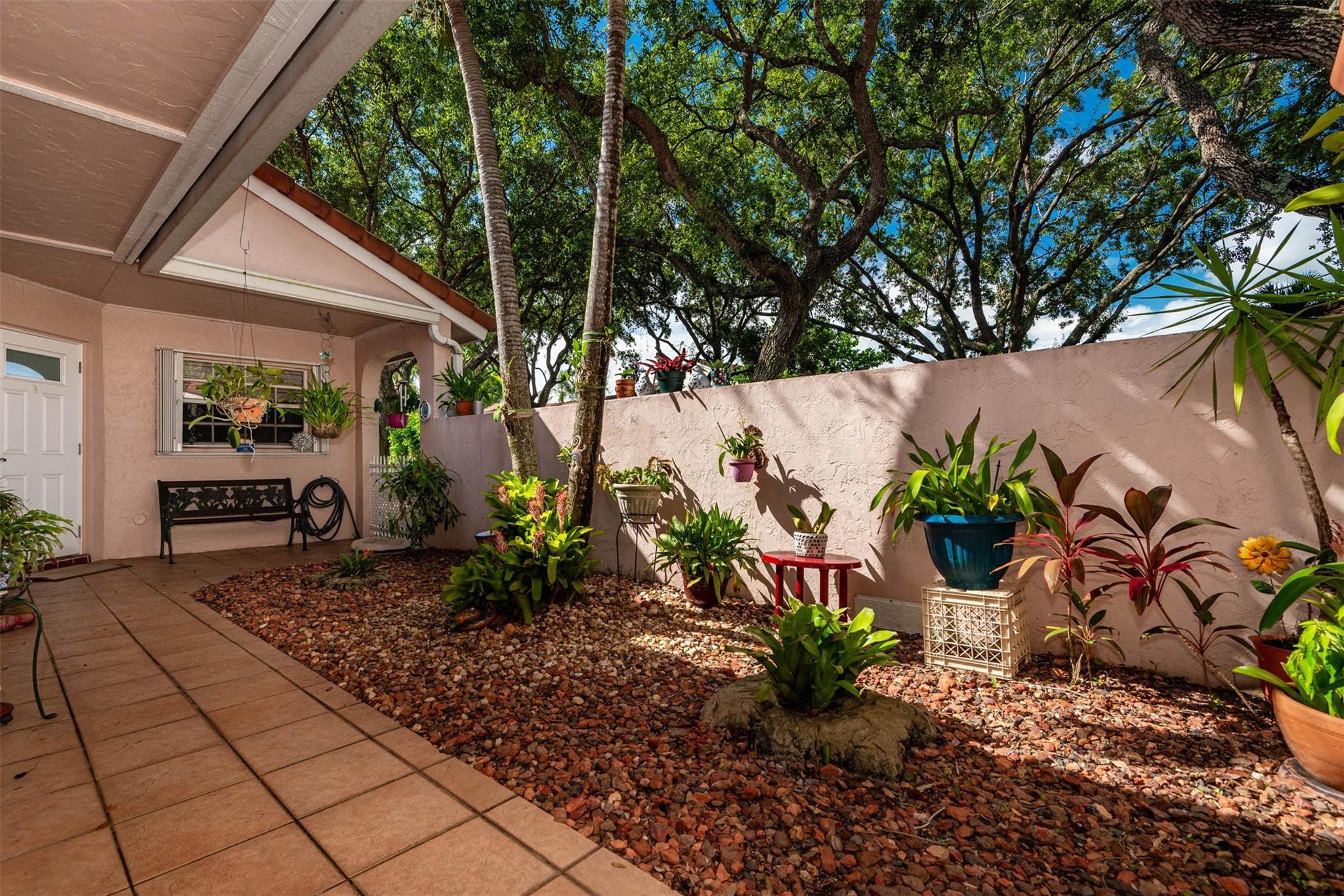 Move in condition. Only one of this model available in Garden Homes. Spacious, updated (2020) bright, white kitchen features stainless steel appliances. Updated master bath, partially updated second bath. Large walk-in closet in master bedroom. Vaulted ceilings. Split bedroom plan. Complete storm protection with either impact doors or accordion shutters. Situated on a corner lot in a cul-de-sac. One car garage with storage, plus 2 car driveway. Roomy, fully privacy fenced and landscaped wrap around backyard with irrigation system, plenty of room for a swing set or for pets. Roofed (8x13) patio. Amazing and very private community pool. Beautiful, well maintained community, HOA fee includes cutting front lawn grass, common areas and the community swimming pool.