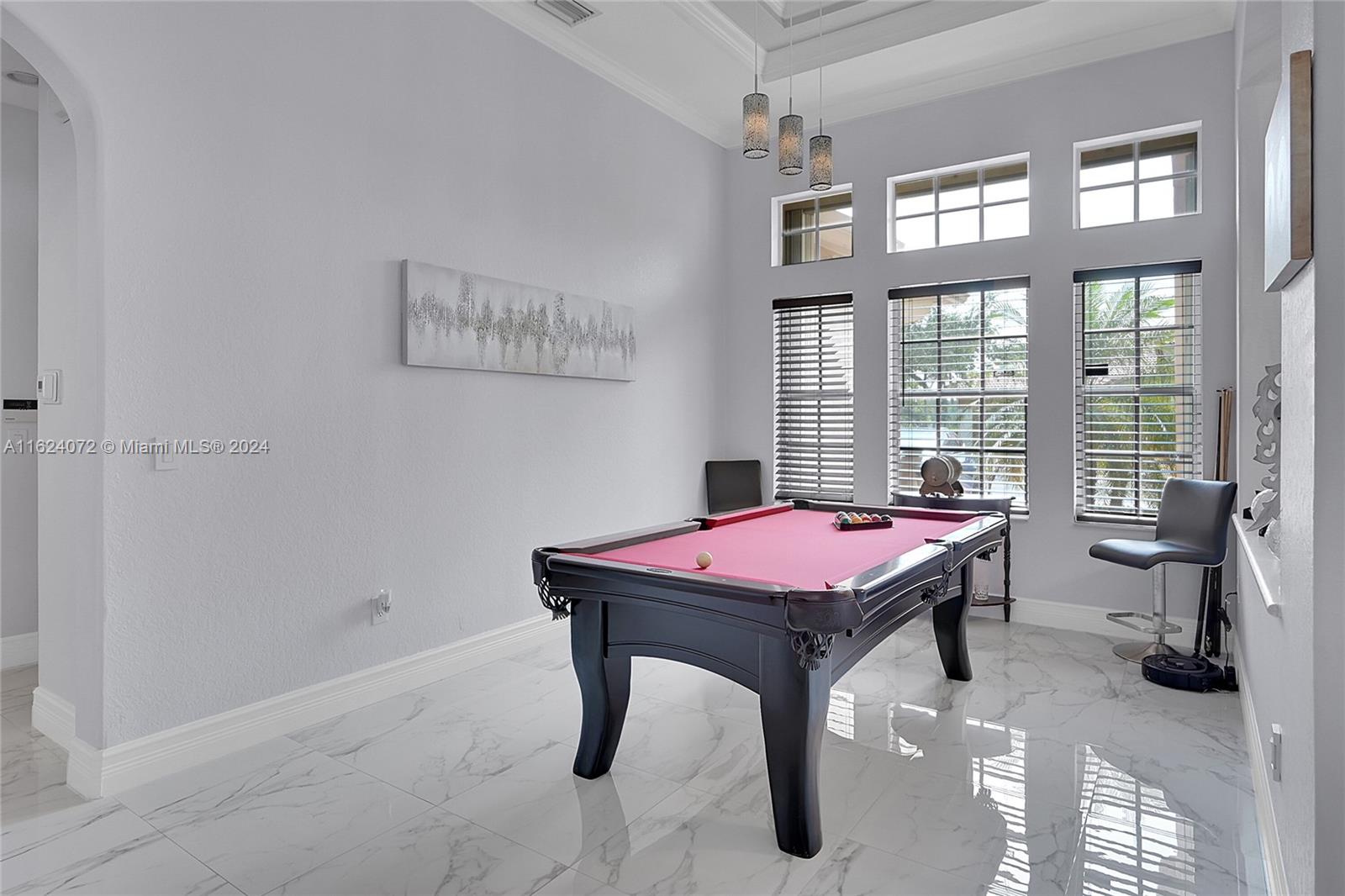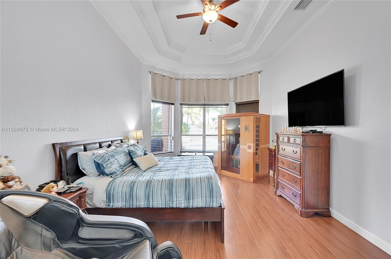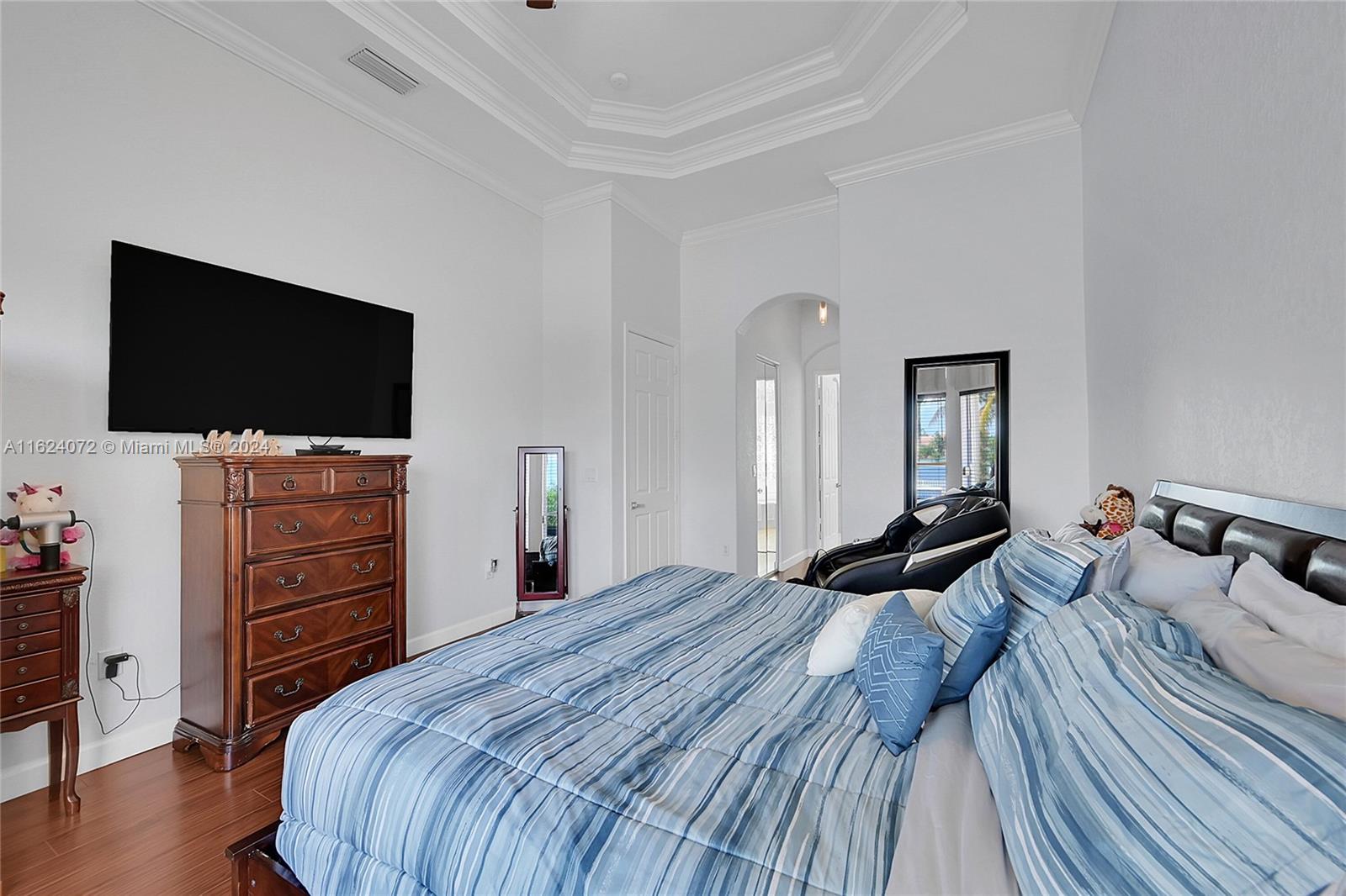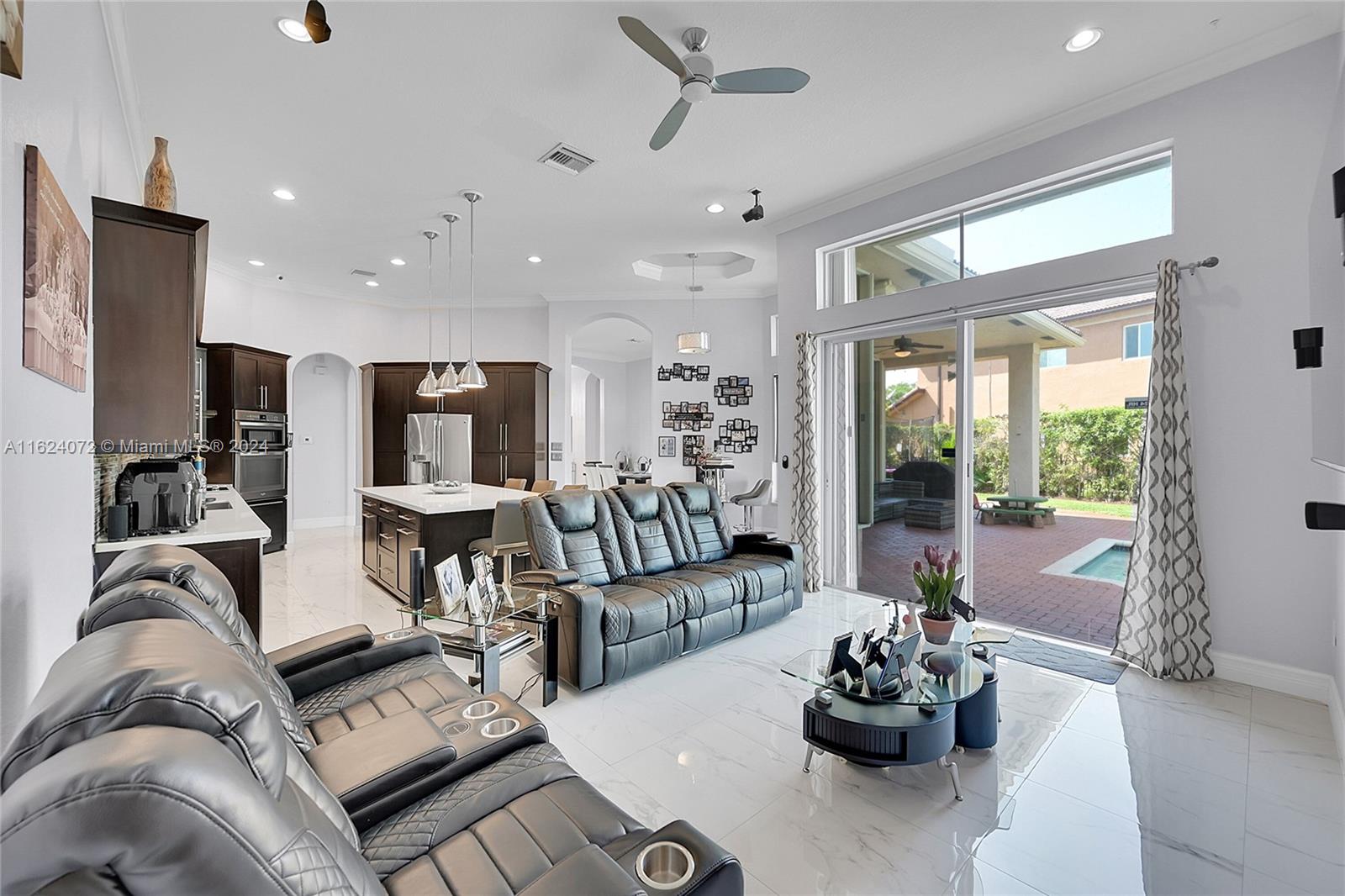 Stunning 5-bedroom, 3-bath lakefront home on a double lot. Features include a heated pool with jacuzzi, new pool heater and sprinkler system, mango and avocado trees, and a modern quartz kitchen with stainless steel appliances. Interior highlights are new tile flooring, hi-hat lighting, crown moldings, and walk-in closets in all rooms. The master suite offers dual walk-ins, dual sinks, and a soaking tub. Exterior includes lake views, accordion shutters, a covered patio, brick paver driveway, and patio TV and speakers. HOA amenities include cable and internet. Interior/exterior cameras stay.