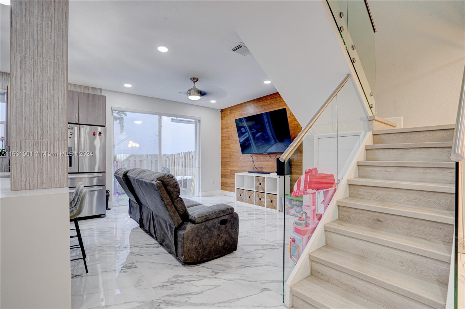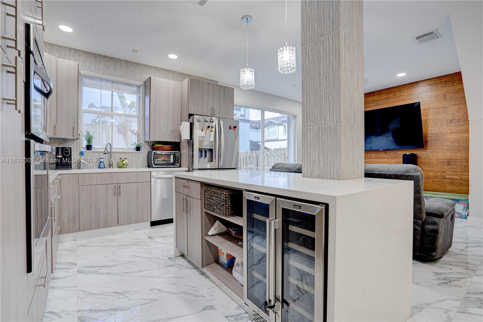 Stunningly remodeled and upgraded townhouse in the heart of centrally located Doral! This home boasts a professionally designed open-concept living, dining, family, and kitchen area, all enhanced by exquisite Calacatta marble tiles. A glass staircase leads to three spacious bedrooms. The property includes a one-car garage, two driveway spaces, and additional guest parking. Features include a newly installed AC unit, Whirlpool appliances, accordion shutters, and numerous other high-end upgrades and details. Enjoy the community pool or the Island of Doral complex. This is a must-see property! Act fast and bring your best offers – this unique home won't be on the market for long!
