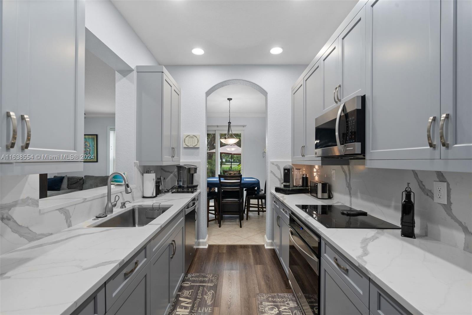 Stunning CORNER townhome that lets in lots of natural sunlight located in the Cimarron community with tons of upgrades, Full Hurricane Impact Windows & Sliding Glass Doors, Crown Moulding Throughout the entire home, Kitchen Remodeled in 2021 with 42 Inch Upper Cabinets + Quartz Counter Tops, Renovated Owners Bathroom Oasis with dual overhead shower heads & marble floors, upstairs carpet replaced in 2021. Media/Movie room with surround sound + sound proofing, private outdoor patio with travertine + built in grill perfect for barbeque's and entertaining. extra storage under stairs, built in overhead storage racks in garage, close to nearby shopping, Tree Tops Park, Publix, Target, Restaurants and highways. Cable TV included in monthly HOA Fees. NO Lease 1st Year Owned.