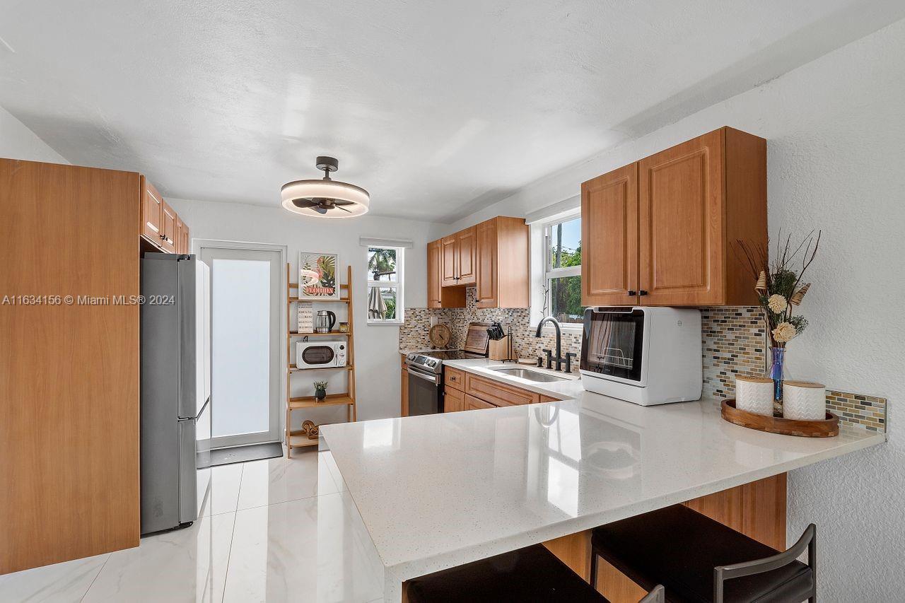 This home boasts a hip shingle roof that's only 3 years old. Installed impact windows and doors. Step inside to discover a fully renovated kitchen featuring brand new appliances, quartz countertops, tiled backsplash, and new kitchen cabinets. Also included a new washer and dryer, tankless water heater, and a new central AC system. Enjoy the elegance of porcelain flooring throughout the home, creating a seamless and modern aesthetic. Renovated and modern bathroom with porcelain tiles. The fenced yard includes a utility shed for extra storage, with no rear neighbors! Situated just 8 minutes from Hollywood North Beach. You're conveniently close to Fort Lauderdale Airport, Memorial Hospital, Seminole Hardrock, TY Park, and the Anne Kolb Nature Center with easy access to I-95, US1 + AIA.