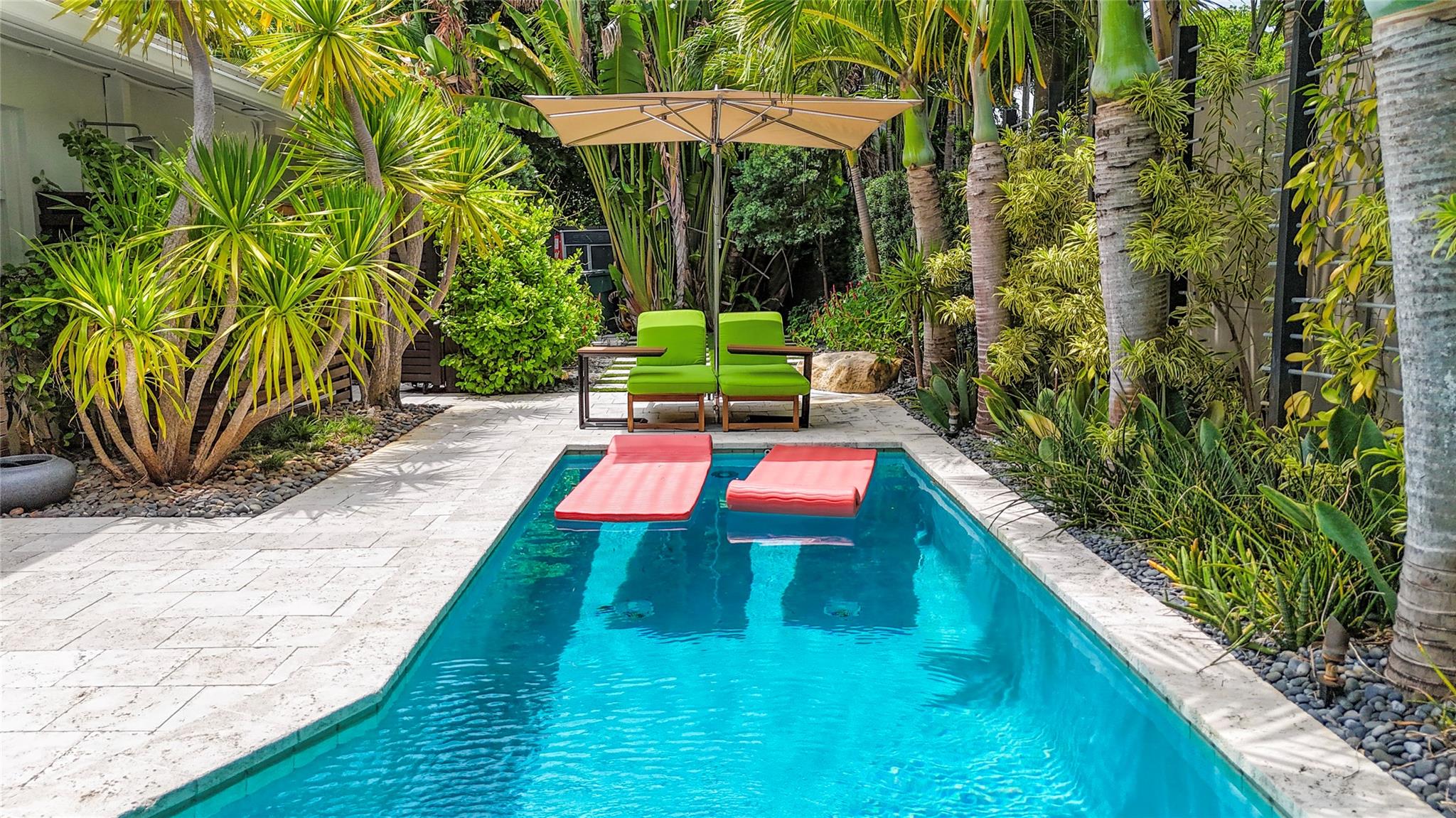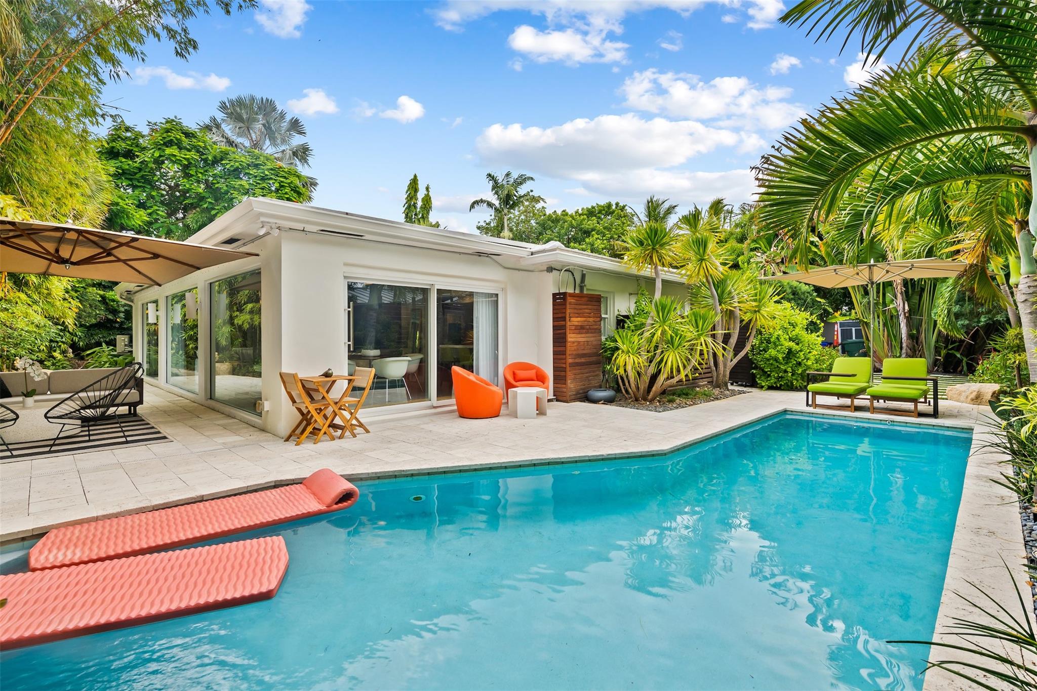 Mid-century on oversized Coral Ridge lot, designed with privacy in mind. Dining, living room, primary bedroom + bath all benefit the views through picture windows, light & greenery. Full entertainment wall of custom cabinets/countertop w/ ice-maker, dish washer & wet bar. The kitchen boasts wood cabinetry, a stainless gas range w/ an architectural hood & full slab backsplash. The resort-style pool makes this offering even more special.