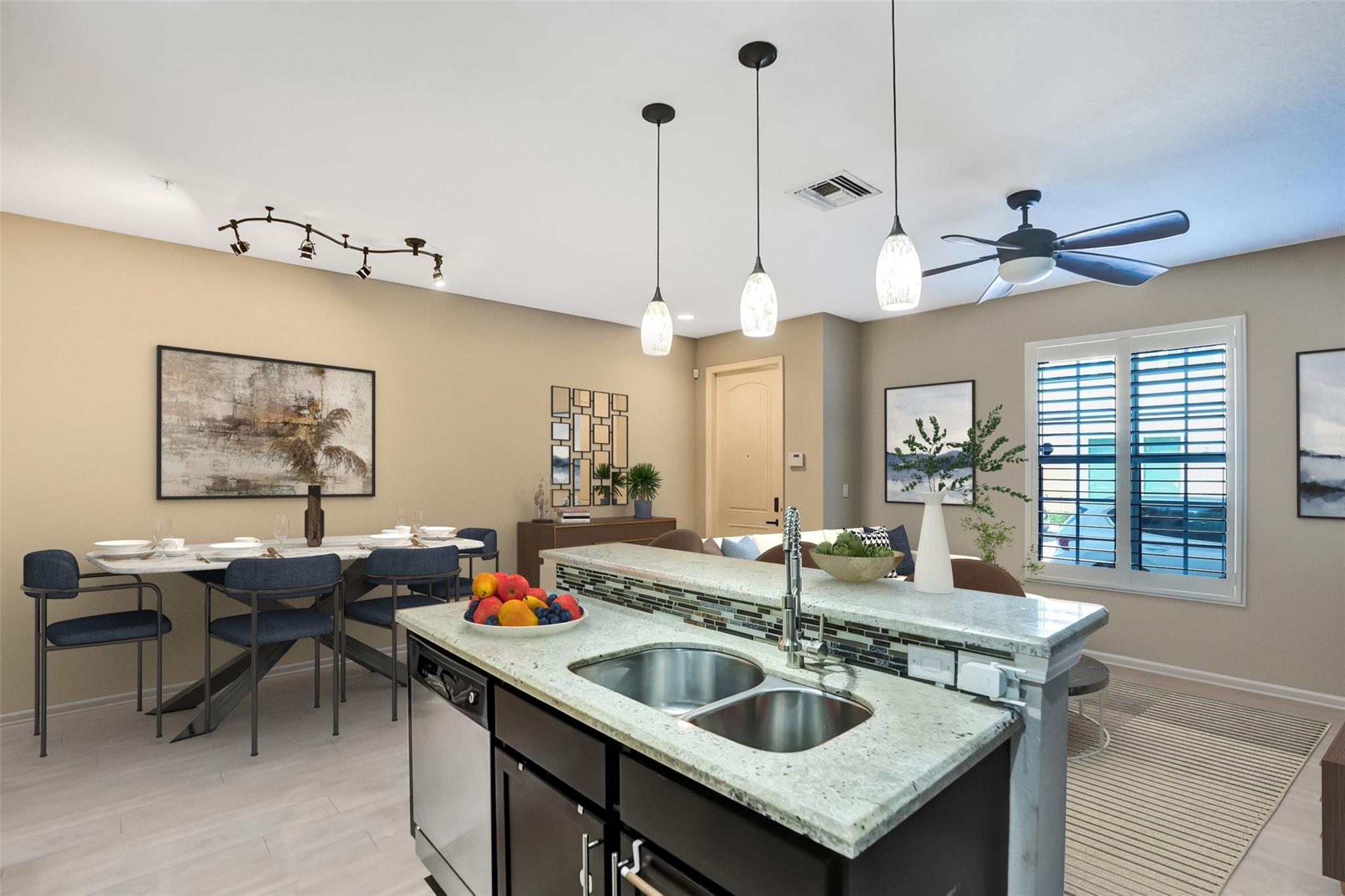 Welcome to this beautiful CORNER unit featuring 3 bedrooms, 2.5 baths, 1,784 under A/C of open concept living. This home offers high ceilings, hurricane IMPACT windows & GARAGE door. Garage roof rack will remain for extra storage. Only 1 neighbor on the side. This spacious living area is adorned with new Plantation shutters which extend into the oversized master bedroom and master bath. The master suite includes a sitting area, a huge walk-in closet and additional closet . Master bathroom with dual sink, window and a water closet. A conveniently located full size WASHER and DRYER are found on the 2nd floor. Additional features include a GUEST bathroom on the 1st floor. Fire sprinklers . PET, investor friendly .Gym, lake, trail, fiber optic internet/ cable, roof repairs included in HOA.