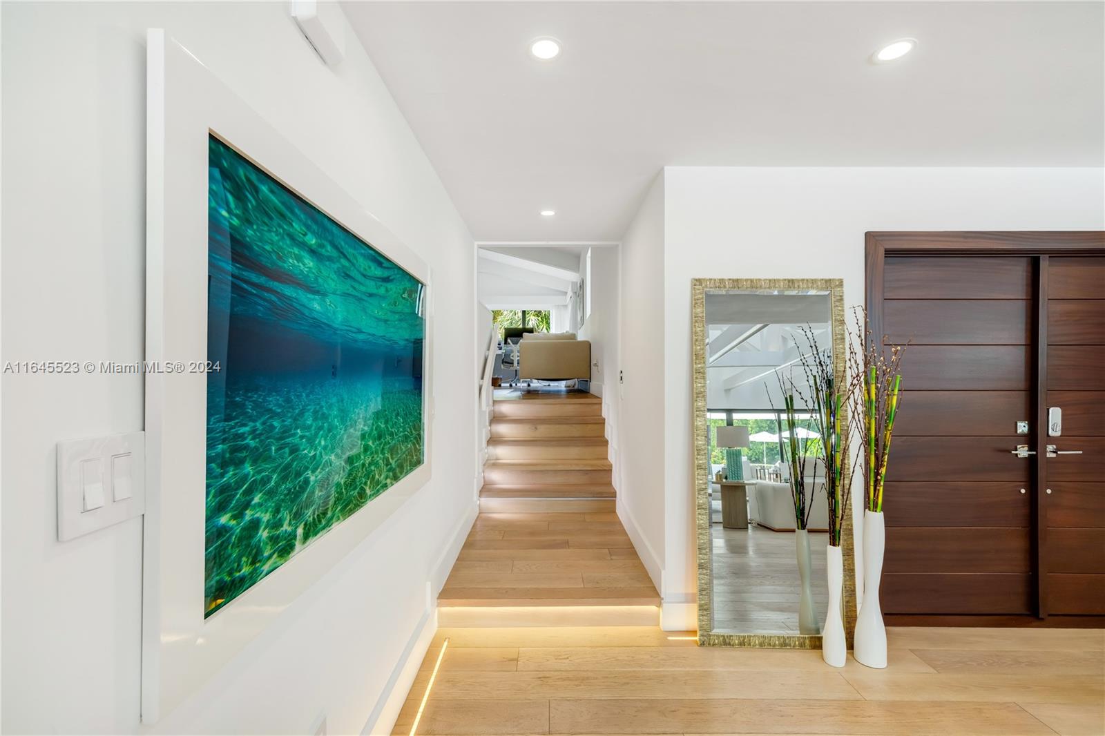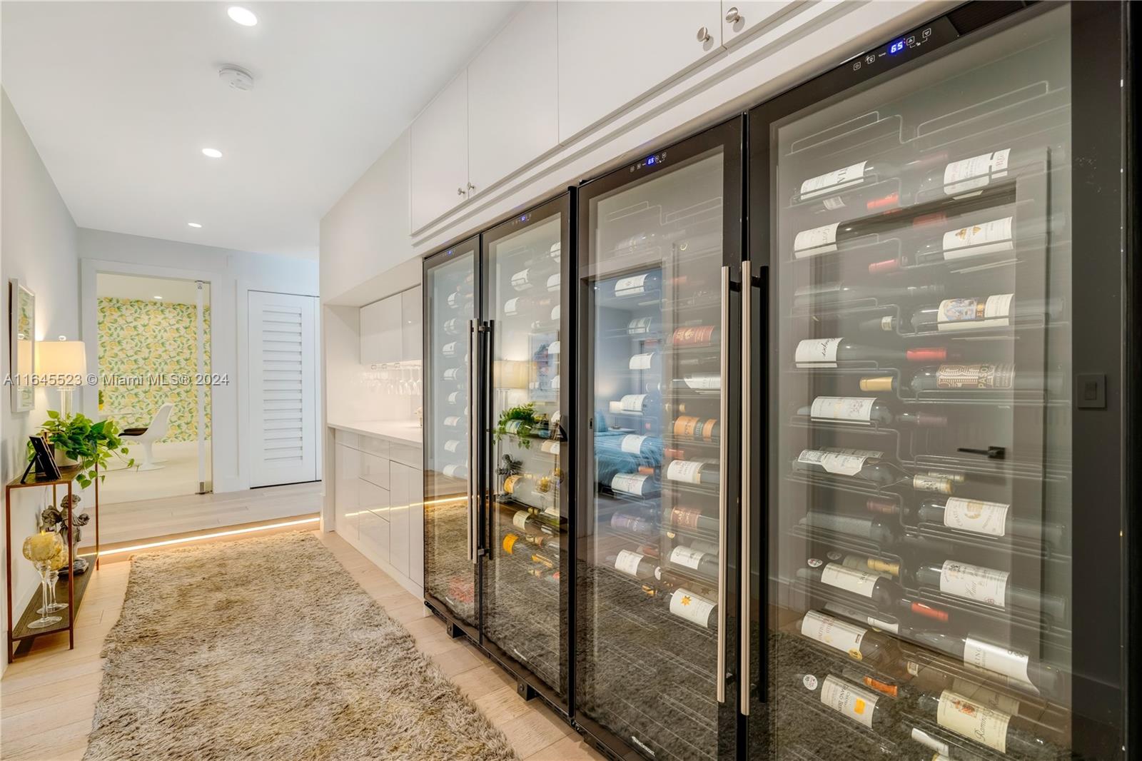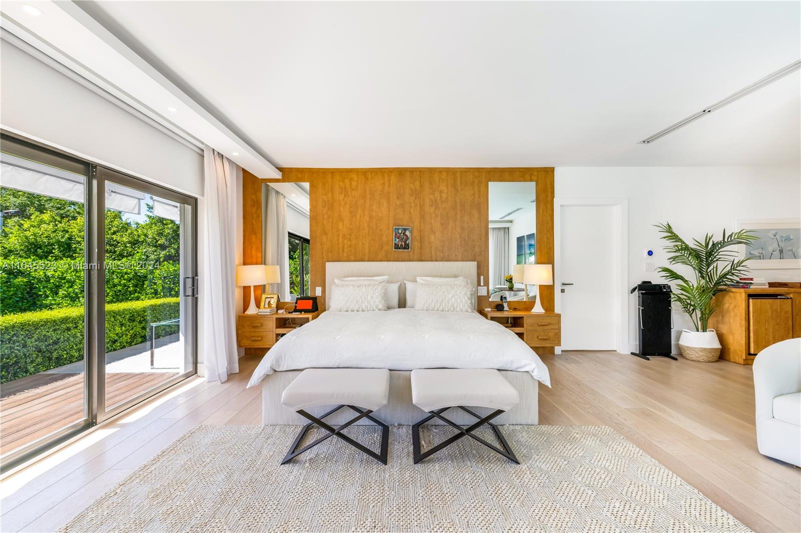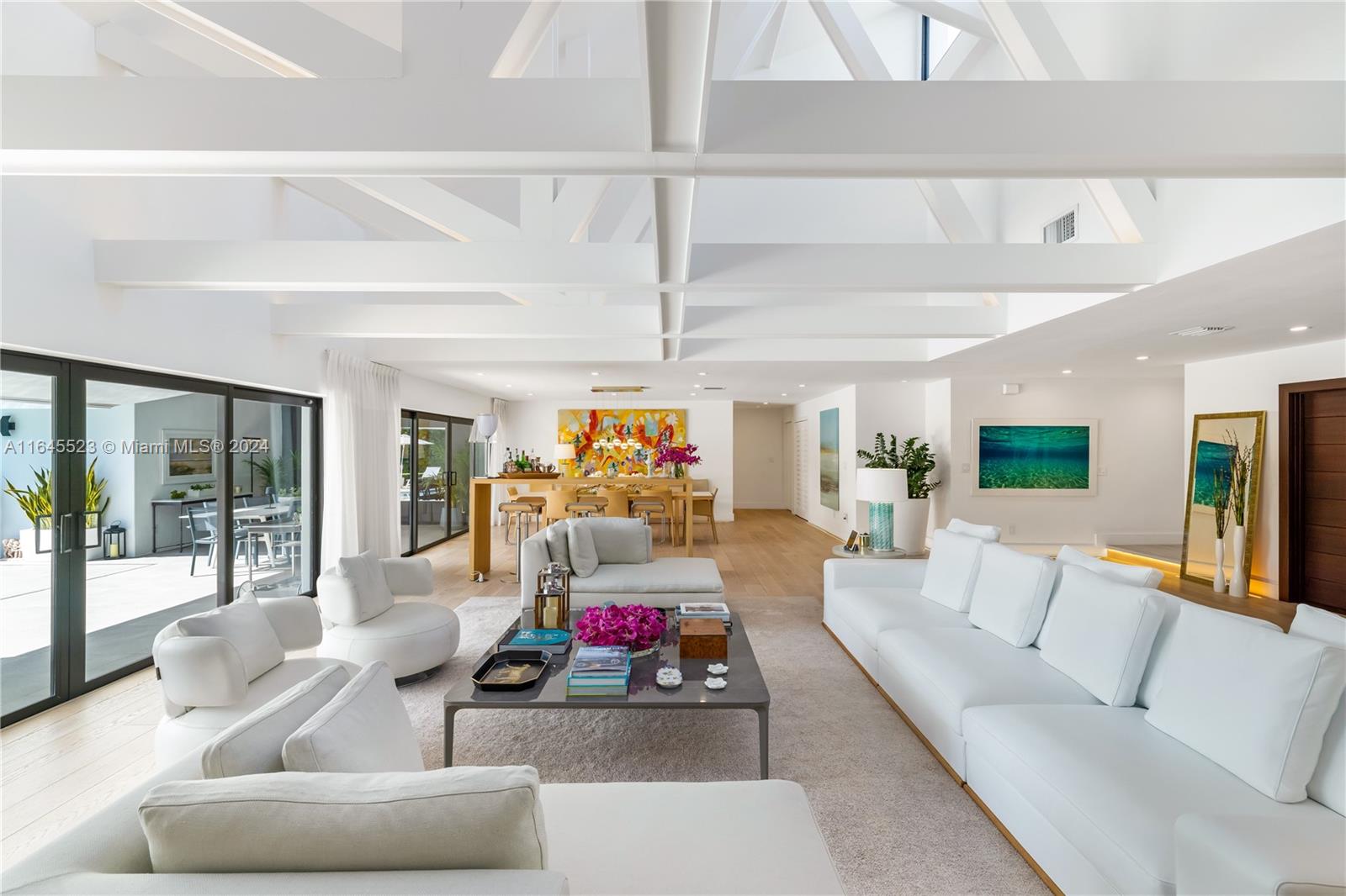 One story waterfront Jewel home exquisitely finished to the last detail. Architectural beams, open floor plan overlooking the pool & 114 ft. of waterfront. 3/4 bedrms, 5 bathrms, office + large family rm. Croatian Oak floors throughout. Kitchen w/Dell Anno cabinetry, Miele appliances, Subzero refrig, pantry & laundry rm. Hallway features a glass wine cellar that leads you to the main suite w/sliding glass doors overlooking terrace & water. The main suite w/2 separate ensuite bathrms, one w/Jacuzzi & steam bath, automatic toilets & 2 separate walk-in closets. Covered terrace w/2 BBQ’s, 1 propane,1 charcoal, icemaker & small fridge.2-car garage. Impact w/d, prop. generator. 65’ Dock.Sec1 voluntary Civic Assoc. to use tennis cts. Sec 1 Sp. Tax District.Furniture available for sale separately.