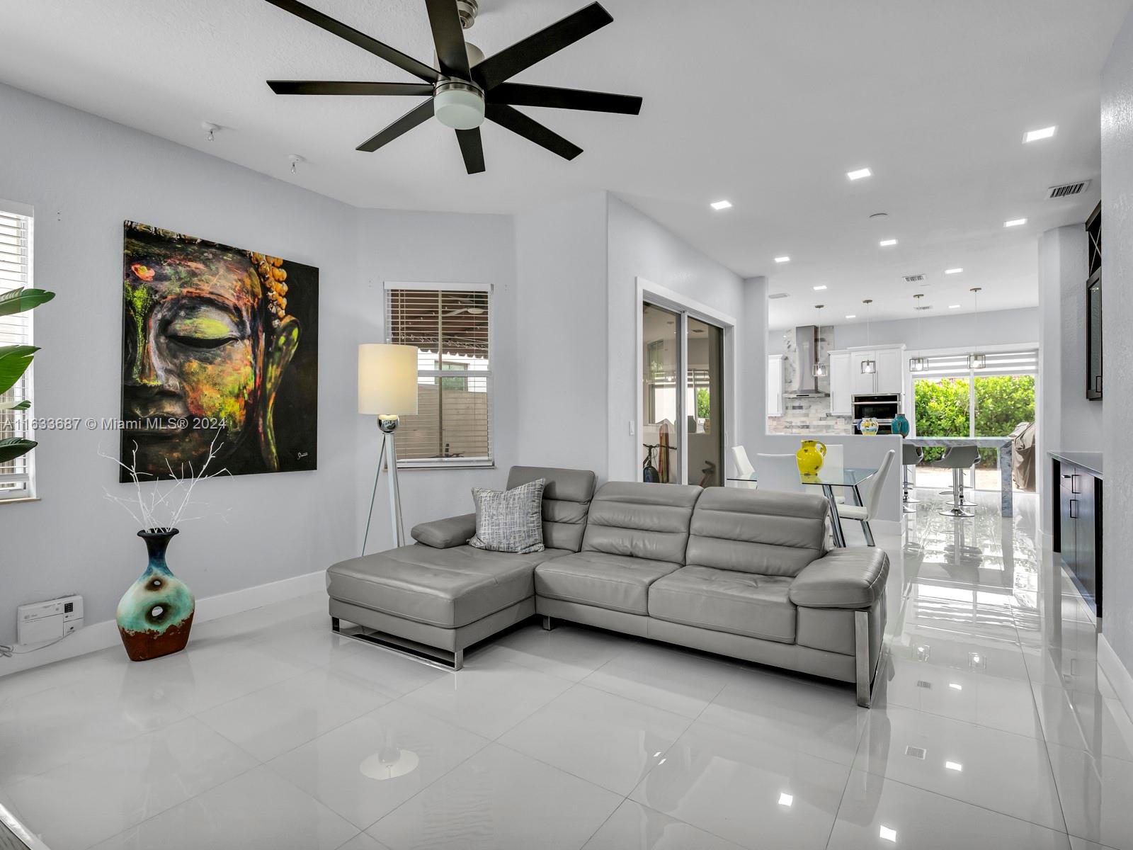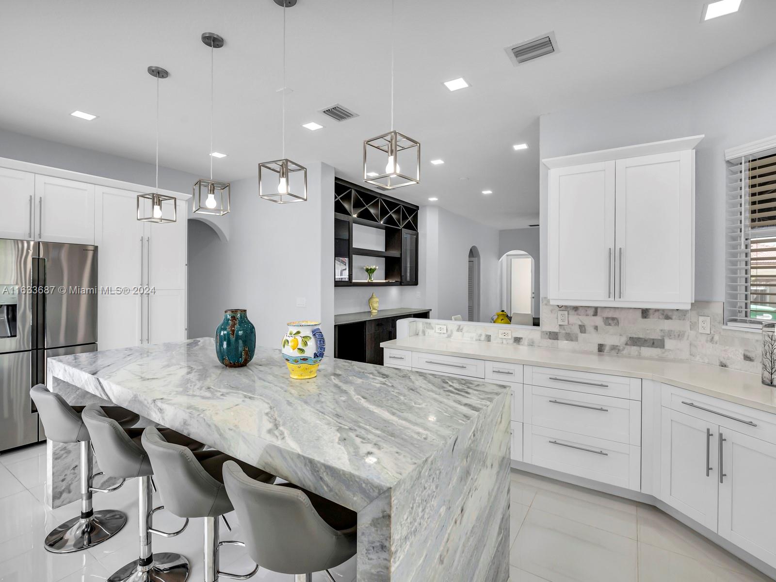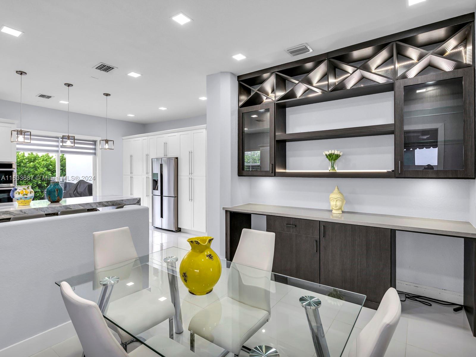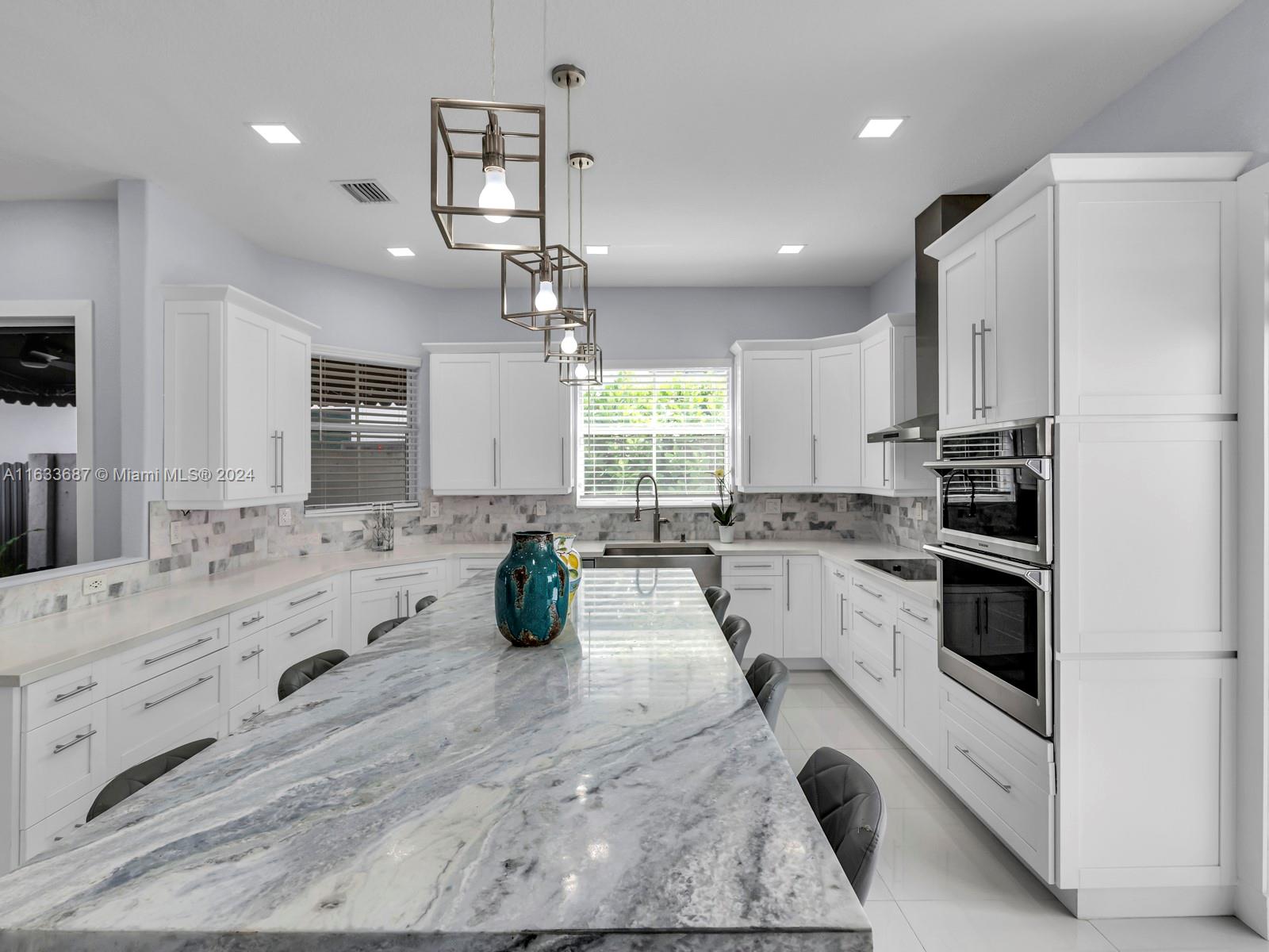 This 4 bedroom 3 bath home has been totally remodeled with white porcine tile flooring in all living areas, custom built-in dining room wall unit with custom lighting, custom built-in master closet with lighting features, custom recessed lighting, custom kitchen cabinets , 9' waterfall kitchen island with eight chairs, and 2 car garage with custom flooring and gym equipment. Best of all is the back yard with no construction for total privacy.
