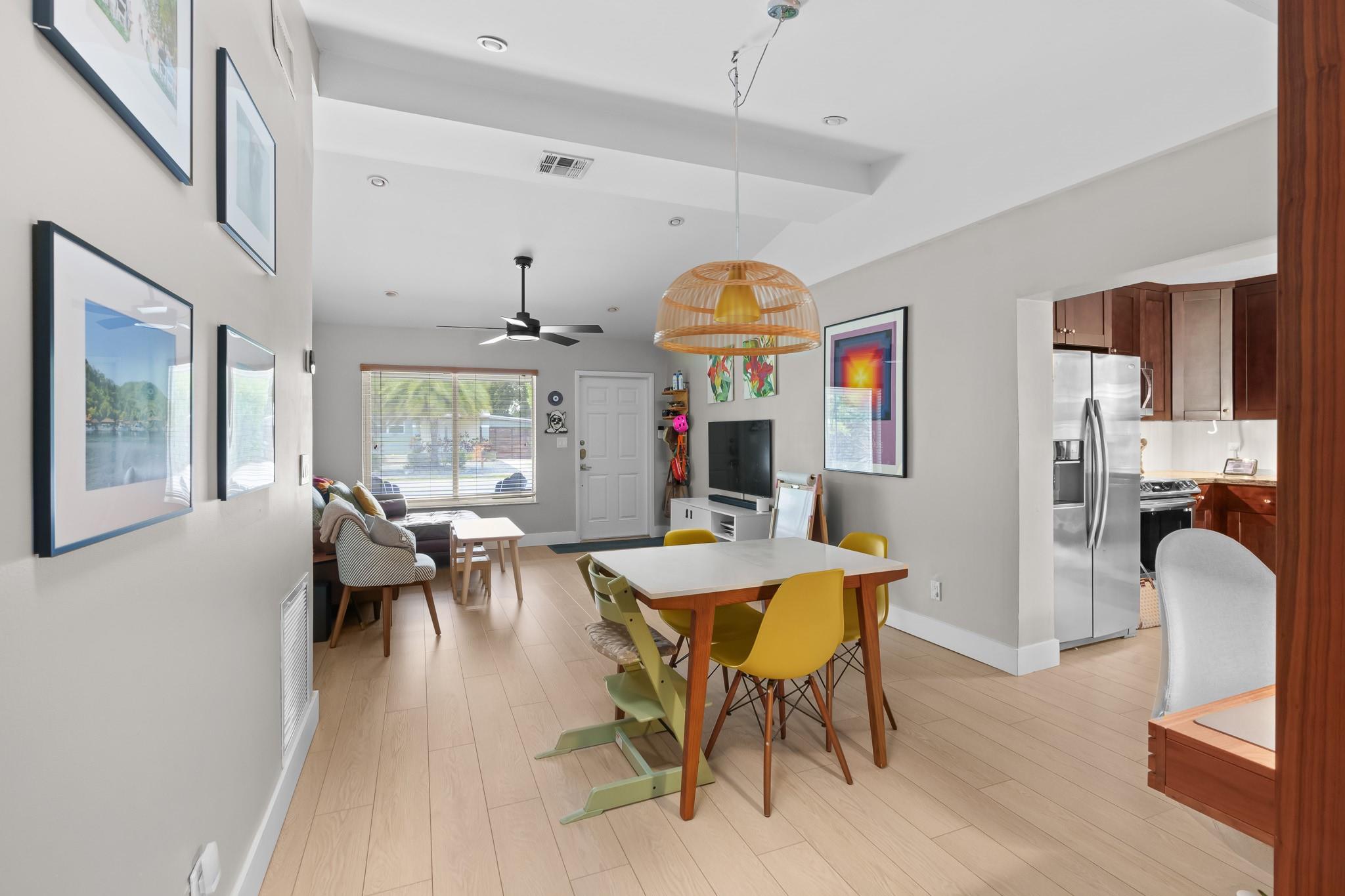 You'll love this surprisingly spacious Mid-Century Modern 3-bedroom 2 bath home with fabulous updates & a professionally painted exterior (Spring '24). Relax knowing you have brand new roofs - flat & pitch '24, new gutters, impact windows & doors, updated electrical panels & a '22 AC unit. You'll appreciate the beautiful open, updated kitchen with a pantry, plenty of storage & all the modern improvements incl. the LVP flooring throughout. The screened patio overlooks an expansive east facing, fenced-in back yard with a convenient storage shed & plenty of room for an awesome garden or swimming pool. The bathrooms are updated; one in the hallway & a gorgeous en-suite within the primary bedroom. That primary bedroom is HUGE. Priced below market, this home is exceptional & ready for you!