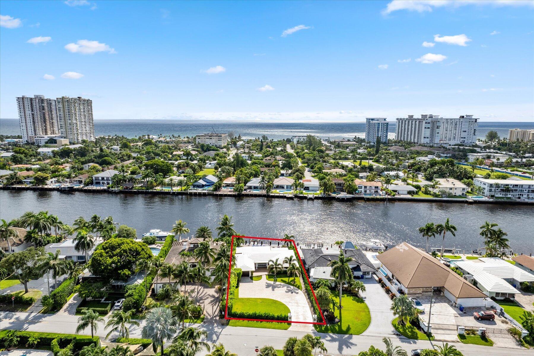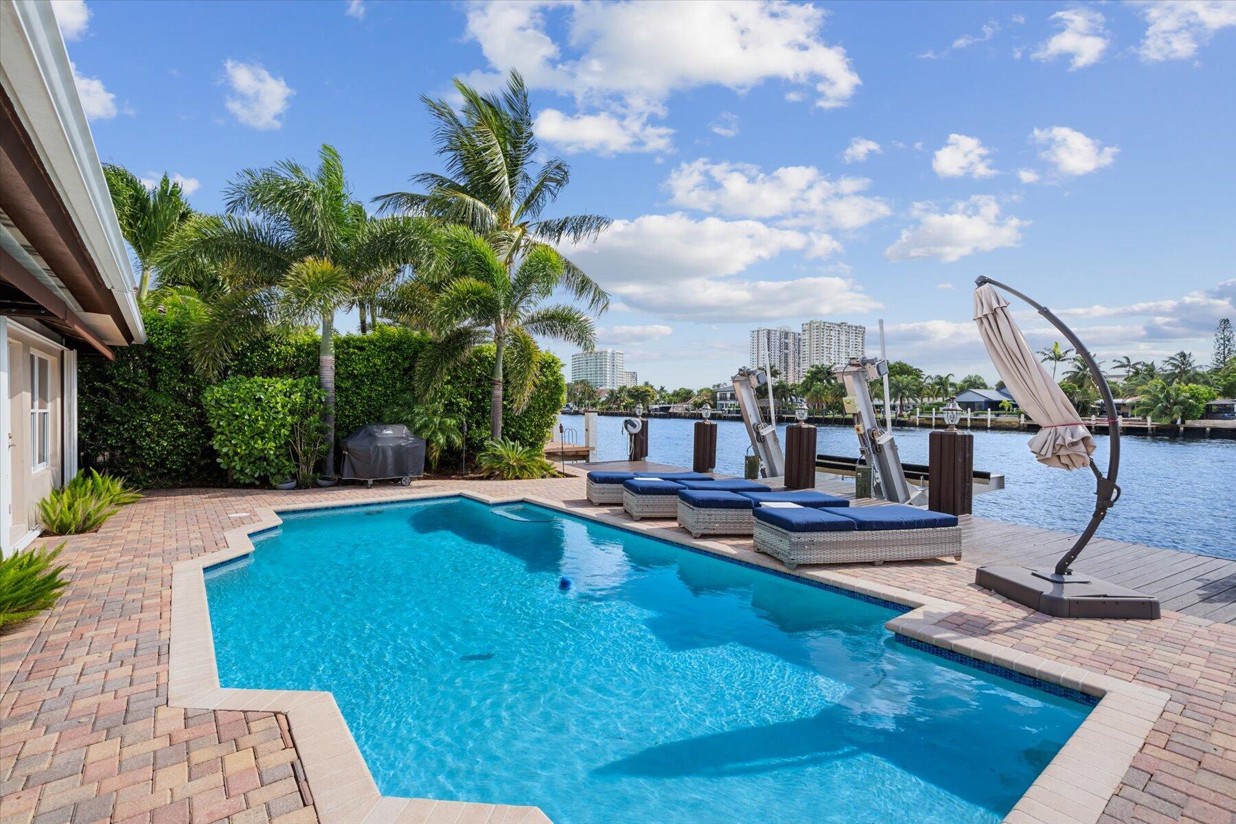 Discover the epitome of luxury living in this breathtaking Intracoastal home. Check off all your housing desires: 3 bed, 2 bath, 1 car garage, bonus den/office, pool and waterfront! This exquisite property offers the perfect blend of comfort, style and outdoor living with stunning water views. Enjoy 75 feet of waterfront with a private dock and a 25,000 lb boat lift. A sparkling pool with a heater and a large covered area provide the ultimate setting for entertaining and relaxing. The home boasts a massive paved driveway with plenty of space to park multiple vehicles or your boat trailer or RV. Property is located 3 miles to the Hillsboro Inlet giving easy access to the Atlantic Ocean with no fixed bridges. Dining, entertainment and beach close b