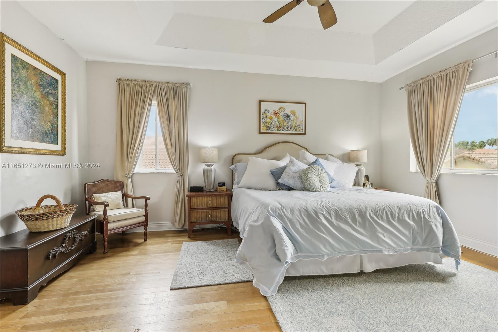 Beautiful 2 story home with 4 bedrooms, 3 bath in the prestigious and family-oriented community of Costa Verde in Doral. This elegant home features vaulted ceilings with lots of natural light, spacious living room, family room and dining areas with access to quaint and fenced back yard. Beautiful large kitchen with wood cabinets and gorgeous wooden stairs. Laundry room and a full bathroom downstairs. All Bathrooms have been upgraded. There is tile throughout the downstairs and wood floors upstairs. Back yard is big with room for a pool. 2 car garage is also tiled. 2 A/C units and accordion hurricane shutters throughout. Common area is beautifully maintained, great for walking and biking and features heated pool, large playground area and 24 hours security. Excellent location, A+ schools