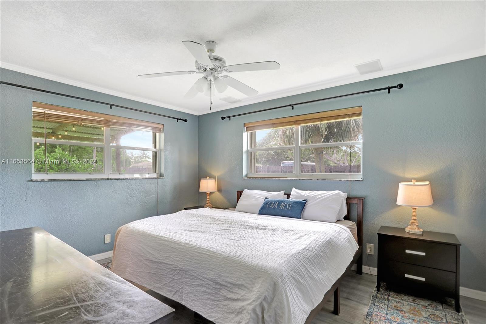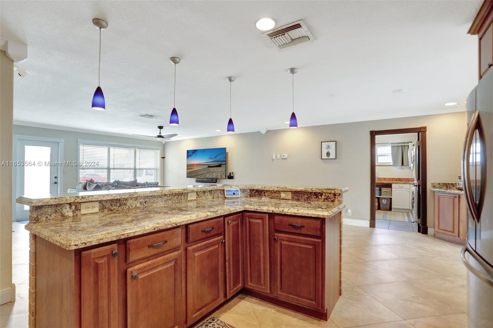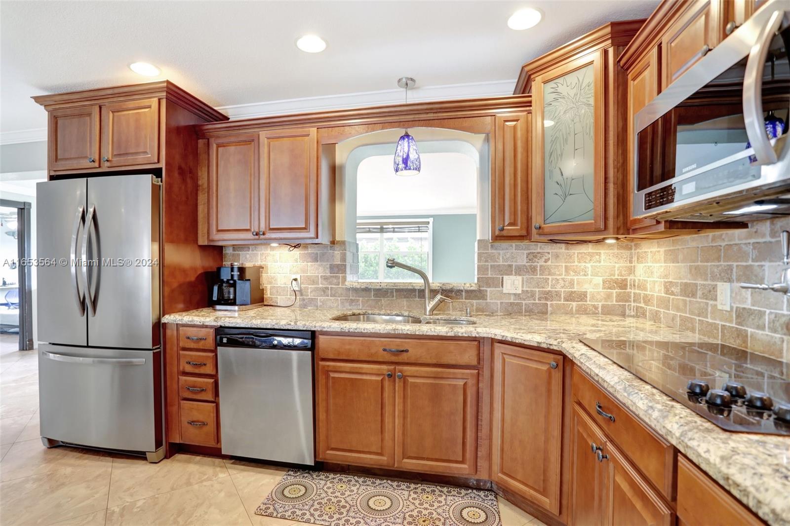Welcome to this charming ranch-style 4-bed, 2-bath home on a 1/4-acre lot. Enjoy the open kitchen featuring stainless steel appliances, granite counters, wood cabinets, a large island with breakfast bar, and dual convection ovens. Elegant 24" Italian porcelain tile and crown molding throughout. Relax in the master bath's Jacuzzi tub or entertain in the spacious Florida room with a bar. Step outside to a 16'x32' covered patio, lush garden and a large backyard. Extras include a large laundry room, enclosed carport, hurricane impact doors, and accordion shutters. Water filtration system for the whole house installed. Roof 2020, water heater 2020. Quiet street with great neighbors - Bonus: big circular driveway, storage shed and big space for your boat!