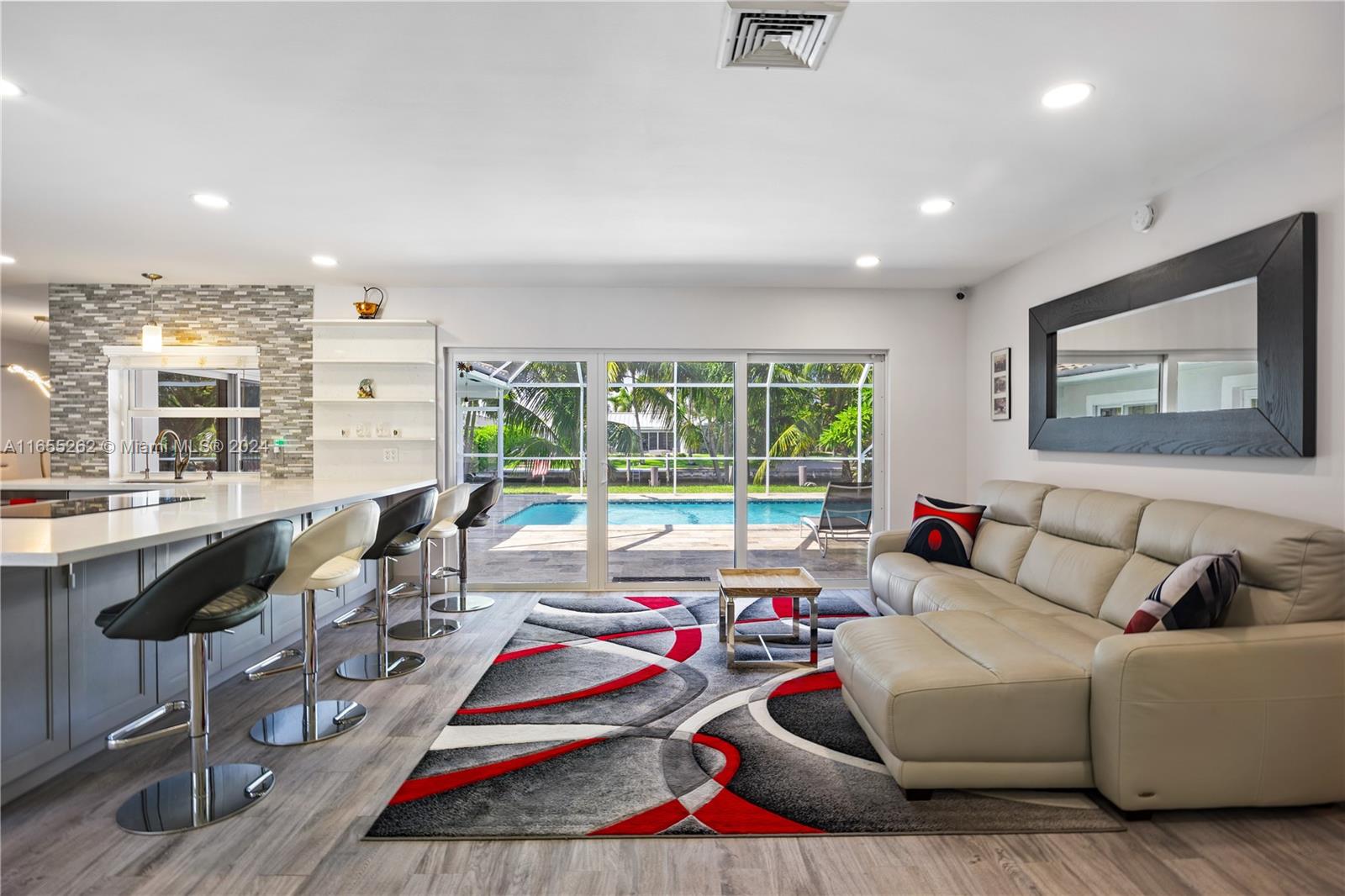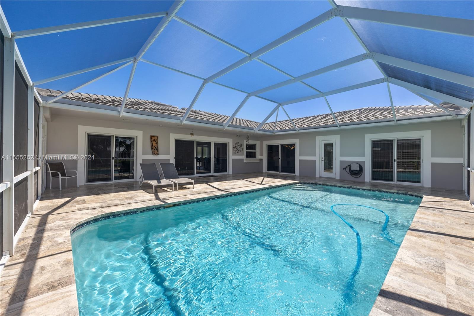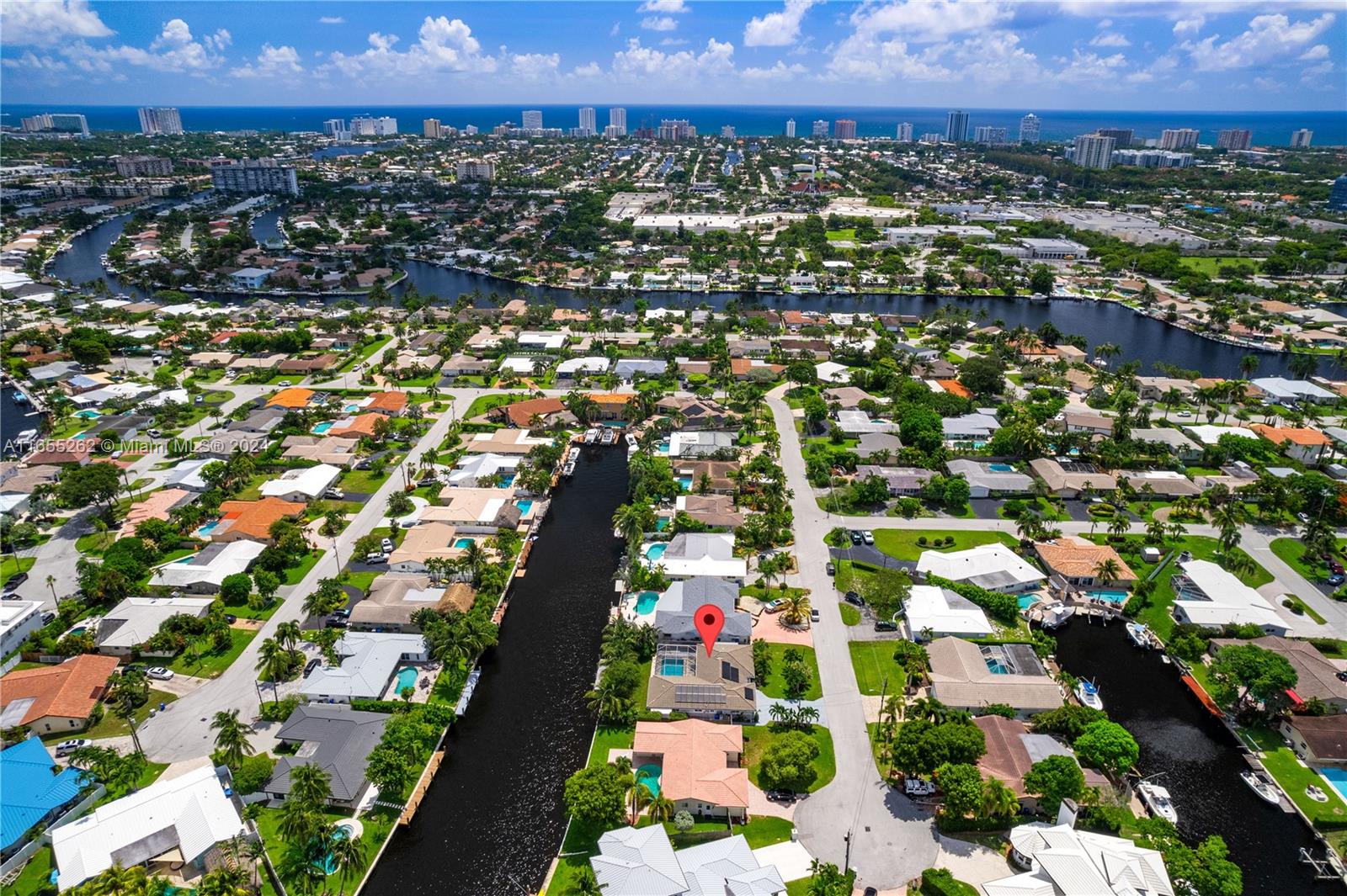 Rarely available stunning waterfront property in the desirable High Ridge Estates. Spacious 3/2 features open layout seamlessly combines the living, dining, and kitchen areas, with abundant natural light. The kitchen features modern appliances, while an adjacent office space, and a media room offers convenience & fun on movie nights/ game days. Step outside to a travertine patio surrounding a sparkling pool, ideal for relaxation.The home features a 30' boat dock & many eco-friendly features, solar system, new roof (2020), & impact windows /doors. Located in a quiet Cul-de-Sac, minutes from the beach! Close to restaurants, shopping, golf, highways and airport. Don't miss out on this waterfront oasis situated at higher elevation.Low insurance.