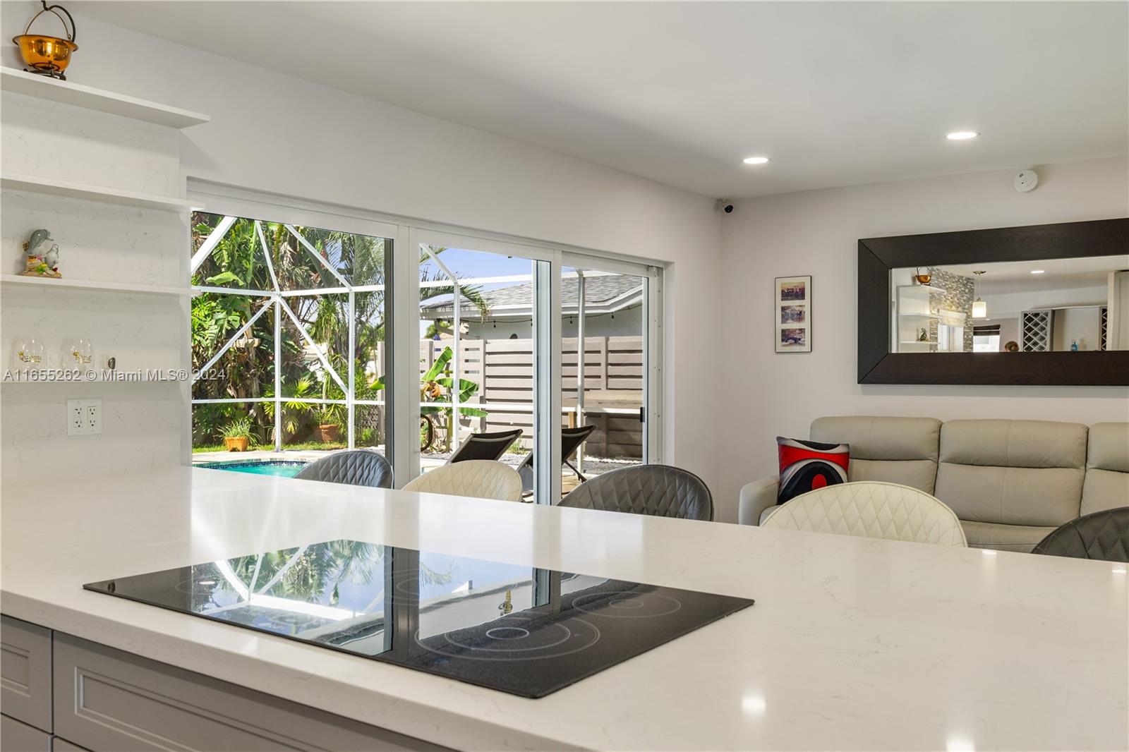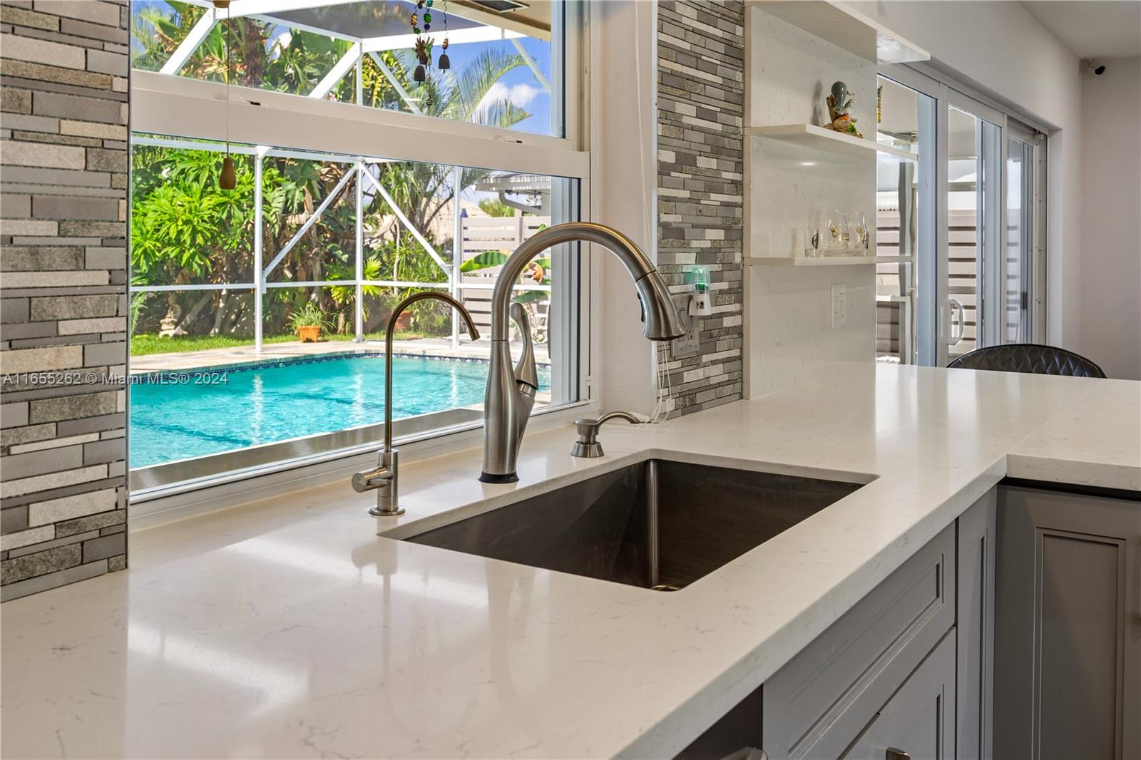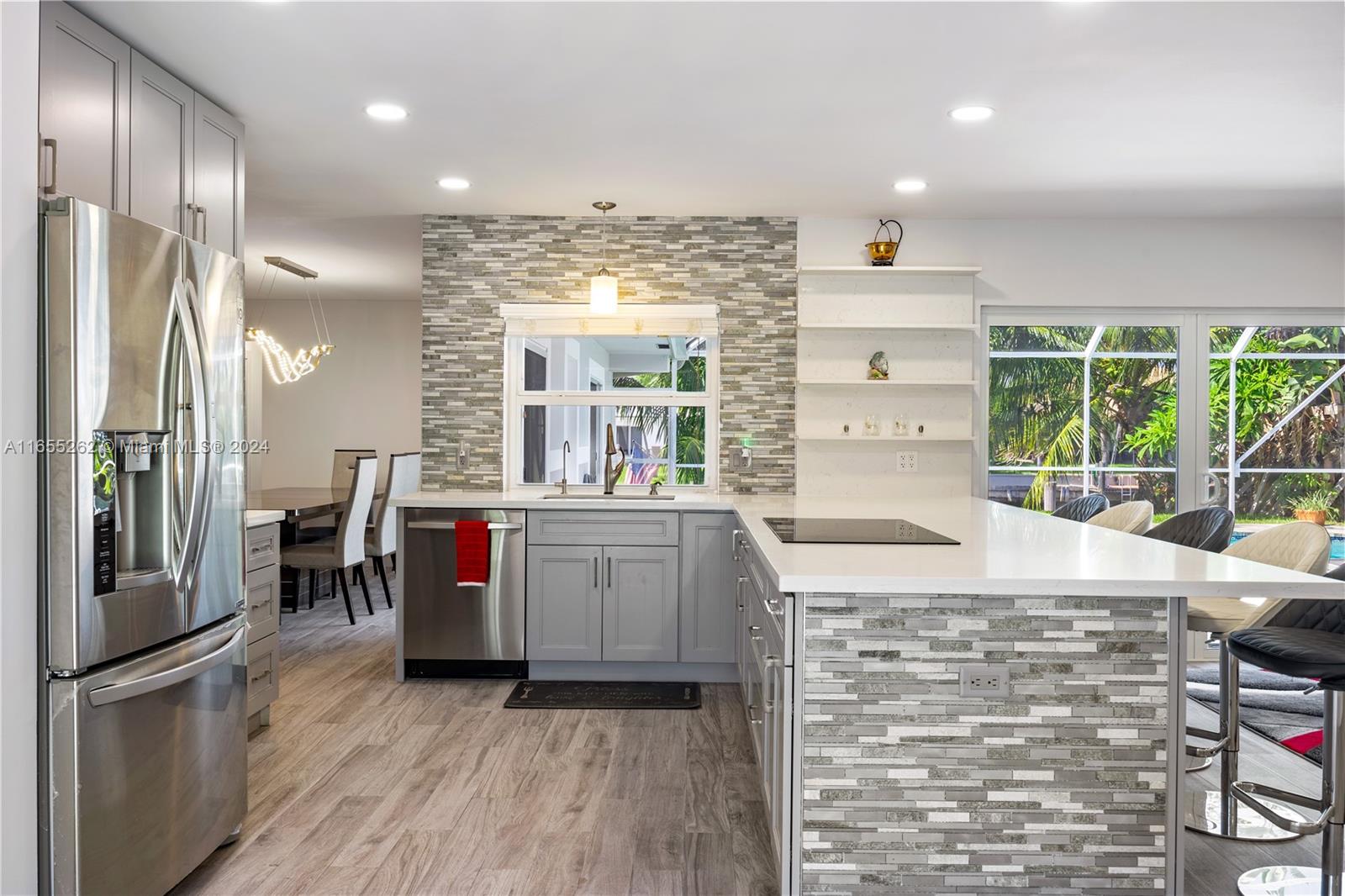 Rarely available stunning waterfront property in the desirable High Ridge Estates. Spacious 3/2 features open layout seamlessly combines the living, dining, and kitchen areas, with abundant natural light. The kitchen features modern appliances, while an adjacent office space, and a media room offers convenience & fun on movie nights/ game days. Step outside to a travertine patio surrounding a sparkling pool, ideal for relaxation.The home features a 30' boat dock & many eco-friendly features, solar system, new roof (2020), & impact windows /doors. Located in a quiet Cul-de-Sac, minutes from the beach! Close to restaurants, shopping, golf, highways and airport. Don't miss out on this waterfront oasis situated at higher elevation.Low insurance.