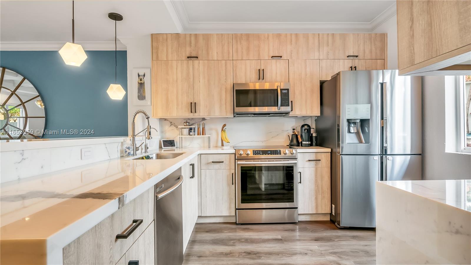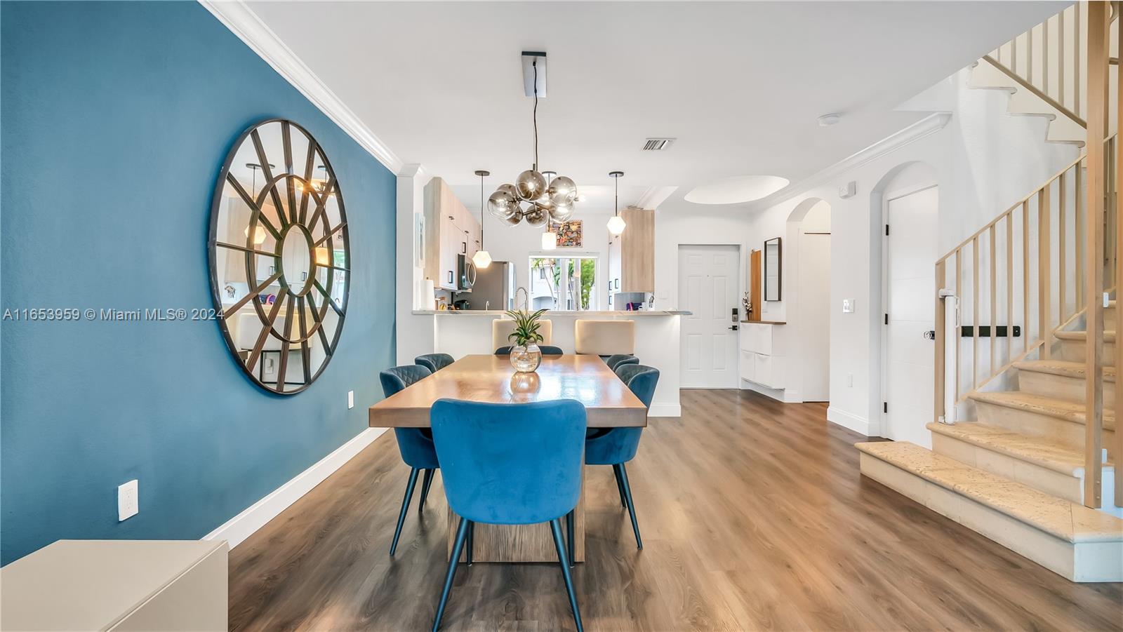 Stunning 3-bedroom, two full bathrooms, and half bath downstairs, with two assigned parking spaces, all impact windows, and sliding doors. Perfect for both comfortable living and entertaining with high ceilings. An open-concept design that seamlessly connects the living room, dining area, kitchen, stainless appliances, and marble countertops. Luxurious three bedrooms, with a master suite with a private bath with a huge master closet, two full bathrooms, and one half bath downstairs, with contemporary fixtures and an outdoor oasis patio. The private backyard offers the perfect relaxation space and outdoor gatherings. A gated community is located close to Whole Foods, Ross, Aldi, Michaels, etc., within walking distance to shops, dining, entertainment, and a tennis center.