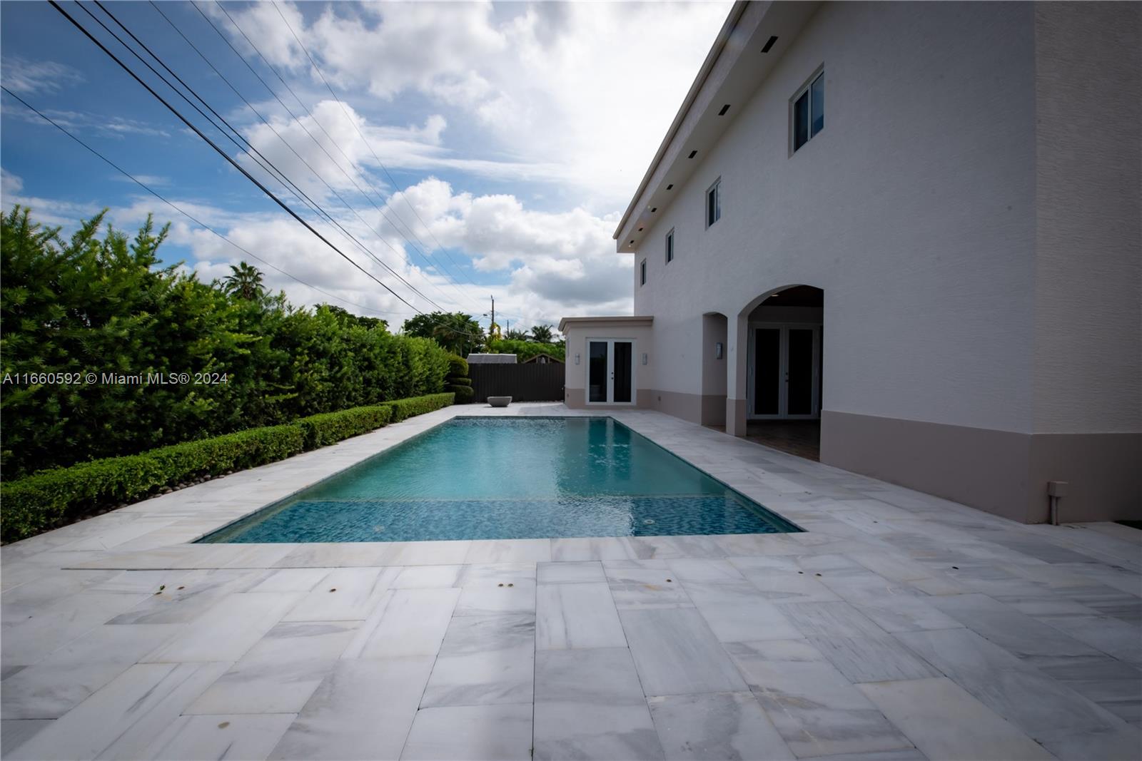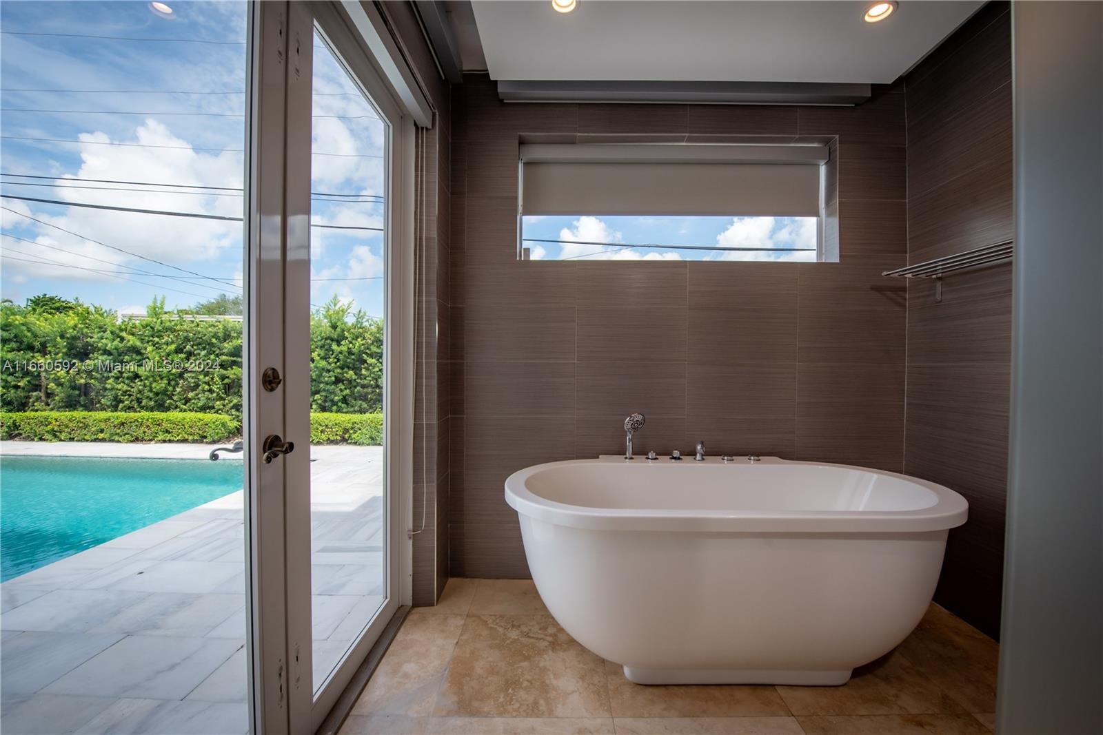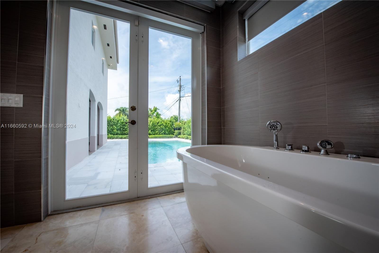 Stunning 4 bed, 3 bath home featuring high ceilings and 8ft doors. Enjoy a gas-heated pool and natural gas connections for a BBQ and fire pit. The kitchen is a chef's dream with Thomasville wood cabinets, marble countertops, and stainless steel appliances. Relax on the tiled terrace with wood ceilings, or retreat to the master suite with cove lighting, a luxurious bath with double sinks, a freestanding jet tub, and a rainfall shower. The media room includes an 80" TV, custom cabinetry, wine cooler, and bar sink. Upstairs, a Jack-and-Jill bathroom connects two bedrooms, while the guest bath offers added convenience. All bathrooms feature glass enclosures. Additional highlights include blackout shades with rails, electric shades in the master suite, and some hurricane impact windows.