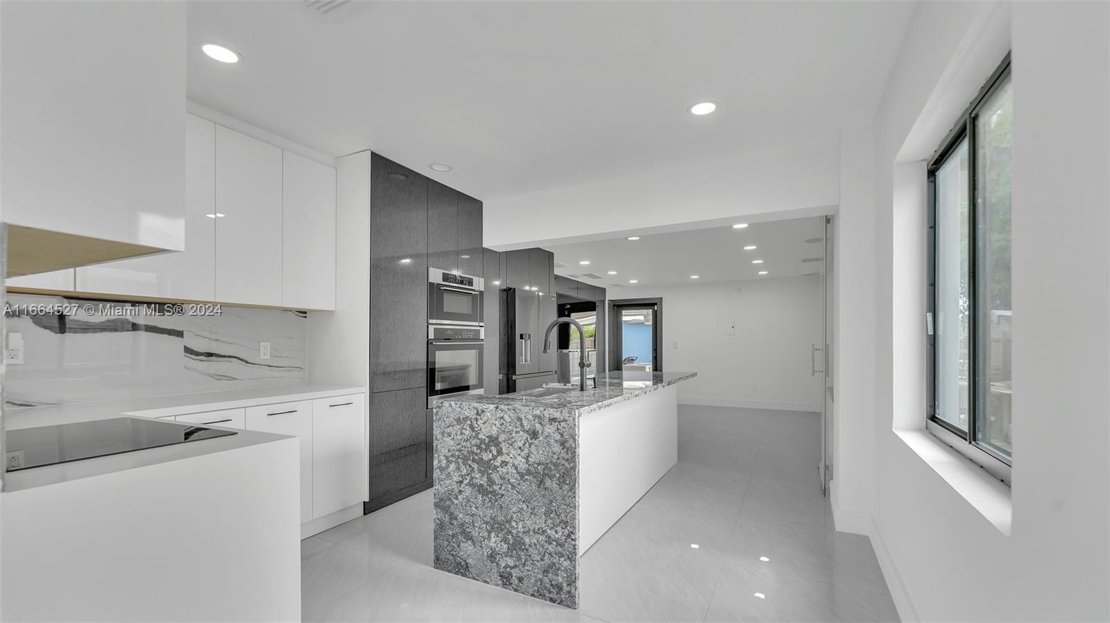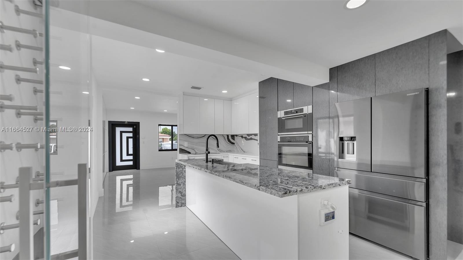 Investors dream. This property consists of a Luxurious & tastefully updated 3/2 Smart Home in the front & an updated, well distributed 2/2 dwelling in the rear of the property. The driveway accommodates up to 9 cars. Lateral space fits an RV and/or a boat. Front smart home features a special order 2023 blue metal roof, impact windows & doors, a 9-camera security system, imported Italian acrylic on walls, closet doors & panels & exterior door trims, a chefs dream kitchen with a rare Blue Bahia countertop cooking island, electric cooktop, separate wall oven & wall microwave + an integrated dishwasher, a SECRET HIDDEN master bedroom, and a covered terrace w/ custom ceiling panels, a refrigerator, & waterproof kitchen cabinets, island, & wall decking.