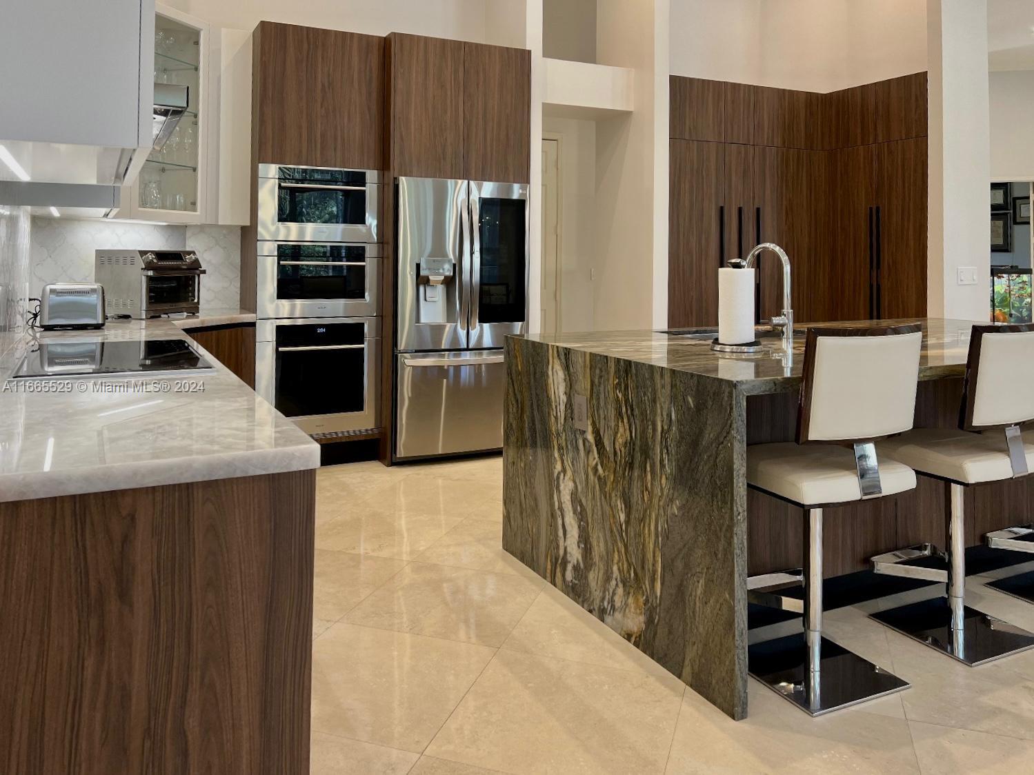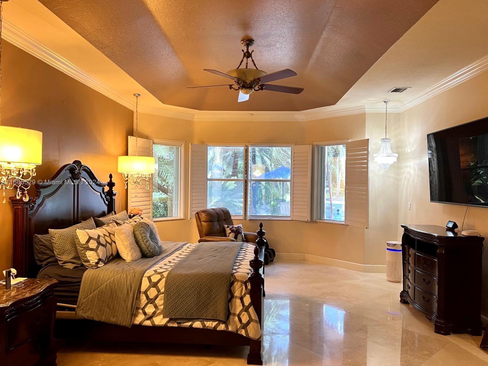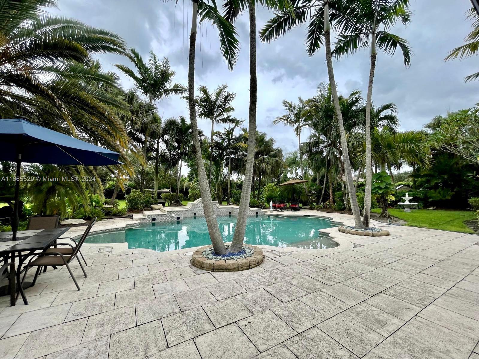 This amazing home is located on 1 1/2 acre water lot with palms & fruit trees. It has a circular paved driveway, with 3 car garage, split floor plan & 15ft high ceilings. The best fixtures are the new kitchen, designed by Mia Cucina & Wolf appliances; roof from 2024, new main electrical panel from 2023, 3 AC from 2023, impact windows & shutter combination & the last generation Tesla charger located in the garage. One of the garages has been converted into a Gym with a Sauna! The entrance leads to the main space, to the left, office & the master bedroom with a modern bathtub & huge walk-in shower. to the right, 3 bedrooms with baths, laundry, gym & garage. The backyard has a lot of potential, enough space for a mini golf and tennis court.