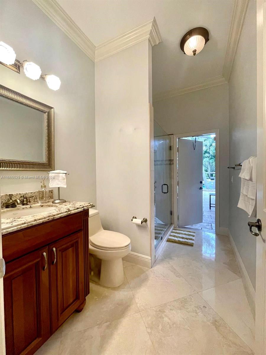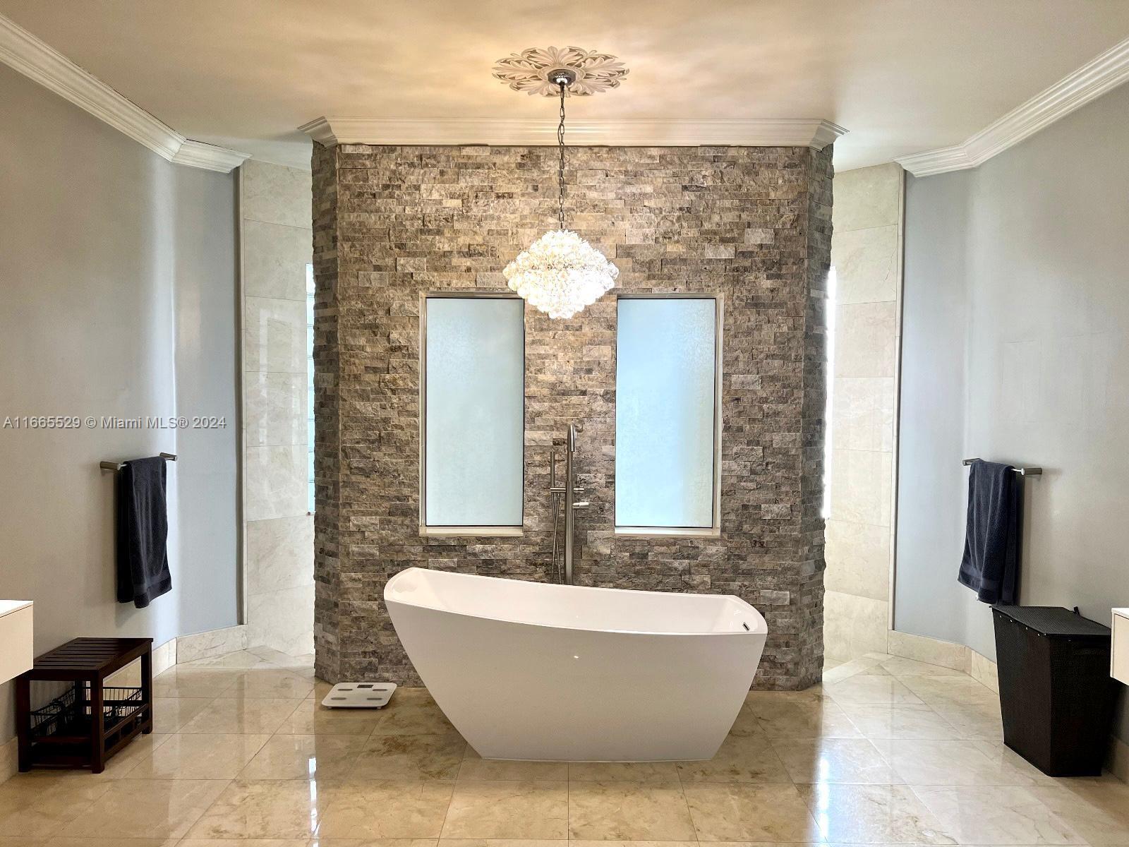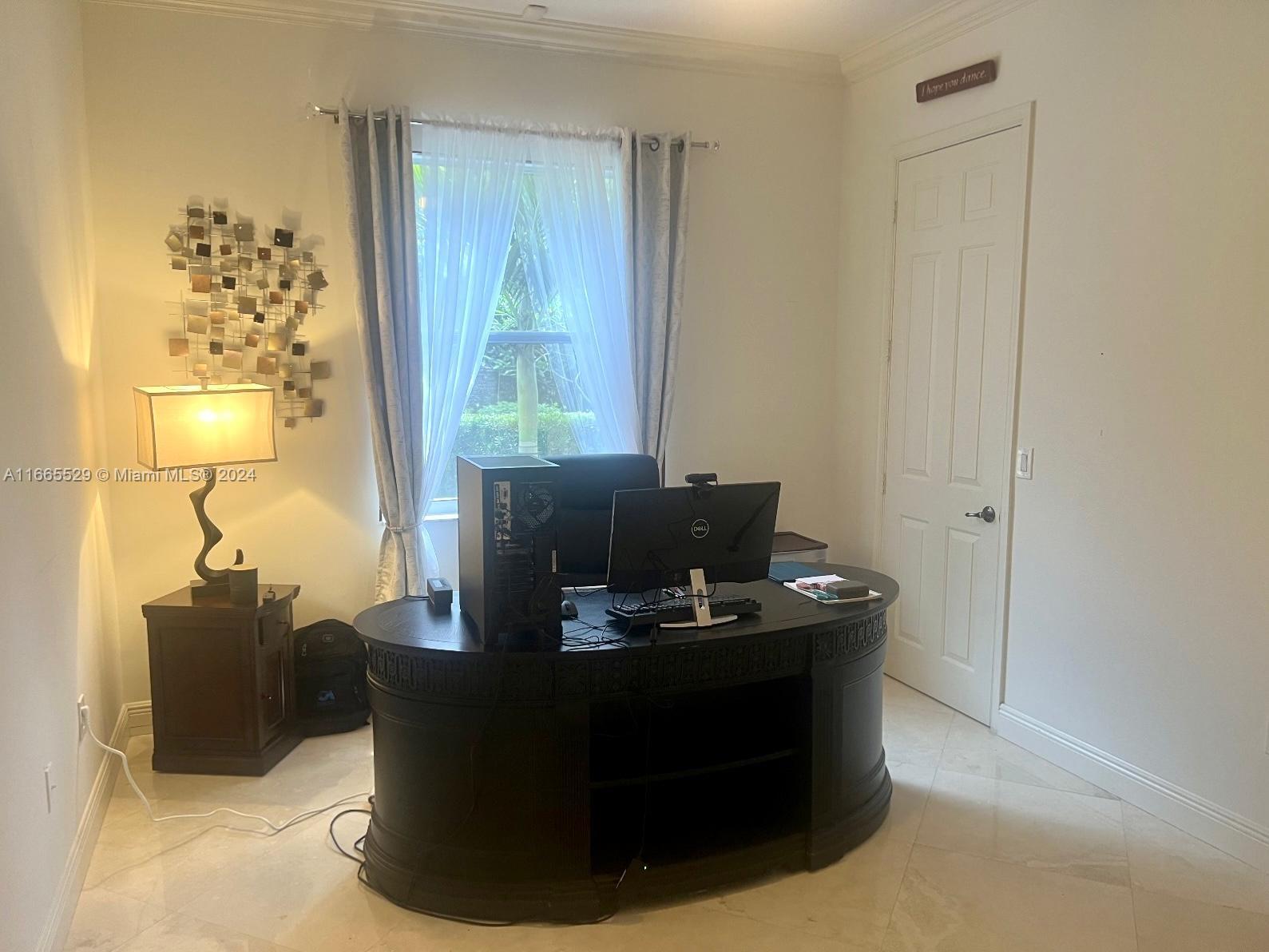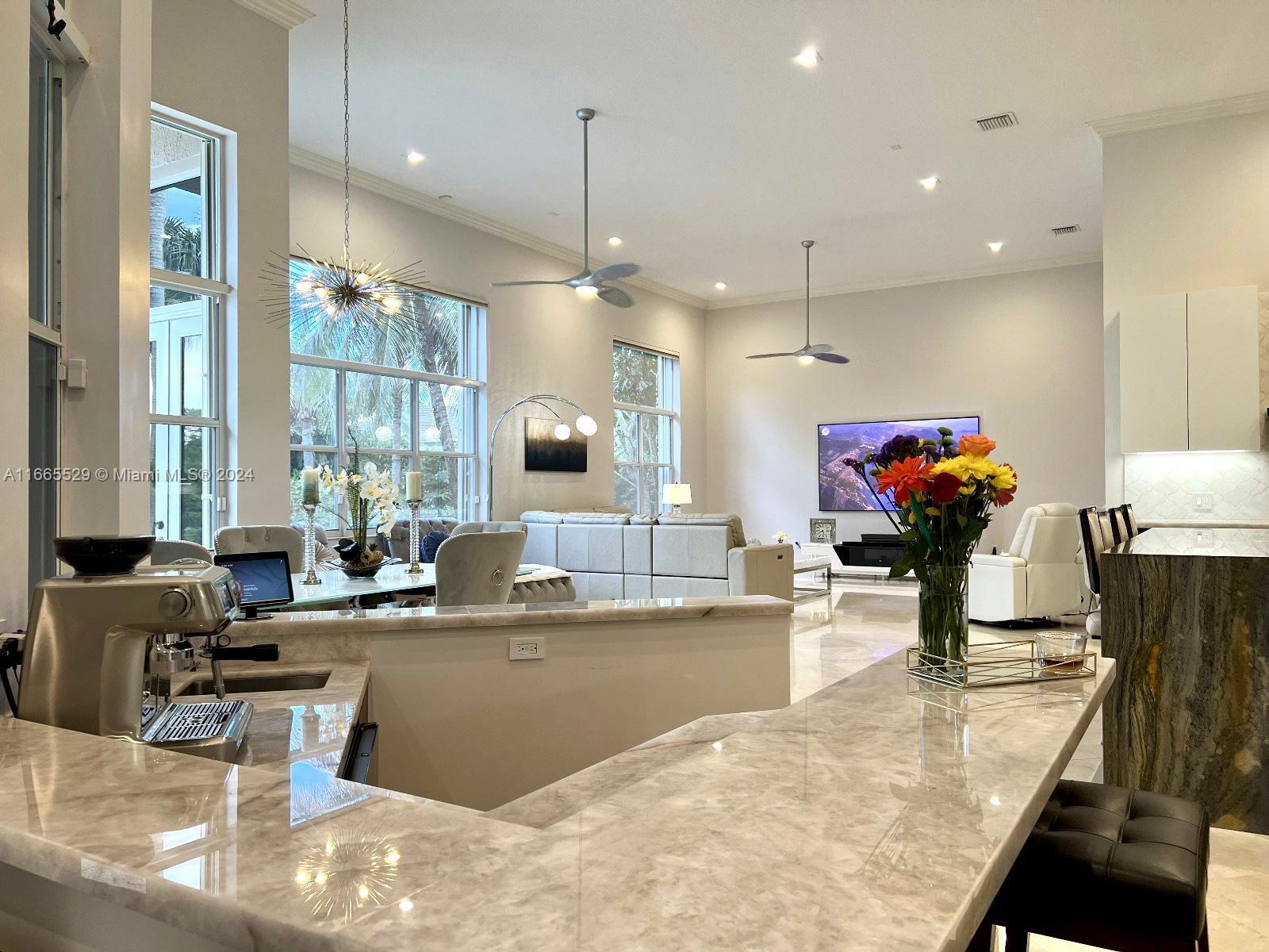 This amazing home is located on 1 1/2 acre water lot with palms & fruit trees. It has a circular paved driveway, with 3 car garage, split floor plan & 15ft high ceilings. The best fixtures are the new kitchen, designed by Mia Cucina & Wolf appliances; roof from 2024, new main electrical panel from 2023, 3 AC from 2023, impact windows & shutter combination & the last generation Tesla charger located in the garage. One of the garages has been converted into a Gym with a Sauna! The entrance leads to the main space, to the left, office & the master bedroom with a modern bathtub & huge walk-in shower. to the right, 3 bedrooms with baths, laundry, gym & garage. The backyard has a lot of potential, enough space for a mini golf and tennis court.