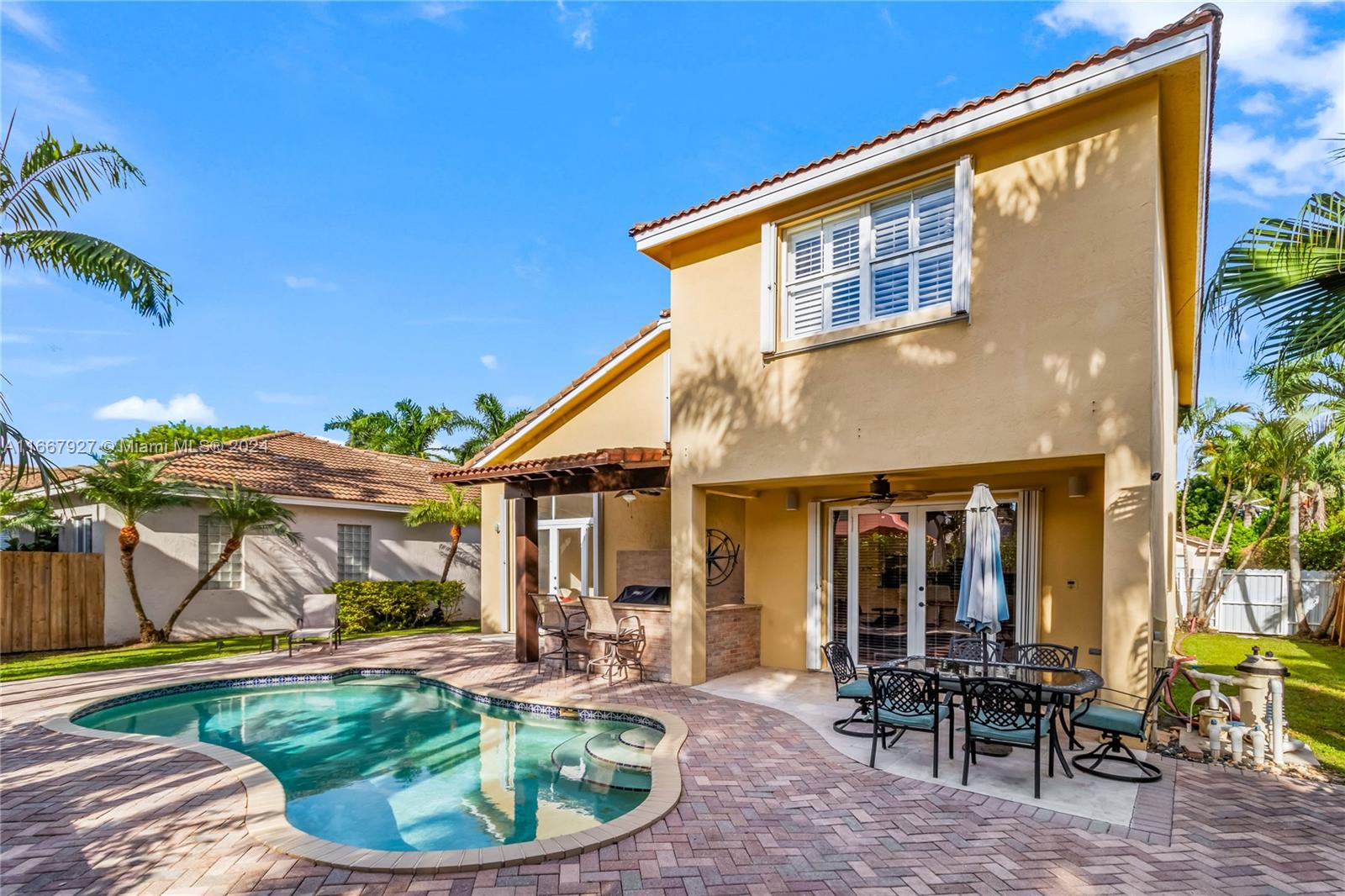 Amazing corner house with 3 beds, 2 and half baths located in the desired City of Doral. Gated community, private, quiet, low association fee. High ceiling at the formal dining and sitting rooms. Custom-made Georgian blinds. Many windows offering a lot of sunshine. Open kitchen with SS appliances and many cabinets. Marble and wood on the first floor; laminate on the second floor. Spacious master bedroom with custom closets. Blackout shades on bedrooms. Renovated bathrooms. Accordion Shutters. Spacious backyard with lots of green, big pool and barbecue area. Automatic garage fits 2 cars and has shelves. Plenty of guest parking. Closed to Turnpike, parks, dog park, restaurants, Publix, TJMAXX, shops, UM Urgent Care, Baptist, Doral Art Center and more.
