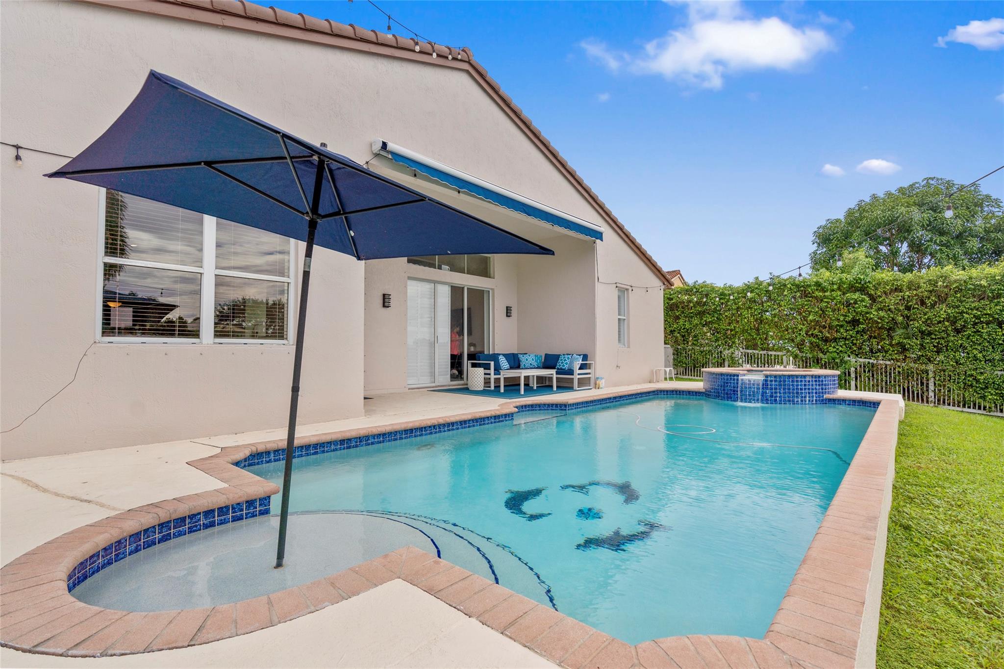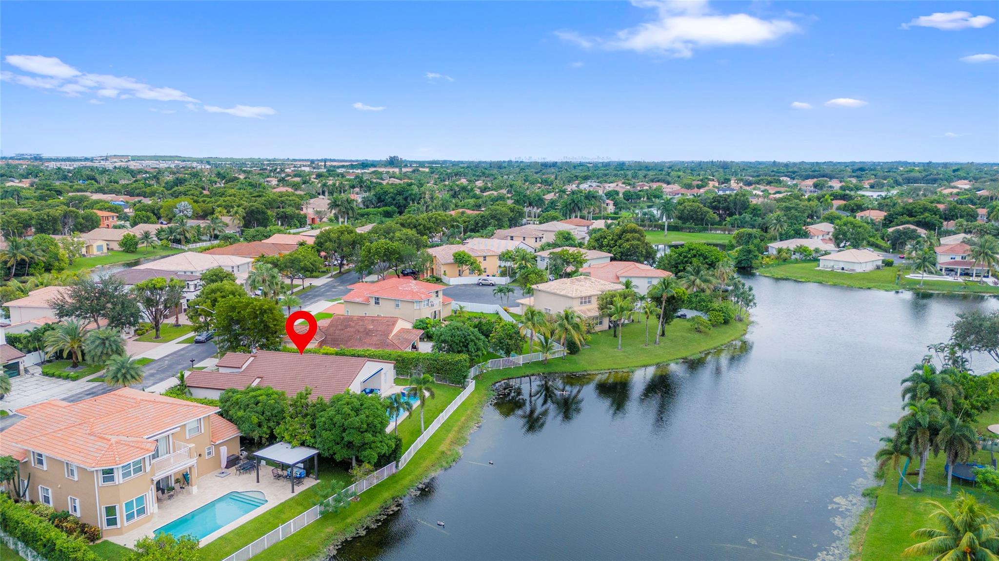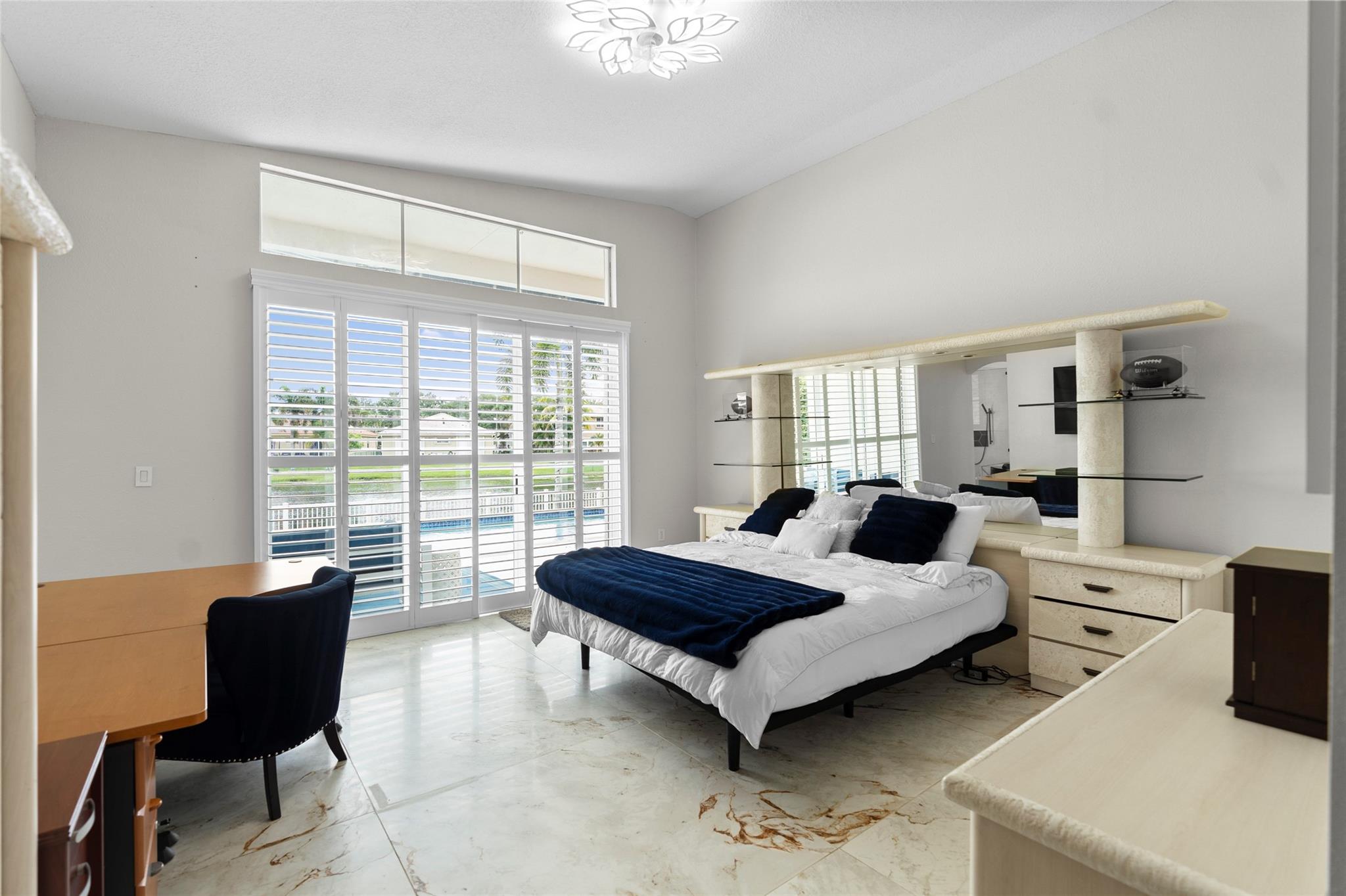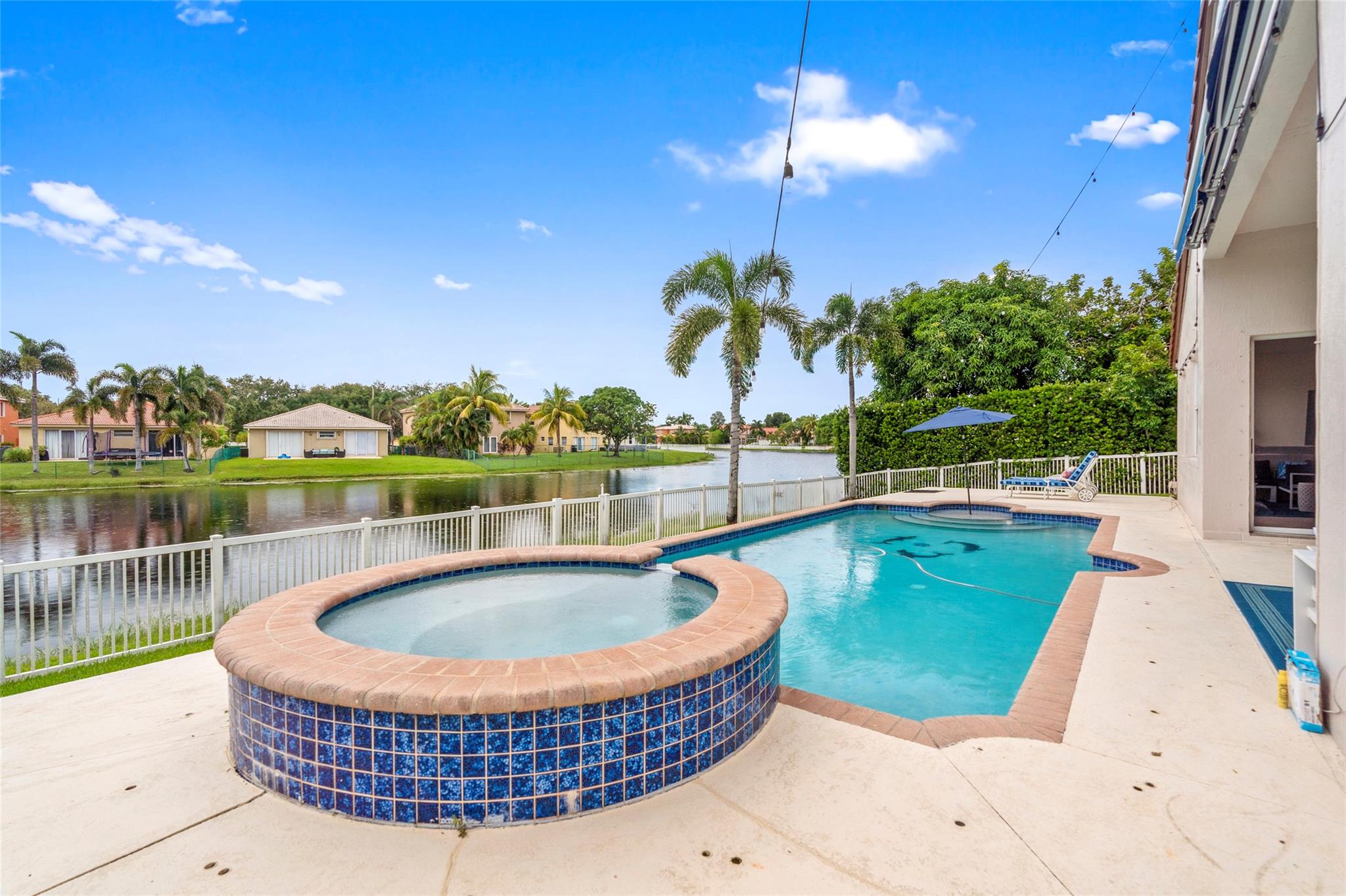 Welcome to your perfect oasis! This meticulously updated 4 BD, 3 BA, lakefront home has a 3 car garage in a gated community. The massive remodeled kitchen has rich wood cabinets, Quartzite countertops, stainless appliances and a gourmet range/oven/hood which flows seamlessly into the family room for open concept living. Spacious primary bedroom with fabulous lake views has a walk-in closet, plantation shutters, and a spa-like en-suite with granite top dual vanities, automatic bidet toilet, huge shower & a jetted soaking tub. Enjoy front-row seats to breathtaking sunsets over a tranquil lake with a sparkling pool & a retractable awning for those who appreciate the serenity of lakeside living. A pristine home with modern bathrooms, porcelain tile with an epoxy finish and volume ceilings.