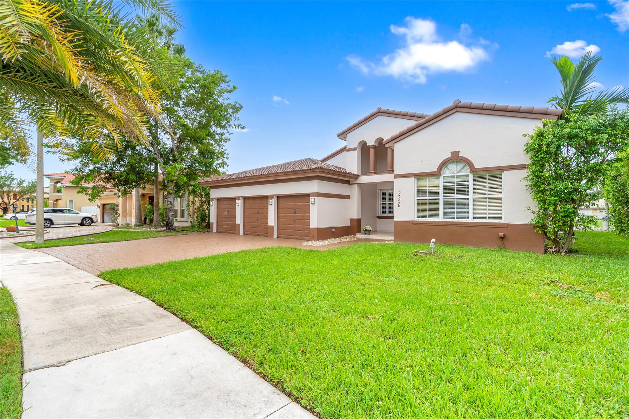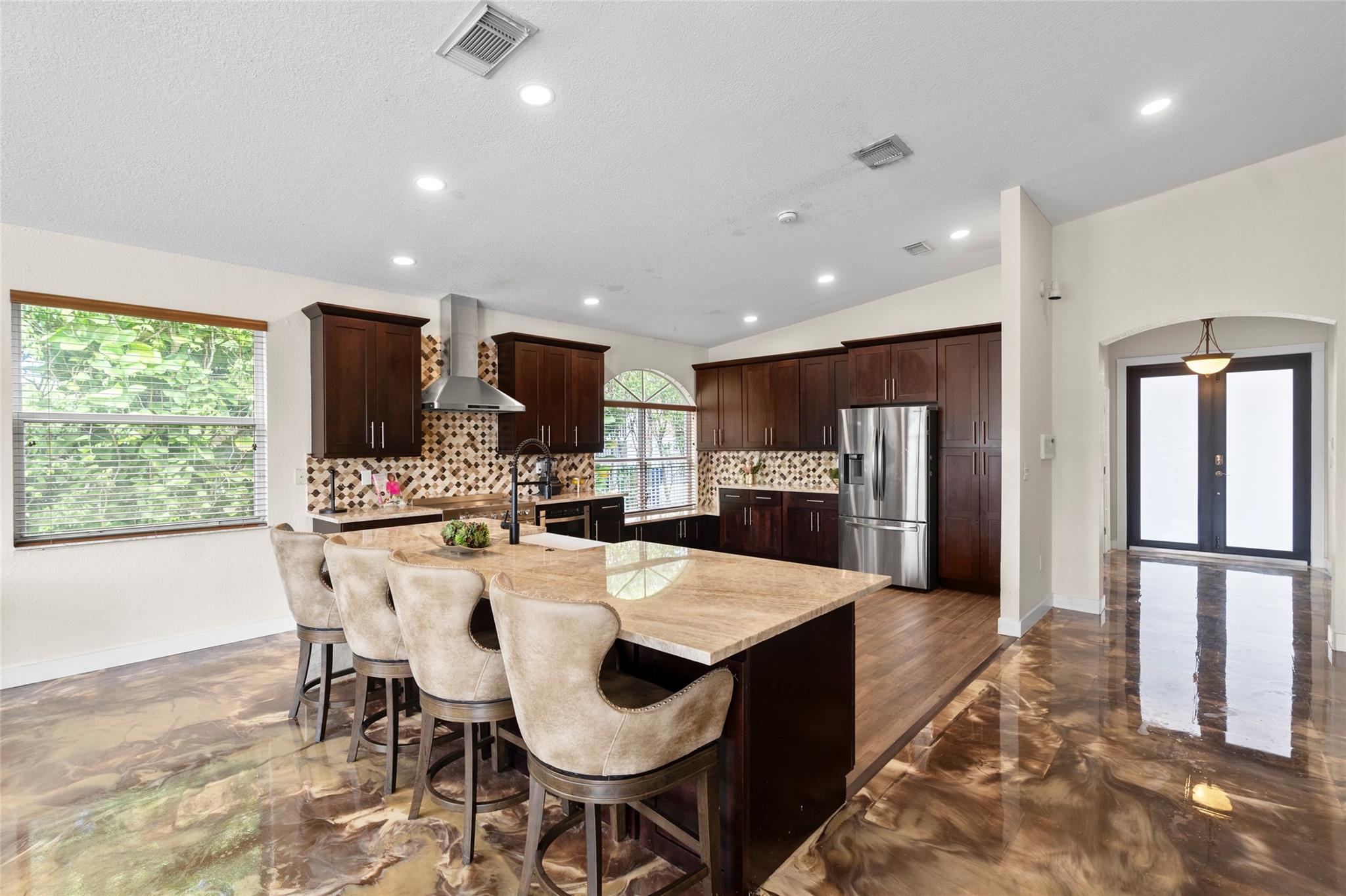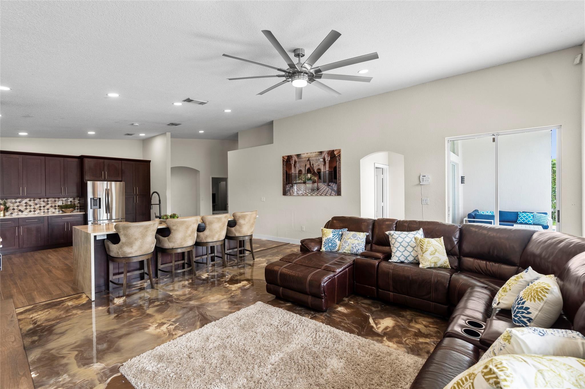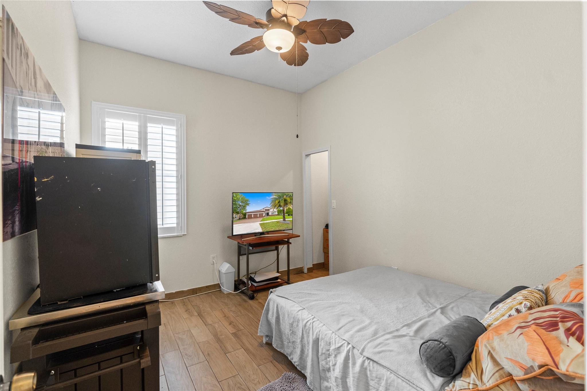 Welcome to your perfect oasis! This meticulously updated 4 BD, 3 BA, lakefront home has a 3 car garage in a gated community. The massive remodeled kitchen has rich wood cabinets, Quartzite countertops, stainless appliances and a gourmet range/oven/hood which flows seamlessly into the family room for open concept living. Spacious primary bedroom with fabulous lake views has a walk-in closet, plantation shutters, and a spa-like en-suite with granite top dual vanities, automatic bidet toilet, huge shower & a jetted soaking tub. Enjoy front-row seats to breathtaking sunsets over a tranquil lake with a sparkling pool & a retractable awning for those who appreciate the serenity of lakeside living. A pristine home with modern bathrooms, porcelain tile with an epoxy finish and volume ceilings.