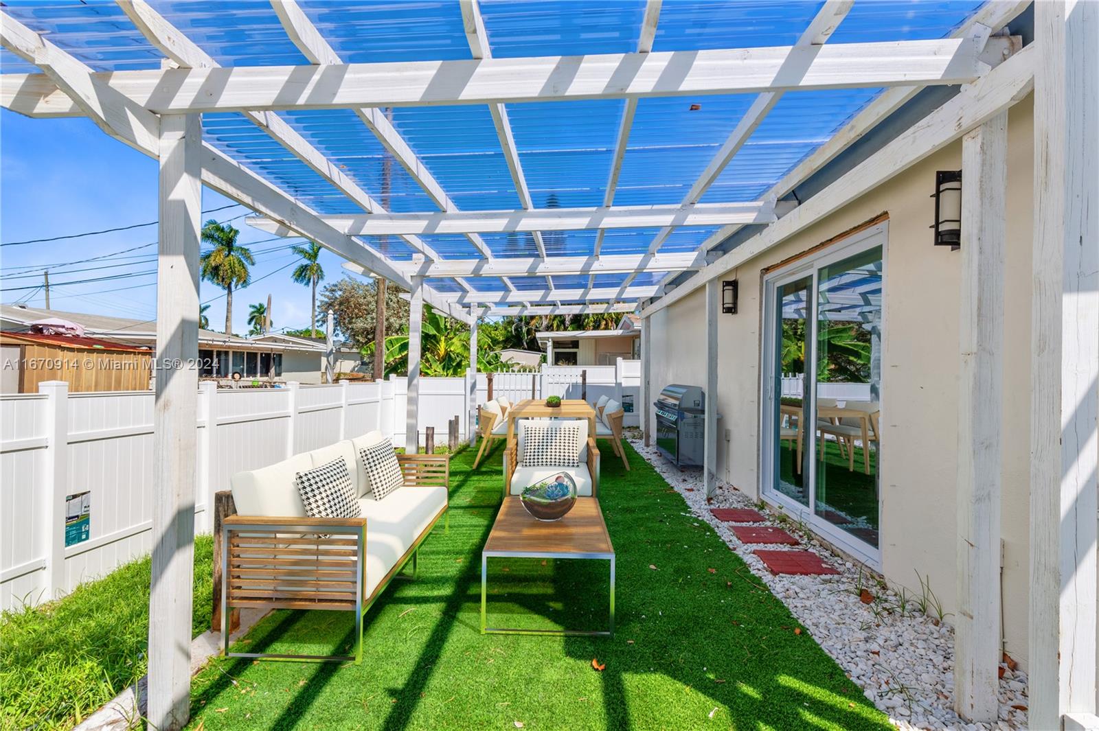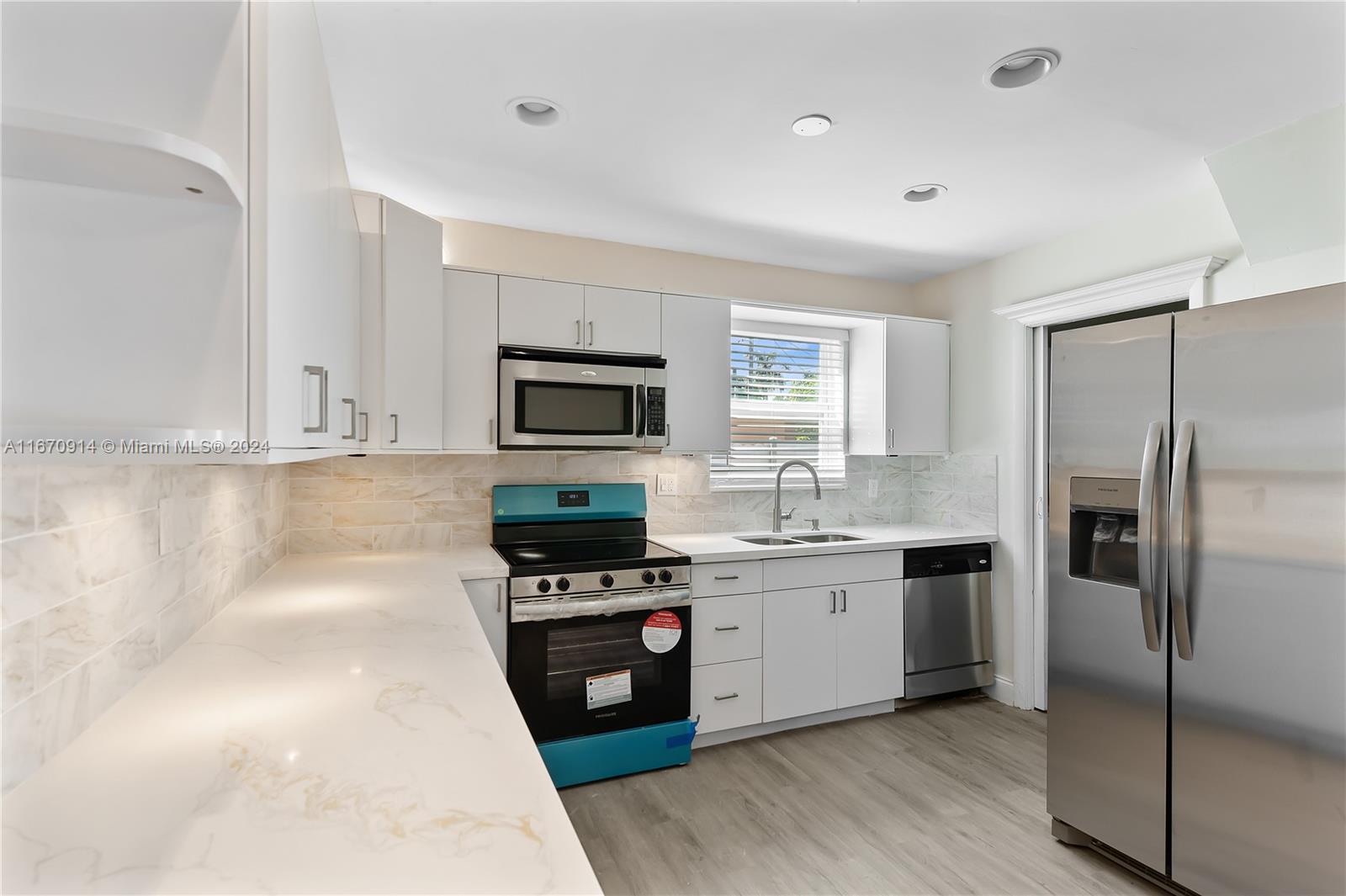 Stunning modern renovation of single-family home in a booming area of Hallandale Beach. Property includes 3 bedrooms and 2 bathrooms. Master bedroom has a walk-in closet with large attached bathroom with double vanity sink. Renovations include new roof, new hurricane windows/doors, new waterproof flooring, quartz countertops in kitchen, appliances, washer/dryer, updated bathrooms and kitchen, lighting improvements, and paved driveway. Property has open layout with designated dining area, living room, and entertainment room. Covered patio and shed in backyard along with a new PVC fence. Landscaping improvements give the property great curb appeal. This property won't last long, so come and take a look!