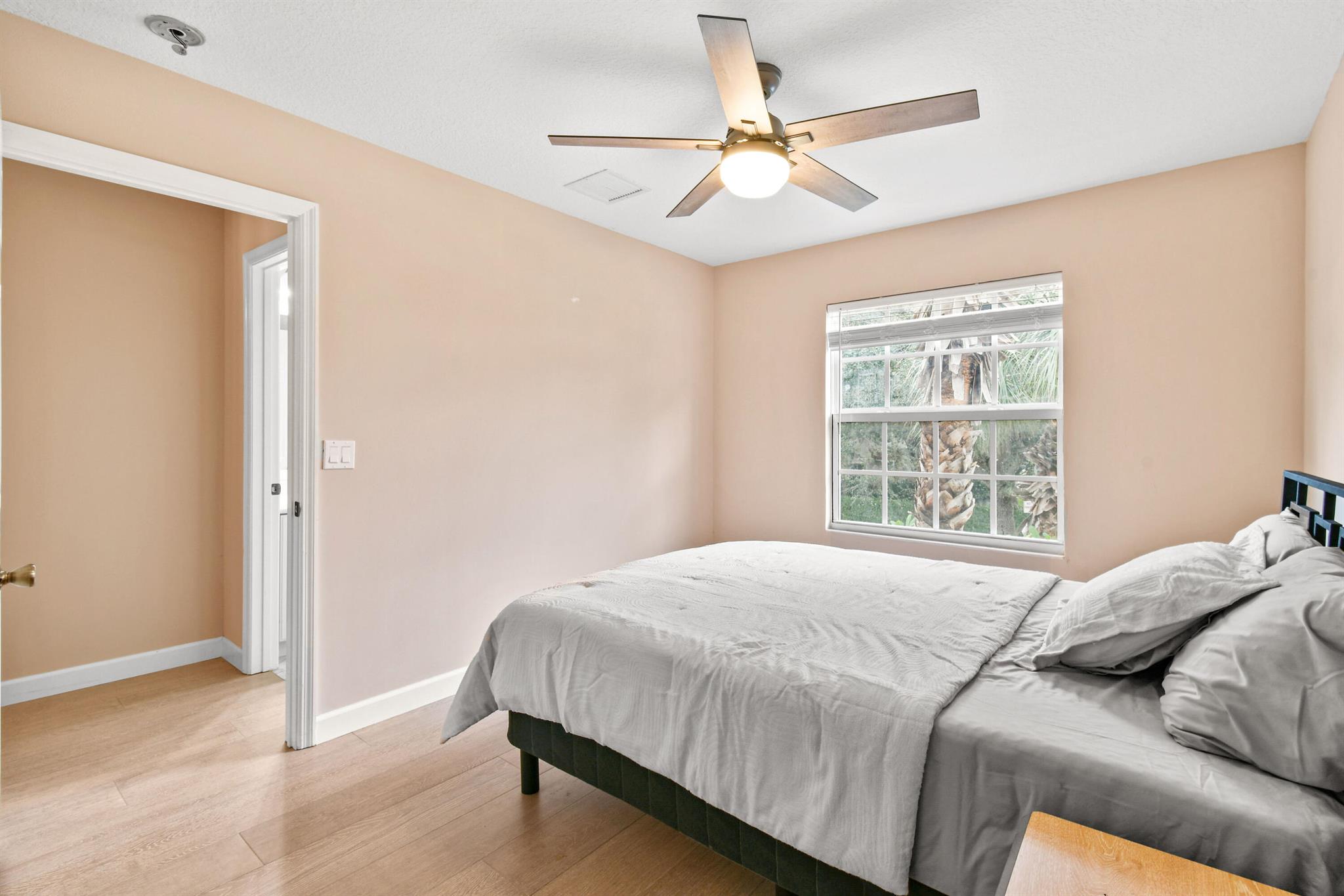 Villa Palma at Northlake is a gated community that welcomes pets and features a small dog park along with sidewalks for leisurely strolls. This 4-bedroom, 2.5-bathroom residence has a saltwater pool, a fenced yard, and a screened porch equipped with seating, a built-in grill, and a mini fridge. The backyard has an open dining patio adjacent to the pool, complemented by banana trees that enhance the lush landscaping and provide added privacy. Inside, the home features tile flooring on the lower level and laminate upstairs, with a kitchen that includes a gas stove and a spacious island. The master suite is designed for comfort, featuring a walk-in closet and a master bathroom with dual sinks, a large Roman tub, and a separate shower. NEW ROOF!!