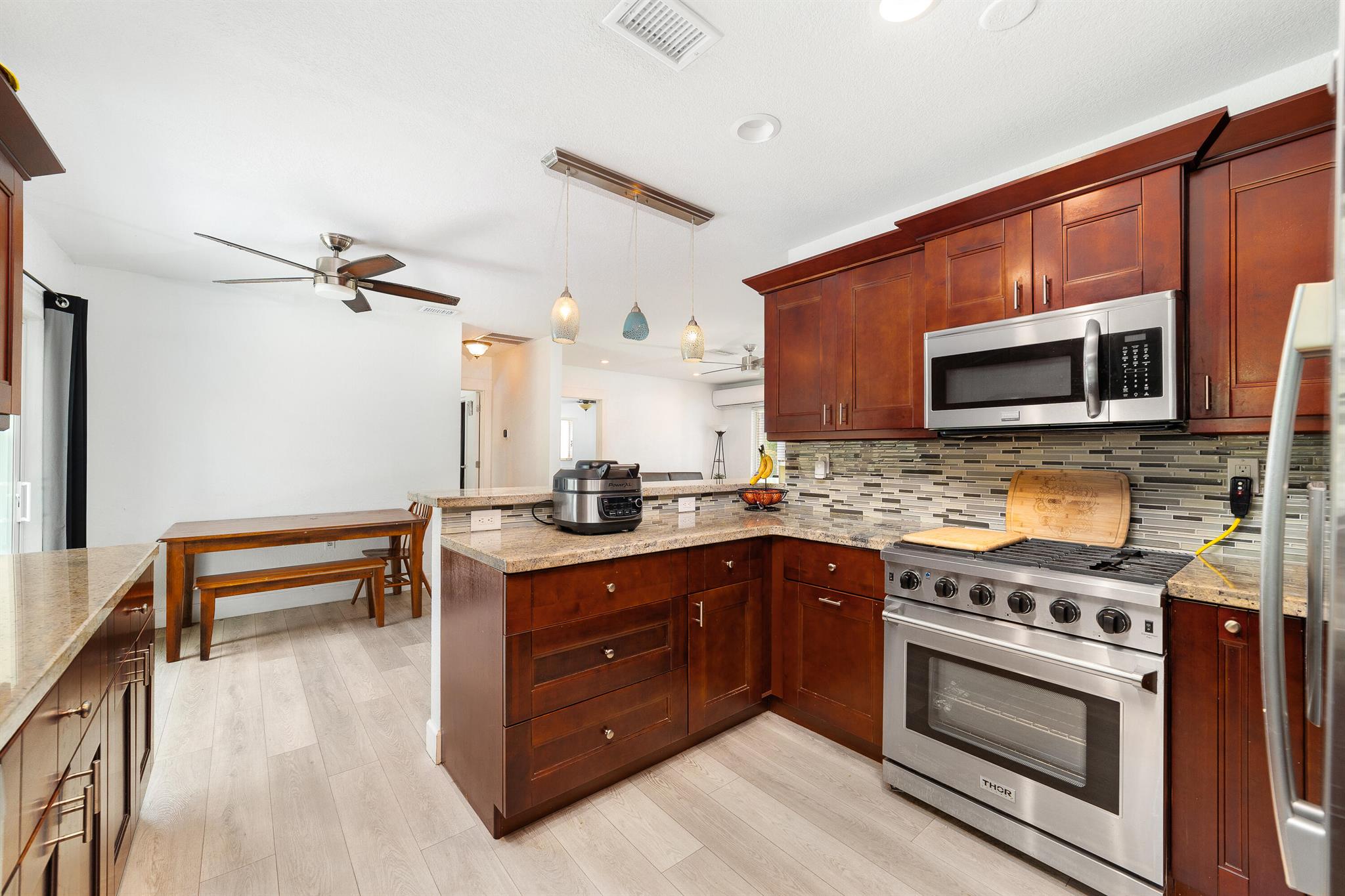 This stunning, fully renovated 3-bedroom, 2-bathroom home is located on a cul-de-sac. The home features an open floor plan, allowing an abundance of natural light. The gourmet kitchen showcases custom cherry cabinetry, granite countertops, a stylish tile backsplash, and all stainless steel appliances, including a double sink. The new custom vinyl flooring throughout the home adds a sleek and contemporary touch, while the separate laundry room adds convenience. Full impact doors and windows not only enhance the home's safety but also contribute to energy efficiency, helping reduce insurance and cooling costs. Home has central a/c and mini splits to further save energy!