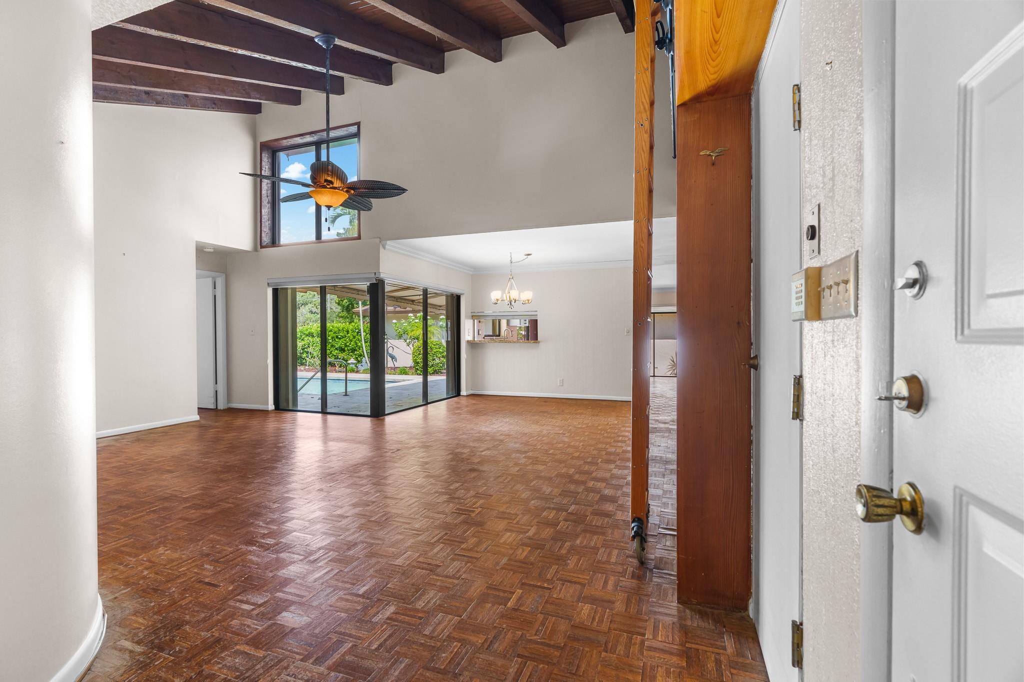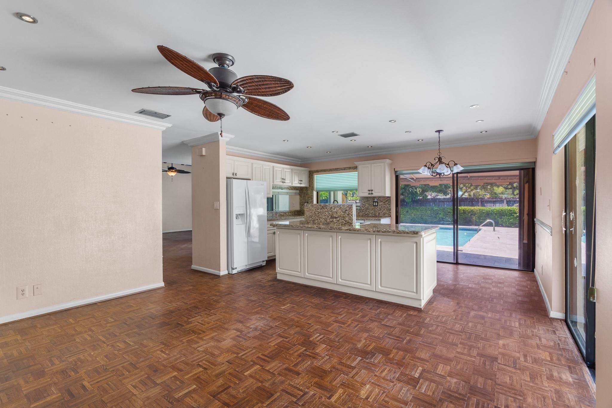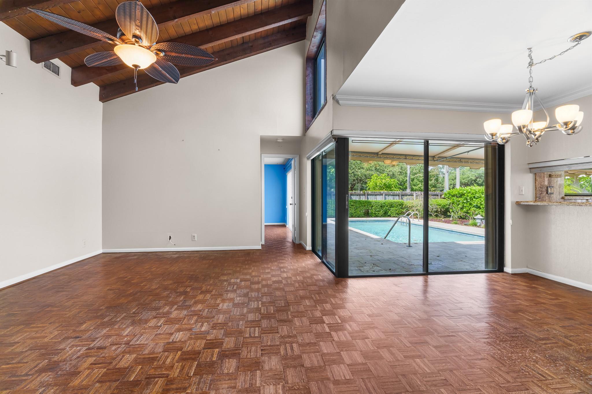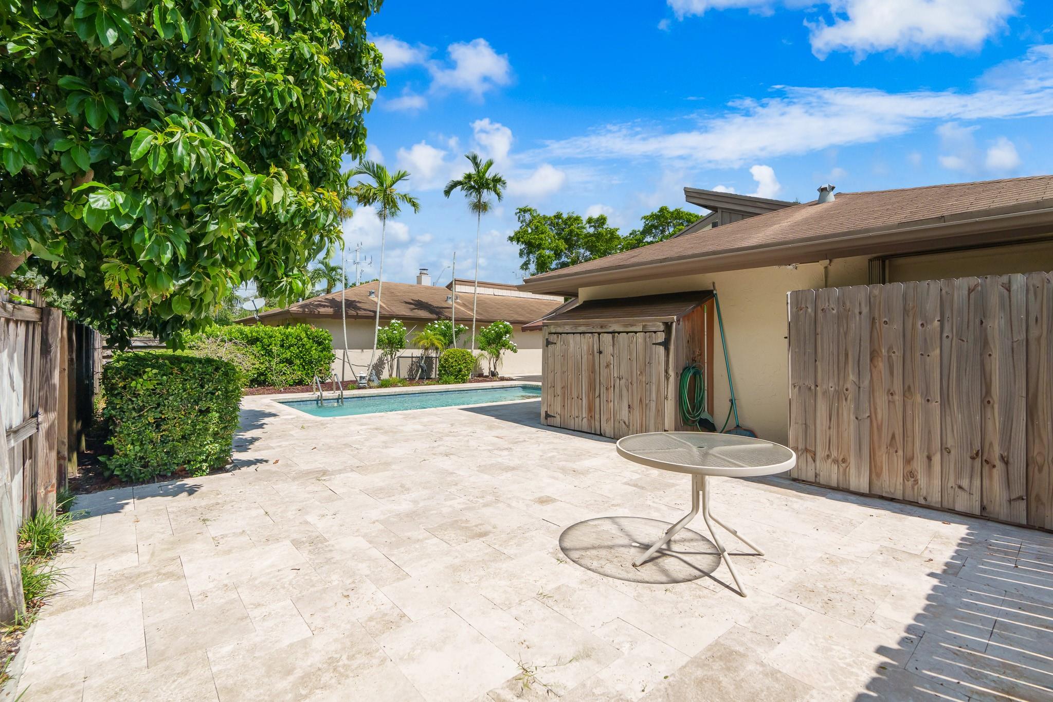Rarely available 3 bed/2.5 bath home located in sought after Woods of Emerald Hills. This home features an oversized 2 car garage w/ potential to convert part of it into an additional bedroom while maintaining storage space. The fenced backyard offers privacy w/ a pool on an oversized lot, complete with storage shed. Tons of natural light from windows & 5 sets of sliding doors all protected by accordion storm shutters. Kitchen features white cabinets & granite countertops. The living room showcases custom built-in shelves w/ a sliding ladder & vaulted exposed wood beam ceilings. Ample storage including linens, pantry, numerous closets w/ built-ins & a primary suite w/ reach-in & walk-in closets. A/C (2021). Conveniently located near houses of worship, restaurants, highways and shopping.
