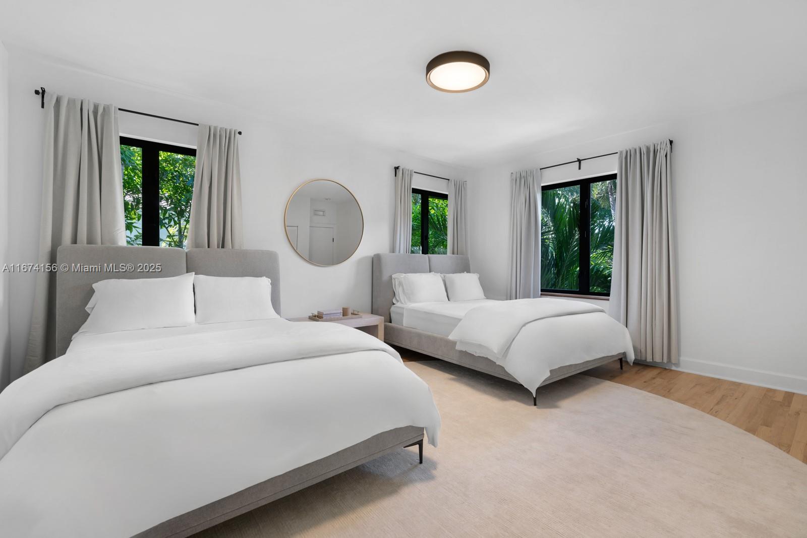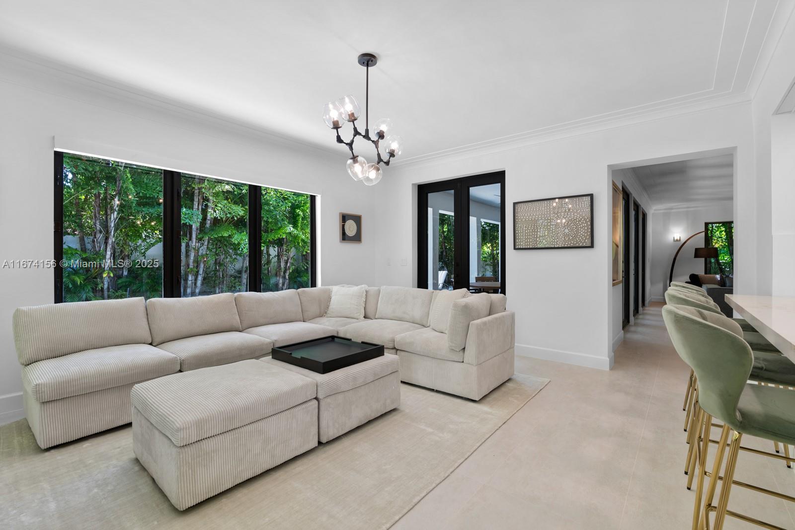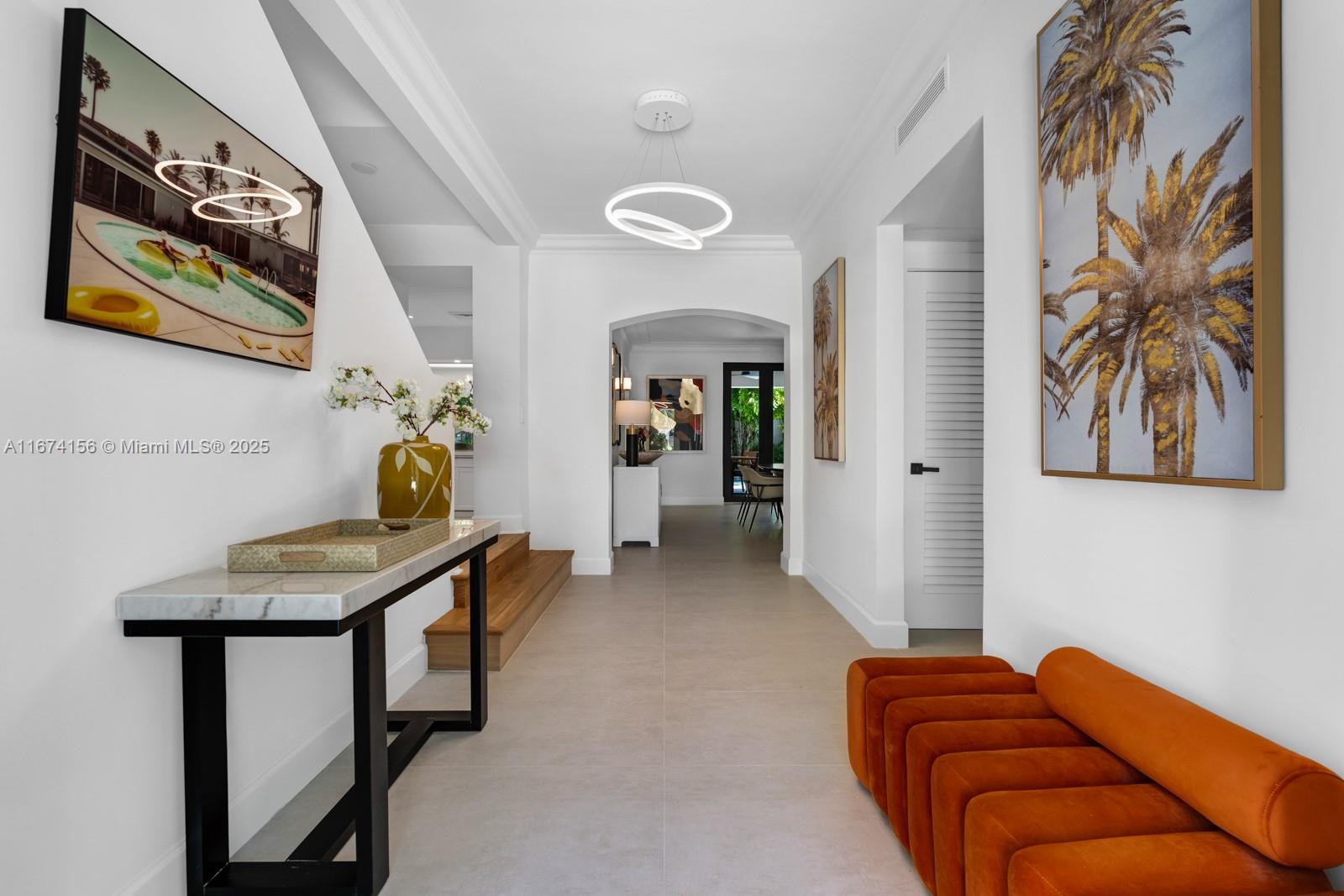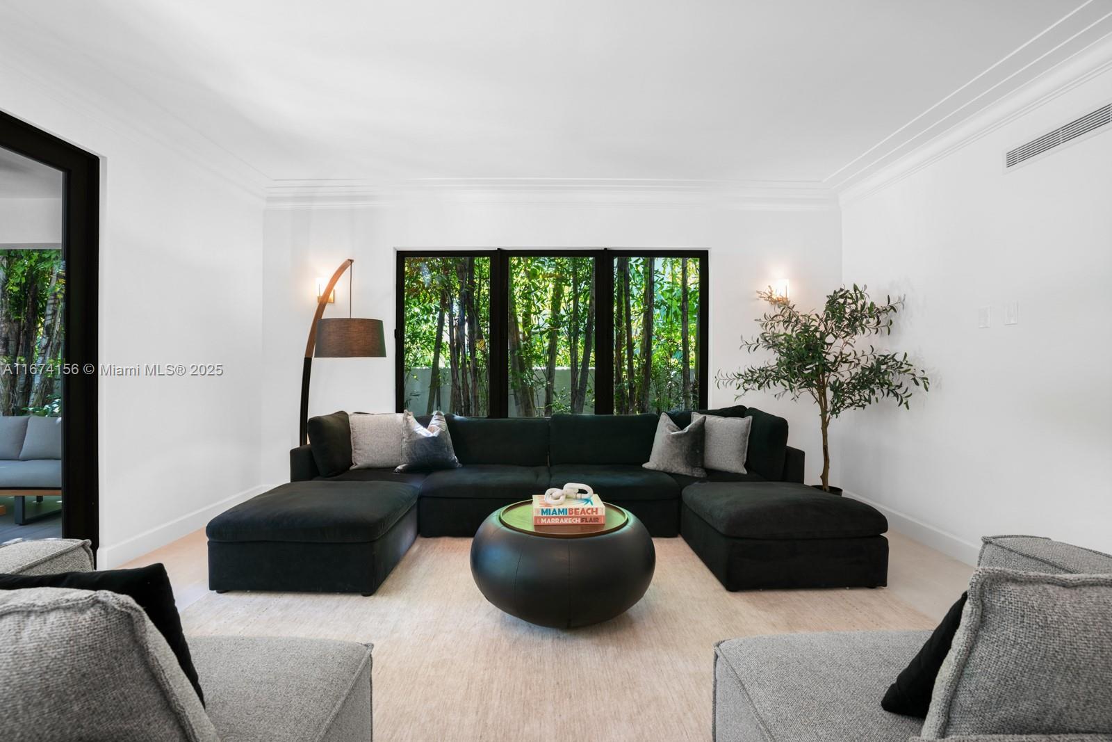 Step Inside With Me! This exquisite Mediterranean restoration is nestled on prestigious Upper North Bay Road, offering privacy and modern luxury. Behind the walled gate, you’ll find a spacious, family-friendly home featuring 5-bed/5-baths. The gourmet kitchen boasts Corian countertops, a large island with a Viking 6-burner gas stovetop, and opens to a sunlit TV room. The primary suite offers a walk-in closet, dual vanities, an oversized tub, and a cozy sitting/office nook. Outside, the lush, tropical backyard invites you to entertain on the expansive covered patio or relax in the heated saltwater pool. With hurricane impact windows, doors, and a 2-car AC garage plus ample parking, this home truly stands out.
