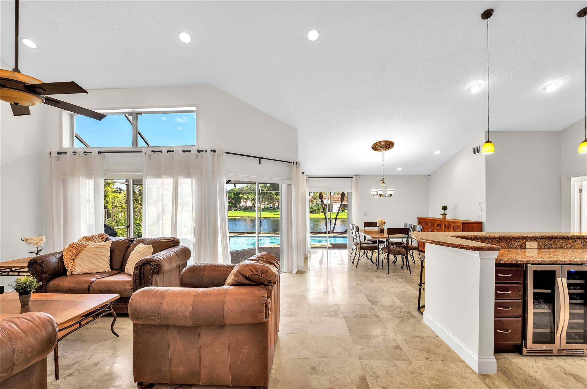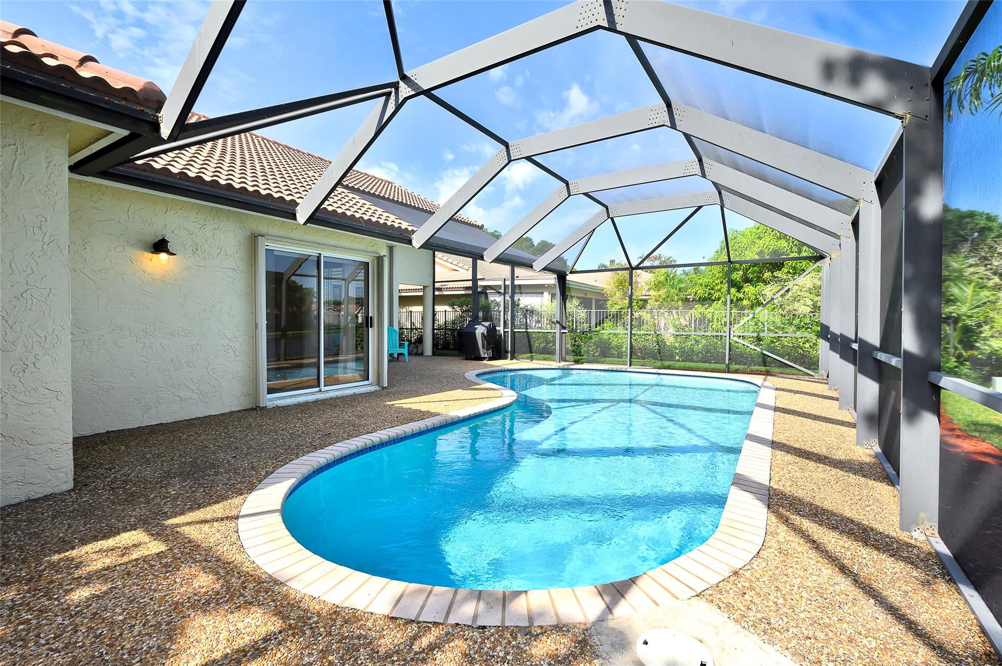 Welcome to this beautiful 4 bedroom 2.5 bathroom home in immaculate condition nestled on a spectacular private lakefront lot. Elegant and bright open layout with gorgeous neutral travertine floors throughout the living area. The formal dining room with French doors can be used as an office/playroom or converted into a 5th bedroom. Tastefully upgraded kitchen with granite countertop and newer stainless steel appliances and a new wine cooler. The spacious primary suite with his and hers walk-in closets. Fully remodeled bathrooms. Many features such as accordion shutters, garage door 2023, pool resurfaced 2023, A/C 2022, pool screen 2022, electrical panel 2021, roof 2007. Pool with Salt System. The screened pool and patio are perfect for your enjoyment and entertainment.