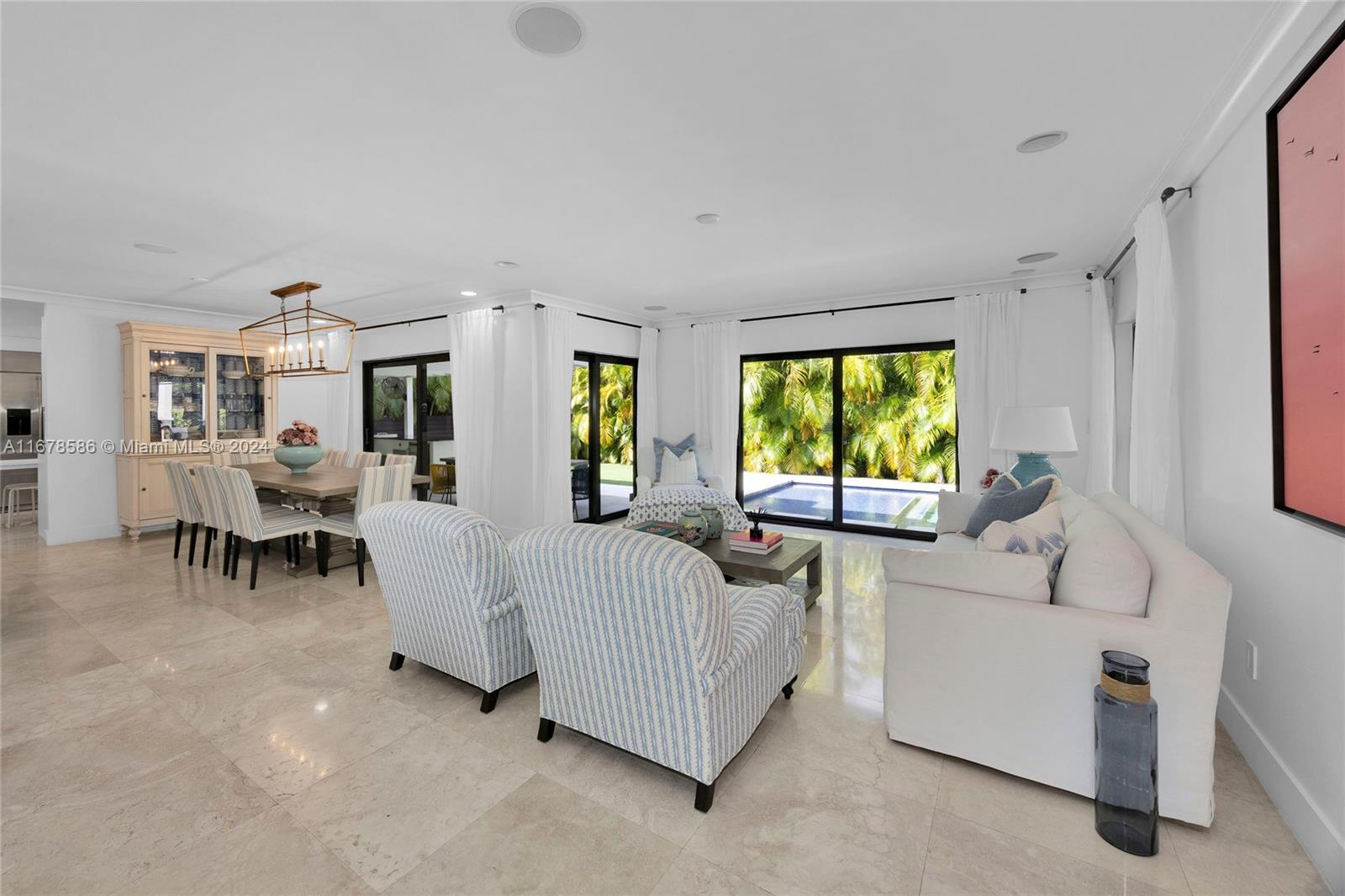 Located on a serene and private drive in South Coral Gables, this beautifully finished home features a large entertaining space with living, dining and family rooms connecting seamlessly to the covered patio w/ summer kitchen, all overlooking the expansive back yard that features an easy-turf lawn & stunning heated pool w/ sun ledge and led lighting. The home's primary suite features his/her closets, shower & dual vanities with exquisite finishes. The 4 add'l bedrooms share 2 full baths, add'l full bath has access to pool. Well appointed interior kitchen and summer kitchen has grill & stovetop for al-fresco cooking. Add'l features are laundry room, 2 car garage, security system, concrete driveway, impact glass, 2023 roof, new plumbing, 2022 a/c system. Minutes to Grove shops & schools.