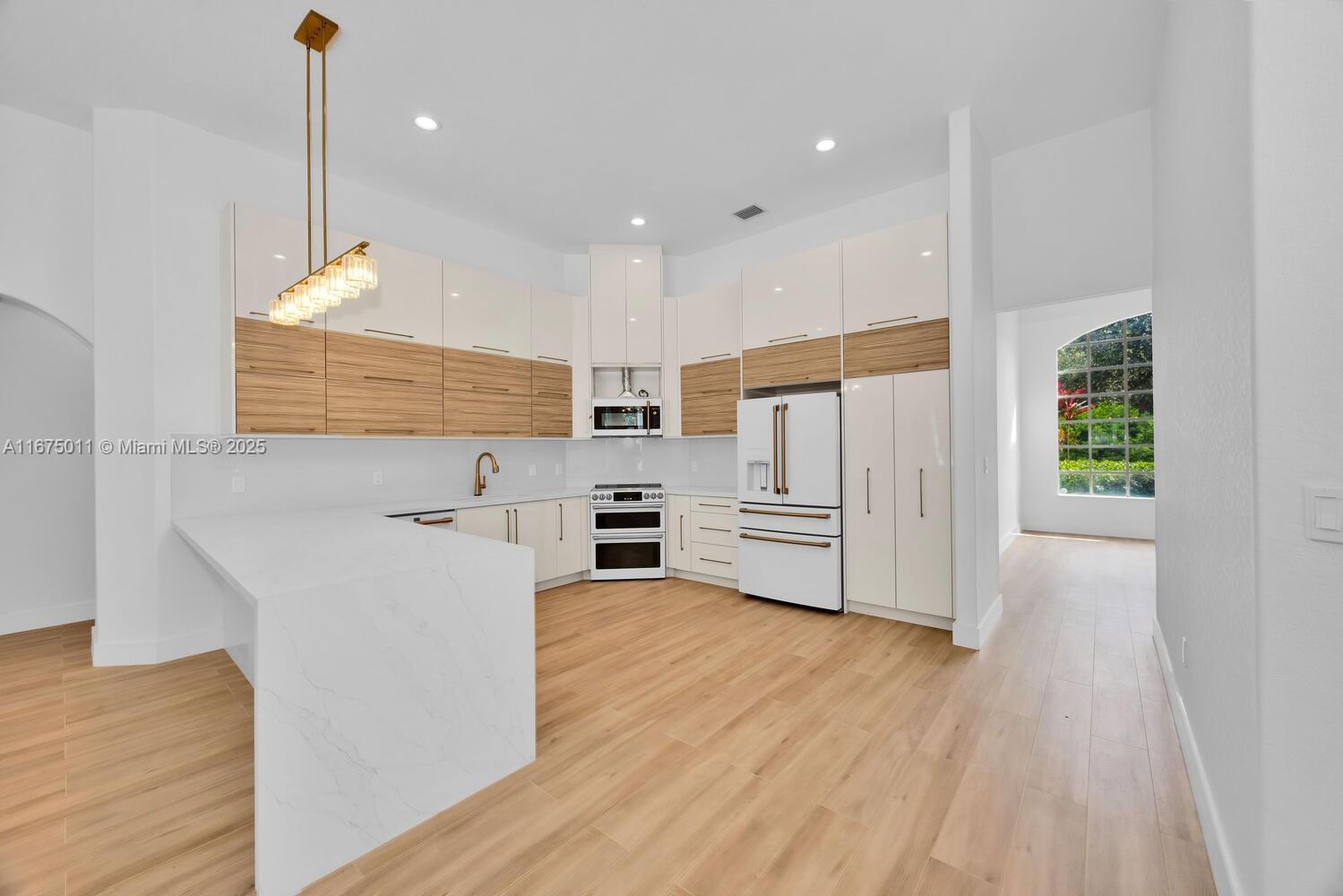 Beautifully renovated Palmetto Bay Executive Home situated in close-in location on gated lot. Ideal floor plan with Master Bedroom + Office and guest Bedroom + Full Bath on one side and Two bedrooms with Ensuite Baths and Powder room on other. Stunning details include porcelain tile floors, exquisite lighting throughout, Cook’s Kitchen with counter seating, top-of-the-line GE Profile appliances w/ a rose gold sheen, sleek designs and smart, leading-edge features. Formal living room, dining room and huge family room off the kitchen that opens to sparkling pool and patio. Loads of natural light! Indoor laundry room, two car garage, paved driveway and great fruit trees!