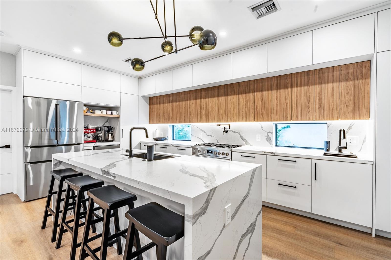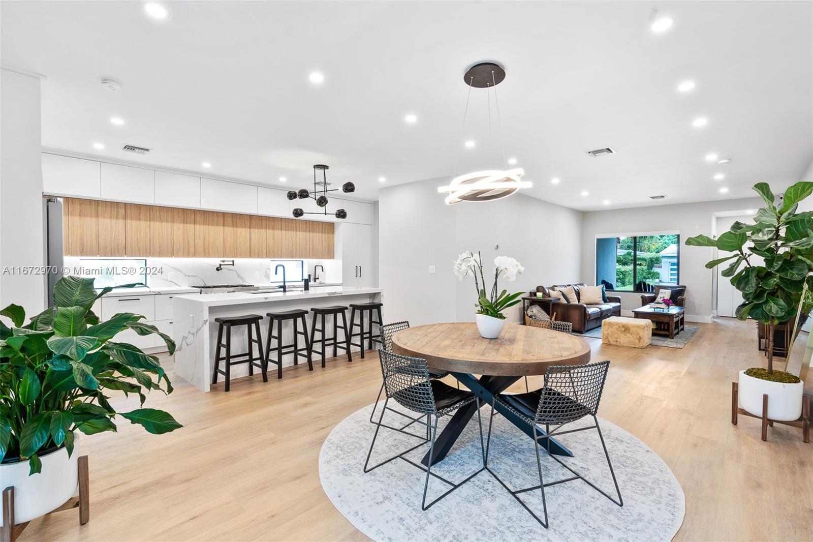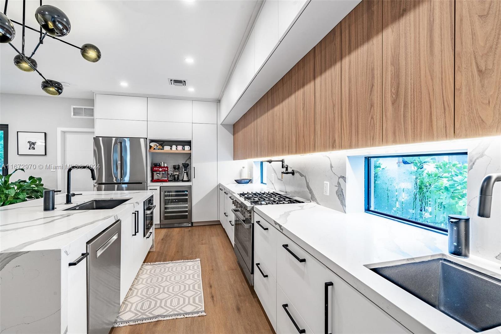 Move in ready! This stunning home, completely gut renovated last year, offers a spacious & open layout w/ 3 BR's & 4 BA's (Convert garage to 4th BR). The oversized living/dining areas provide a spacious setting for relaxation and entertainment. The gourmet kitchen is a chef's delight, featuring Bosch appliances, a 6-burner gas stove, 2 sinks, a wine cooler, & a convection oven & a huge island. Convenience is key with an LG W/D & brand-new plumbing & electrical systems. The primary BR is a serene retreat w/ electric shades & a spa like BR. Hi-End hurricane impact windows, outdoor cameras & hardwired internet connections ensure security & connectivity. The lush landscaping, sprinkler system & room for a pool(owner has plans) make outdoor enjoyment a breeze. Come see this gem today!