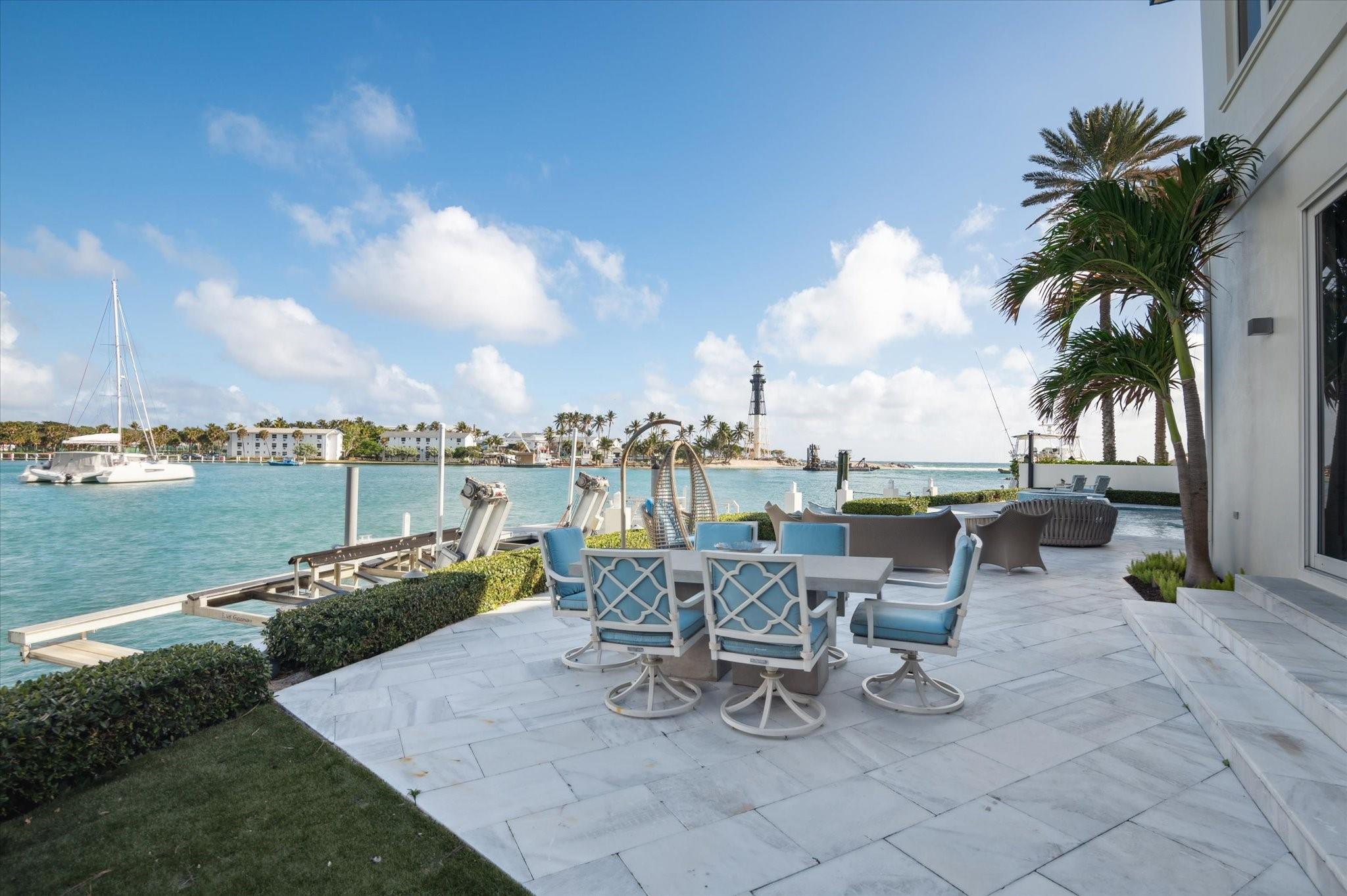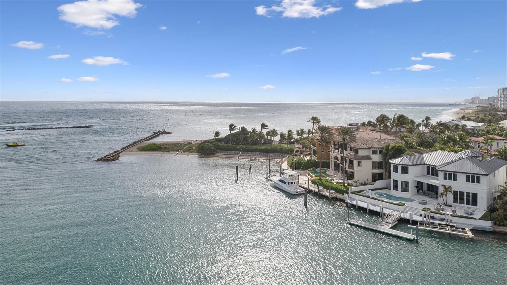 Enjoy luxury waterfront living in this stunning custom home, offering breathtaking views of the Hillsboro Inlet, the iconic & historic Hillsboro Lighthouse, and the Atlantic Ocean. Spanning 6,663 square feet, this exquisite residence features 5 bedrooms, 4.5 bathrooms, a functional office, a cozy loft, a wine cellar, and a charming craft room. Built in 1998 and remodeled in 2016, the home boasts an open floor plan with top-of-the-line appliances and finishes. The expansive outdoor area includes a pool and spa, perfect for entertaining with incredible views. Enjoy 100 feet of water frontage with cement and floating docks for up to three vessels, with a boat lift. Two garages can accommodate up to 5 vehicles. Modern living meets coastal elegance in this exceptional residence.