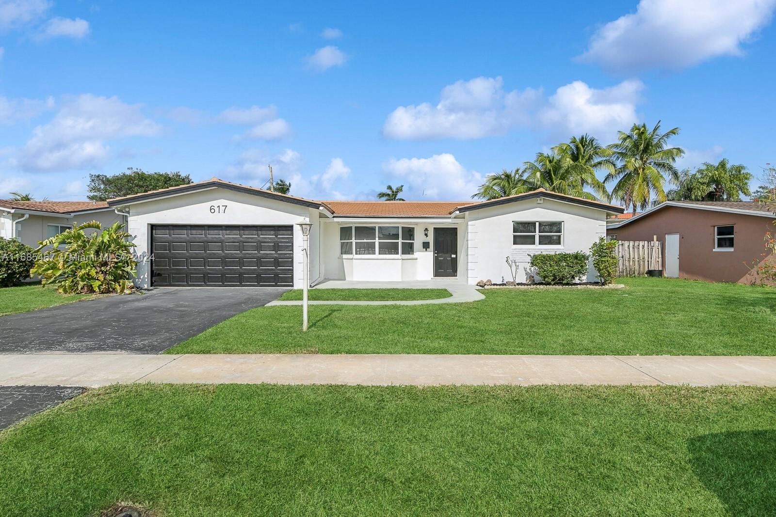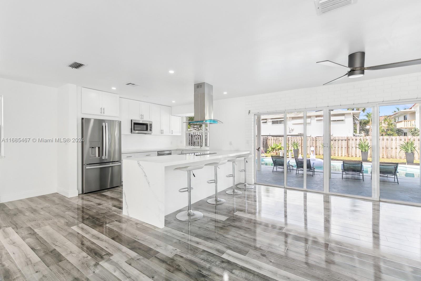 MAJOR PRICE IMPROVEMENT! Welcome to Paradise! This fully remodeled Hollywood Hills home offers prime luxury living. Highlights include recessed lighting, a stunning pool deck with European sculpted flooring, and a low-maintenance saltwater pool. Inside, enjoy new Australian piano-finish AC4 flooring, a 40-year tile roof, and impact windows and doors for security and efficiency. The open-concept kitchen features Calacatta quartz countertops, a 130" waterfall peninsula, and new stainless steel GE appliances. The updated two-car garage includes recessed lighting. The primary suite boasts an en suite bath and pool deck access. Bathrooms feature mood mirror lighting, a Jacuzzi tub, and Calacatta quartz vanities. Newer HVAC adds comfort. Your Hollywood Hills dream home awaits!